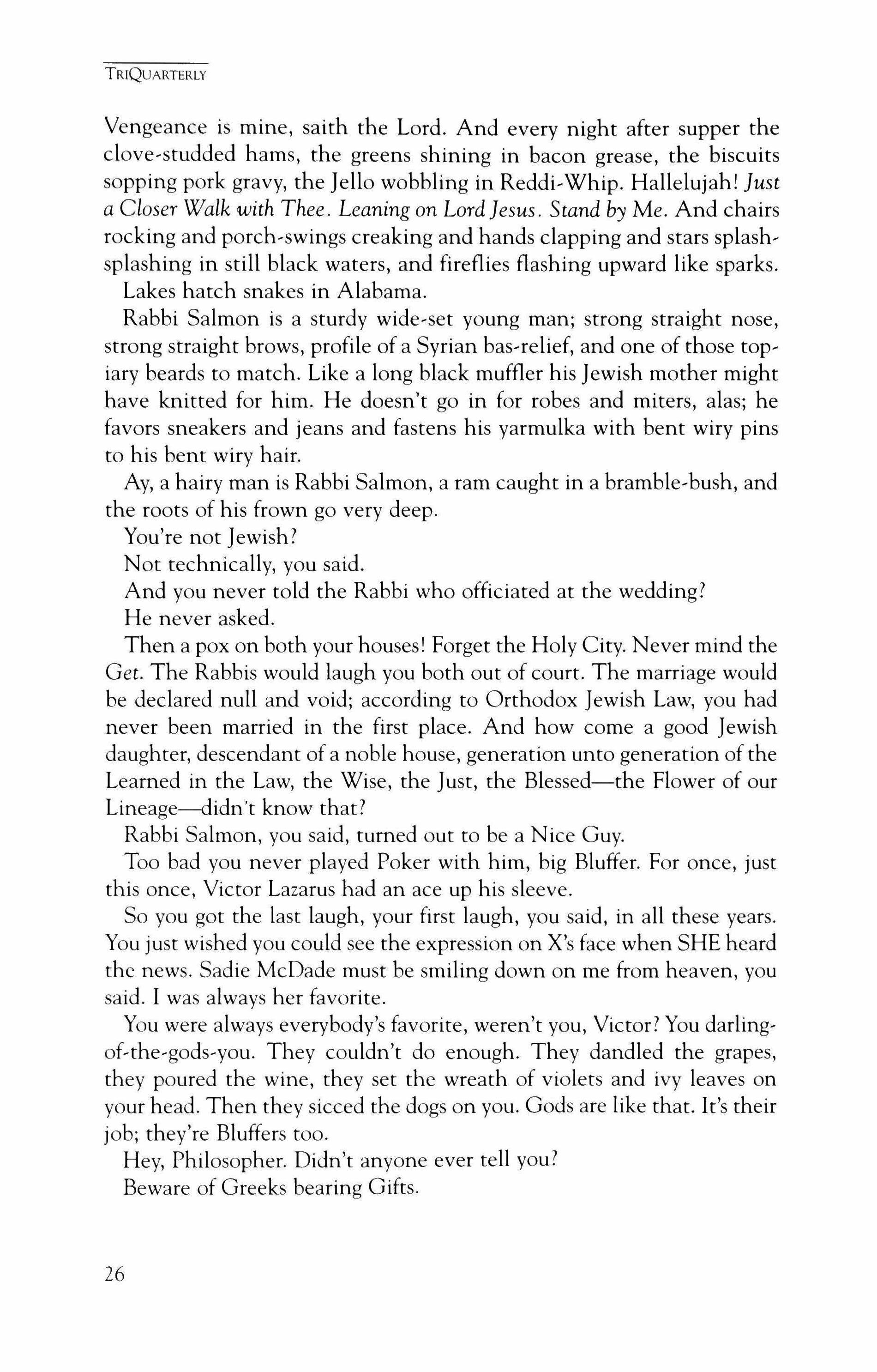Your grandmother-your mother's mother-was Mercedes (called Sadie) McDade, baptized in the Tombigbee River, which wends its way out of Mississippi down the length of western Alabama-Alabama, where the stars fall-and somewhere safe to sea. At sixteen she caught the eye of Benjamin Gottlieb, late of Warsaw, a successful businessman, lover of grand opera, Panama hats, and Havana cigars. Because of the difference in their ages and stations, he sent his bride-to-be to Finishing School. Ah, the Jewish romance with America! Nine children were born to this union before Benjamin Gottlieb collapsed one summer morning, shaking ripe gold from the pear tree; dead on the spot of a heart attack. The way you were expecting to go yourself, weren't you, Victor, and at just about your age. Goes to show how much we know. Sadie McDade, still a young woman, was to remain his faithful widow for fifty years. That was the Depression; soon came the War. At the Jewish Canteen, Belle Gottlieb-Belle of the Irish eyes and the Southern charm-met Victor Lazarus, a husky dark-browed airman stationed near Tuscaloosa. They fell in love and married, the way people do in wartime; desperate, as you said, for her to get pregnant. He was training to be a pilot; he would be flying bombing missions. They were in luck. Before he shipped overseas, your father-to-be and never-to-be spoke to his brother of the unborn child. If something happens to me, he said, take care of Victor. Something happened. So they named you, as we Jews do, after a dead relative. You became Victor Lazarus.