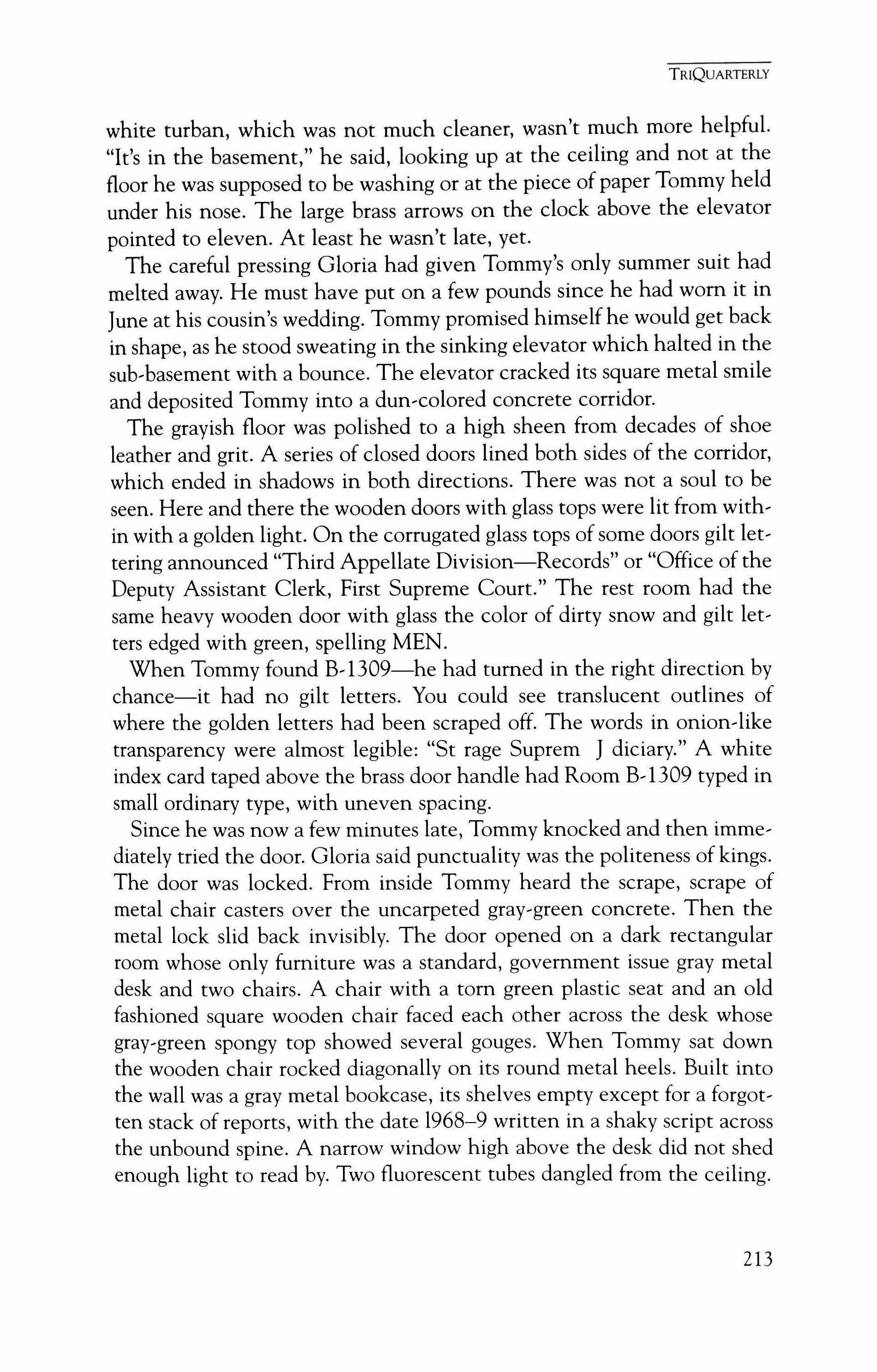 Tommy began to slip away from the office more often. Johnson had begun taking water and some food. Things were temporarily calm. If the rabbit man was not there, no one else cared what he did. When he was there the rabbit man didn't notice or comment upon his absences. Tommy would arrive first thing in the morning, make a couple of phone calls to register his presence, then disappear for four or five hours. He either sat in court, or went to the basement where he played checkers on a rippling black and red portable board with a guard who had worked there so long he could tell a supervisor's footstep half a corridor away, in plenty of time to roll up and stash the board, slip the checkers into his pants pockets, and light a cigarette. This guard had been at the prison for so long he knew how to get everything done. The other guards and even the inmates asked him for advice. "We're nothing but a cap and pair of pants to them," this guard was fond of saying. It wasn't clear whether "them" was the prisoners or the bosses, but Tommy found himself agreeing to both versions.