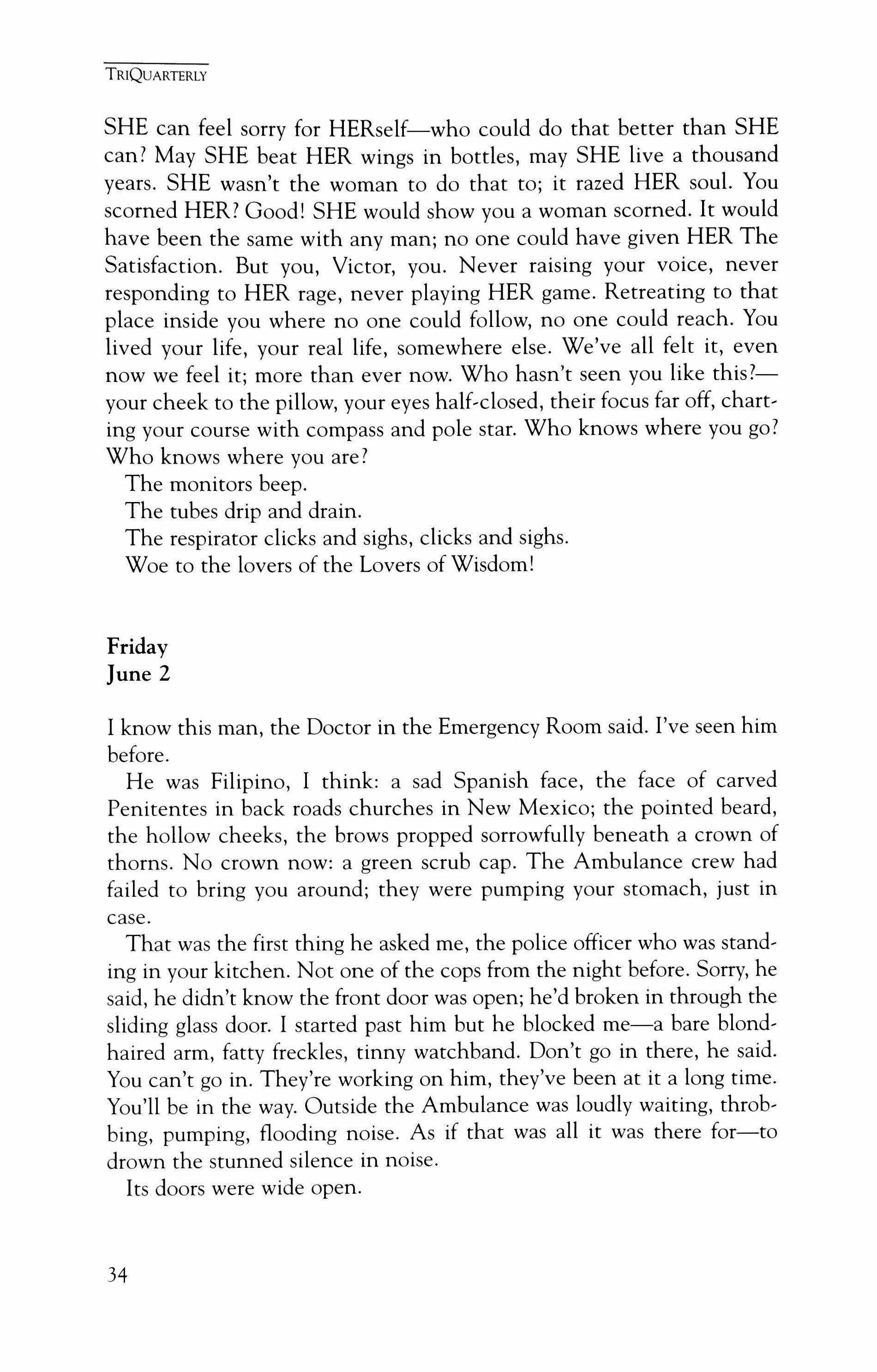 In the first place, Victor, you're not dead. Not technically. I don't know if you're interested in details; the usual scenario. You had a second mas, sive stroke early this morning, a young interne rushed to the rescue, jumped on your chest, and now you're hooked and wired to life supports. They're keeping you going until the rest of your family gets here, and your doctor comes back from a weekend vacation. Besides, we have Blue Laws in our valley; we can't buy beer or pull plugs on Sunday. And what's the big hurry? Does it matter now? You'll keep. You can die tomorrow.