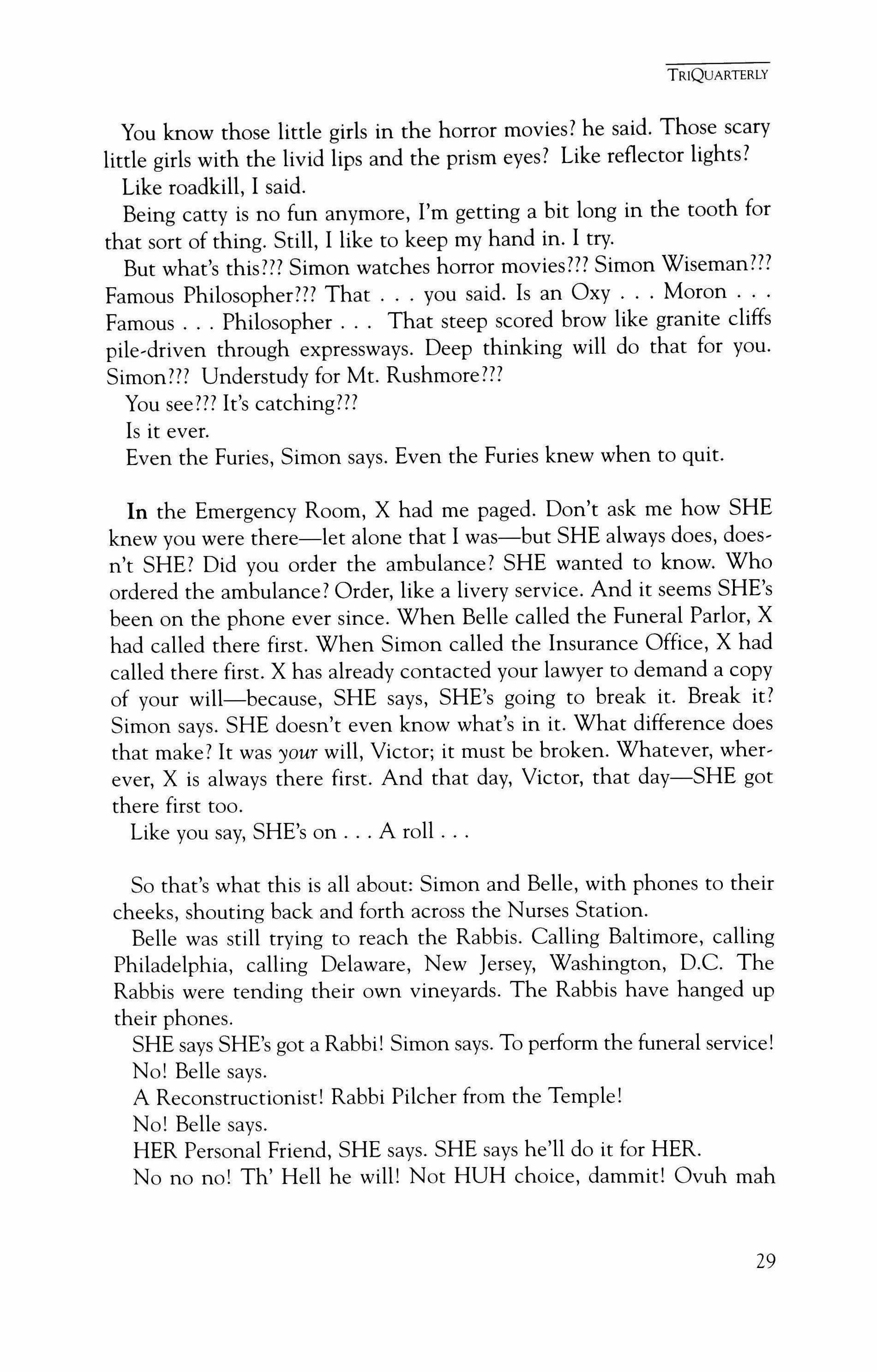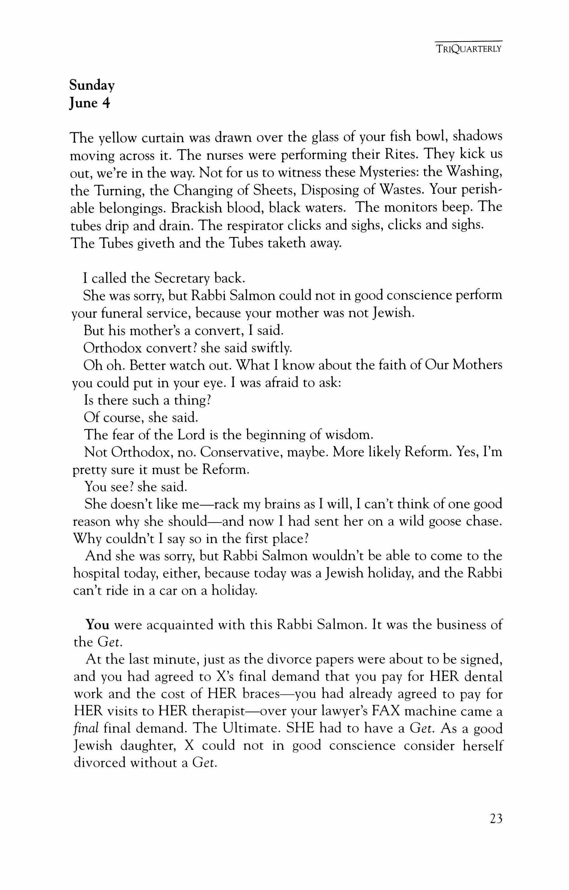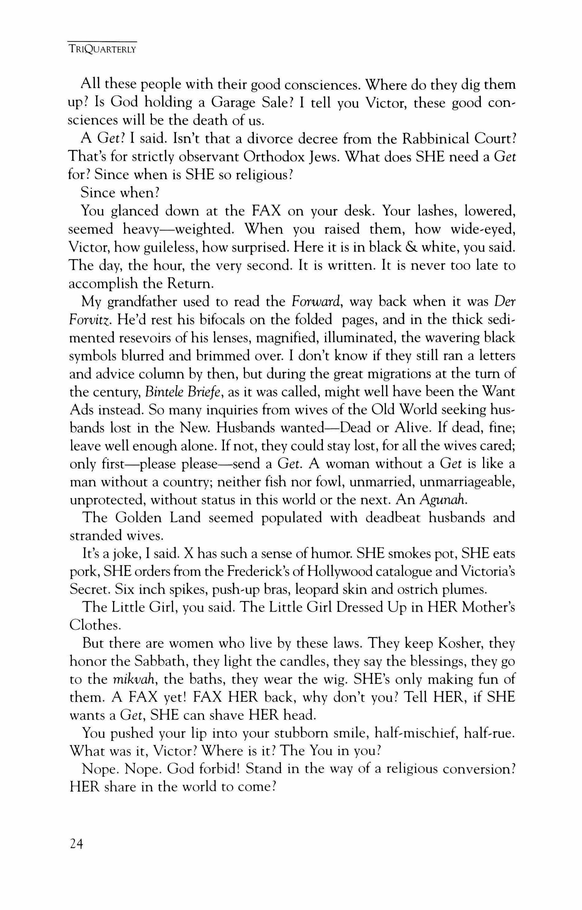 The young Rabbi steps forward, the books close to his chest. Very young, very slight; fragile, even. The narrow black suit. The narrow black beard. The black-black eyes in the white-white face. You know those intense Jewish organs. There are one and one half Rabbis in town now, and this Rabbi Pilcher here is the half, a Rabbinical student, pinch hitting at Temple, while they search for a successor to Rabbi Jim. Rabbi Jim. Remember him? The one who used to dress as Queen Esther on Purim and deliver his sermons in drag? Something about how there's nothing wrong with being a woman, we're really okay guys. You told me they were thinking of joining up with the Ethical Culture Society anyhow, tossing in the Tallith. Another of your jokes, Victor? You know I never could tell with you. Oh, I catch on eventually; I almost always catch on-eventually. Eventually isn't always soon enough.