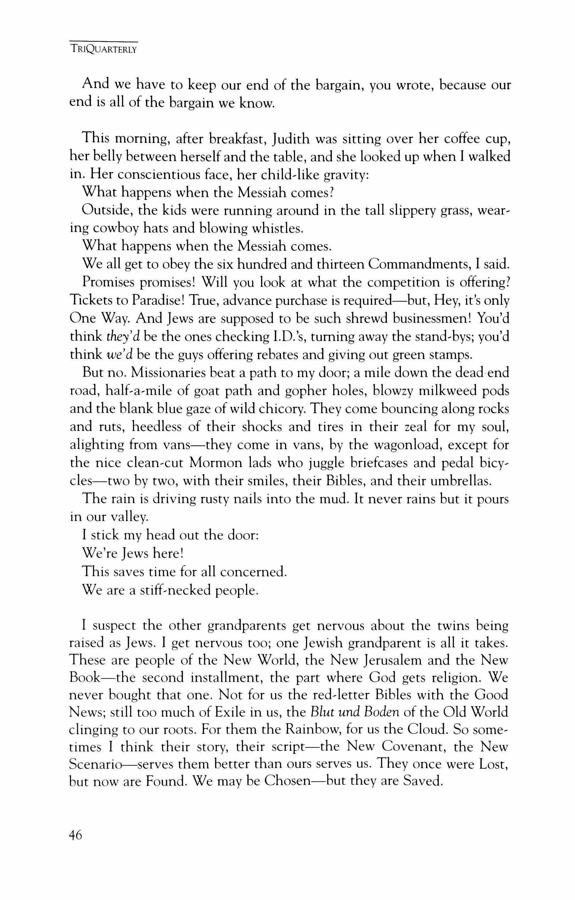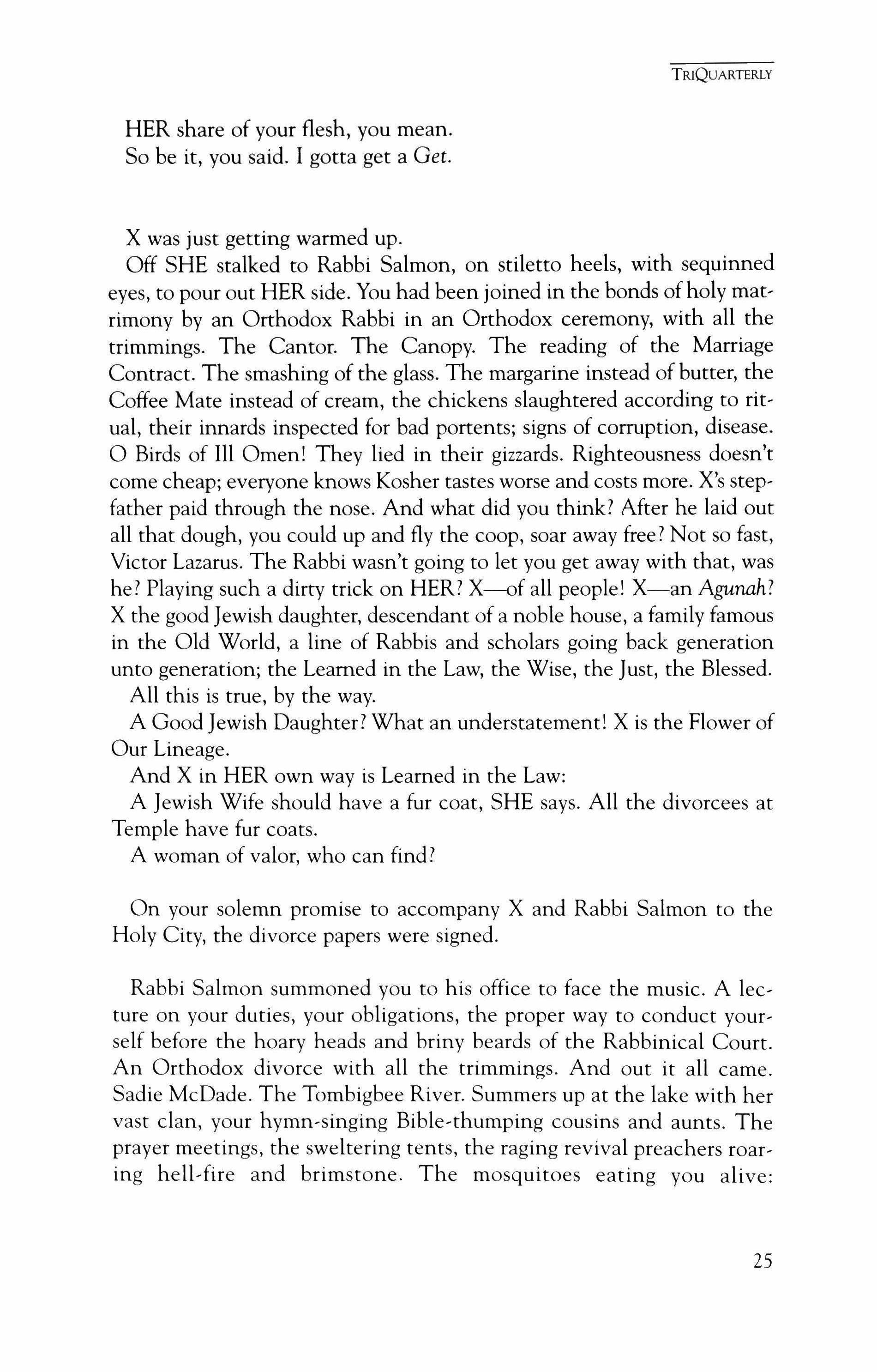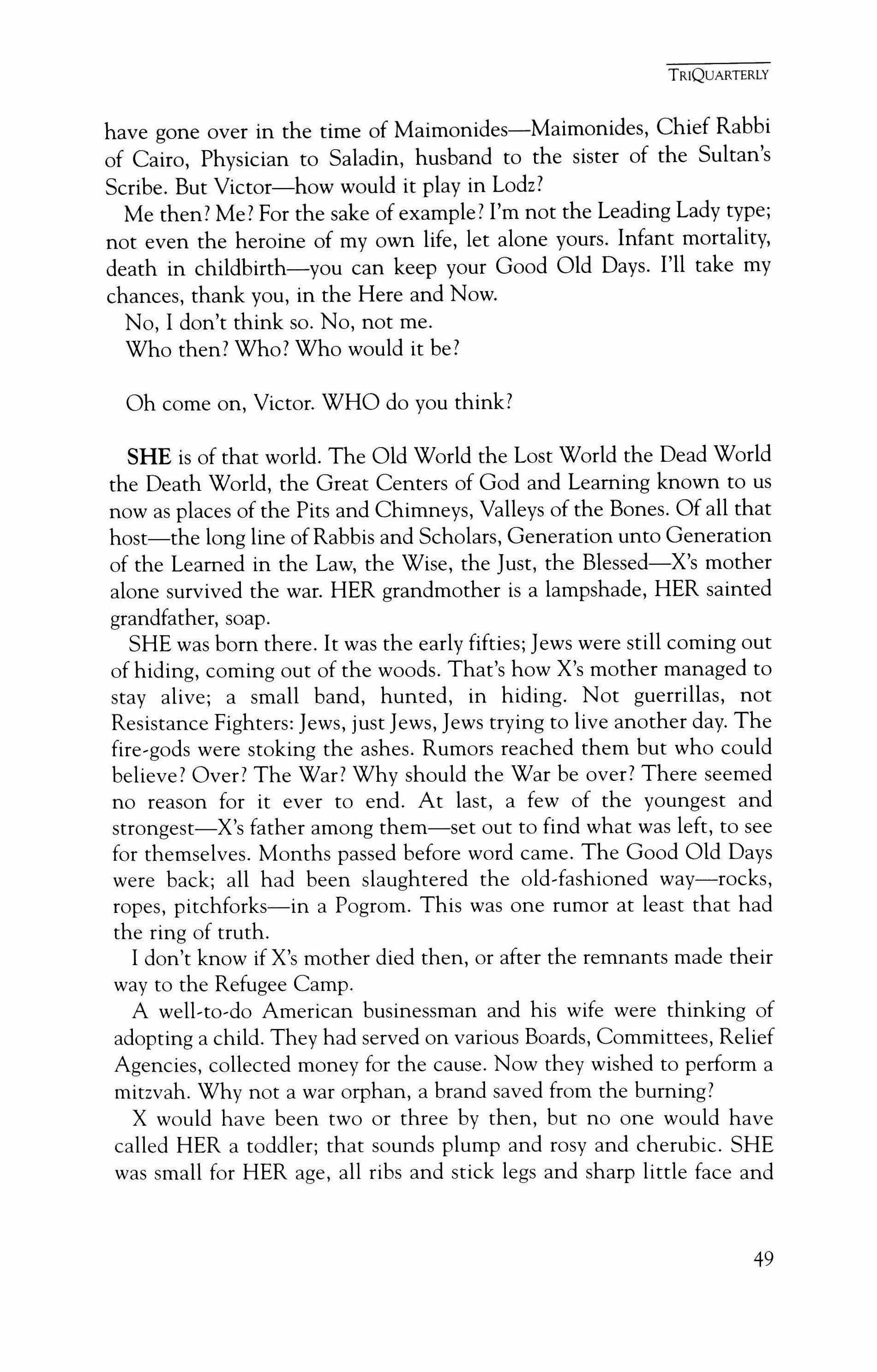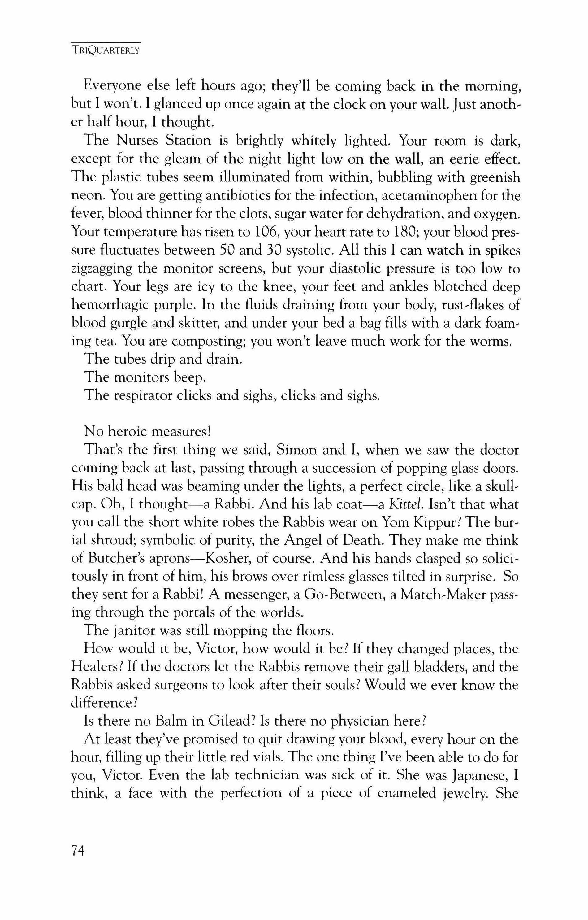 The young Rabbi steps forward, the books close to his chest. Very young, very slight; fragile, even. The narrow black suit. The narrow black beard. The black-black eyes in the white-white face. You know those intense Jewish organs. There are one and one half Rabbis in town now, and this Rabbi Pilcher here is the half, a Rabbinical student, pinch hitting at Temple, while they search for a successor to Rabbi Jim. Rabbi Jim. Remember him? The one who used to dress as Queen Esther on Purim and deliver his sermons in drag? Something about how there's nothing wrong with being a woman, we're really okay guys. You told me they were thinking of joining up with the Ethical Culture Society anyhow, tossing in the Tallith. Another of your jokes, Victor? You know I never could tell with you. Oh, I catch on eventually; I almost always catch on-eventually. Eventually isn't always soon enough.
