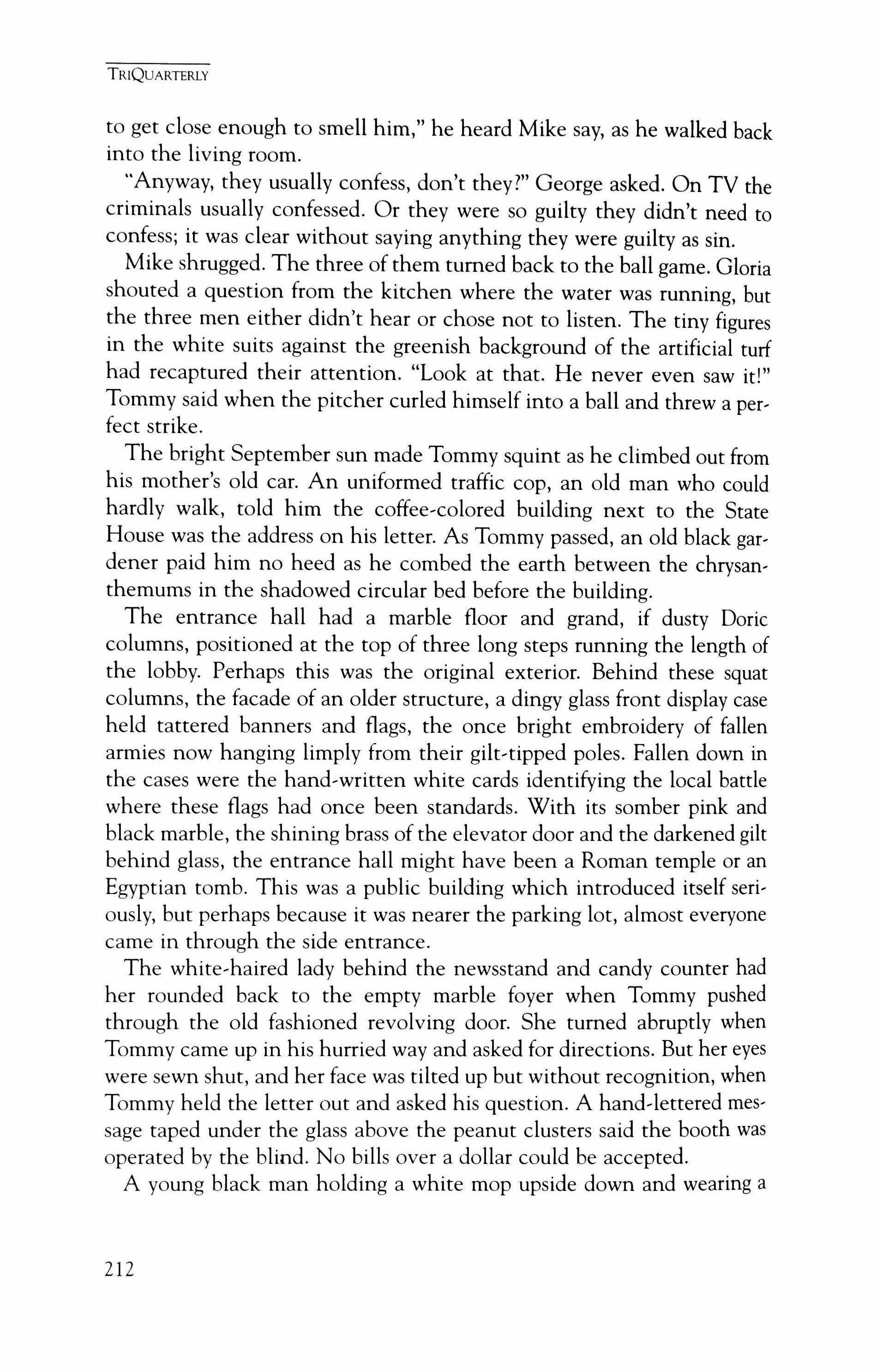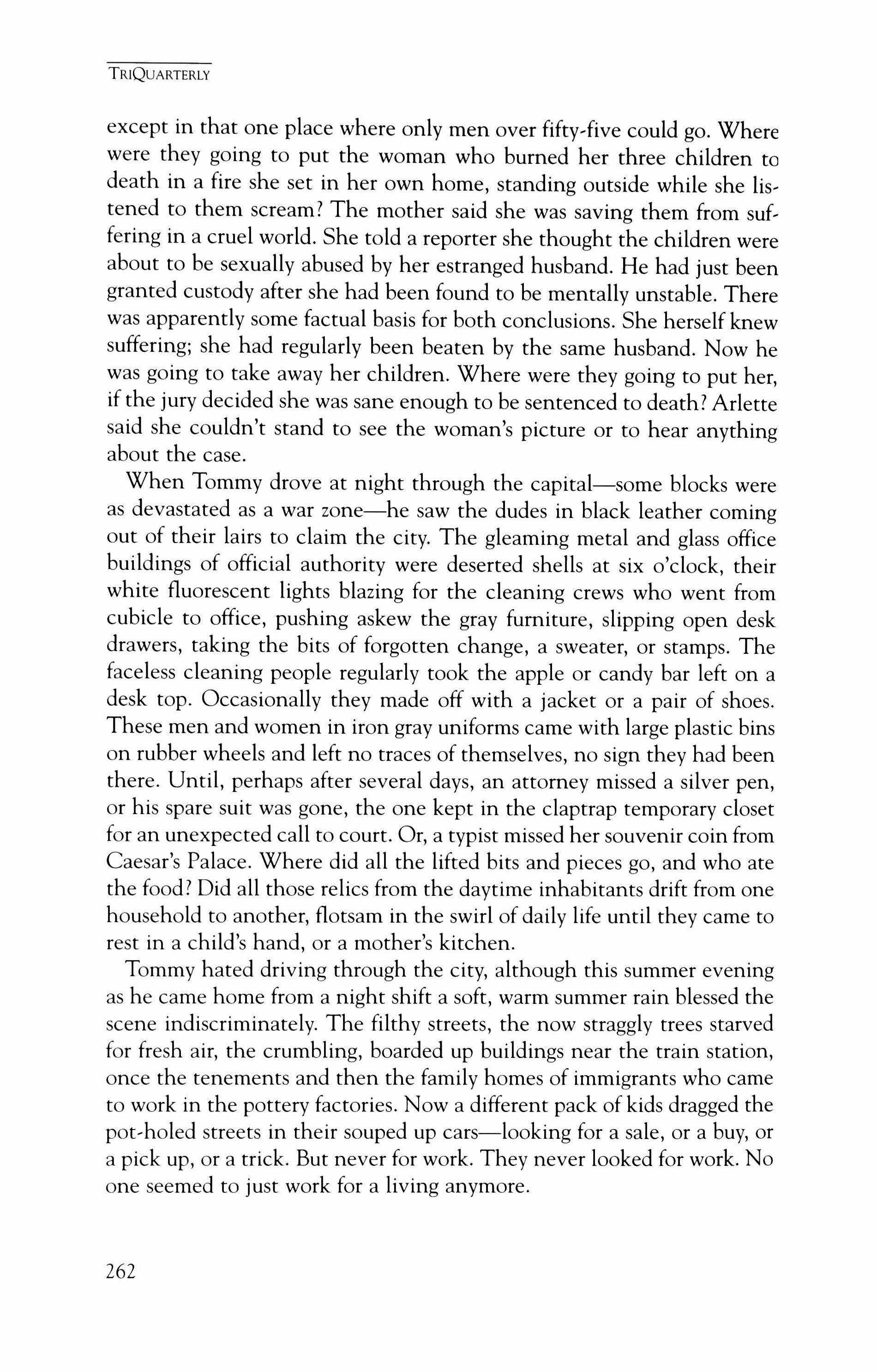 When Tommy drove at night through the capital-some blocks were as devastated as a war zone-he saw the dudes in black leather coming out of their lairs to claim the city. The gleaming metal and glass office buildings of official authority were deserted shells at six o'clock, their white fluorescent lights blazing for the cleaning crews who went from cubicle to office, pushing askew the gray furniture, slipping open desk drawers, taking the bits of forgotten change, a sweater, or stamps. The faceless cleaning people regularly took the apple or candy bar left on a desk top. Occasionally they made off with a jacket or a pair of shoes. These men and women in iron gray uniforms came with large plastic bins on rubber wheels and left no traces of themselves, no sign they had been there. Until, perhaps after several days, an attorney missed a silver pen, or his spare suit was gone, the one kept in the claptrap temporary closet for an unexpected call to court. Or, a typist missed her souvenir coin from Caesar's Palace. Where did all the lifted bits and pieces go, and who ate the food? Did all those relics from the daytime inhabitants drift from one household to another, flotsam in the swirl of daily life until they came to rest in a child's hand, or a mother's kitchen.