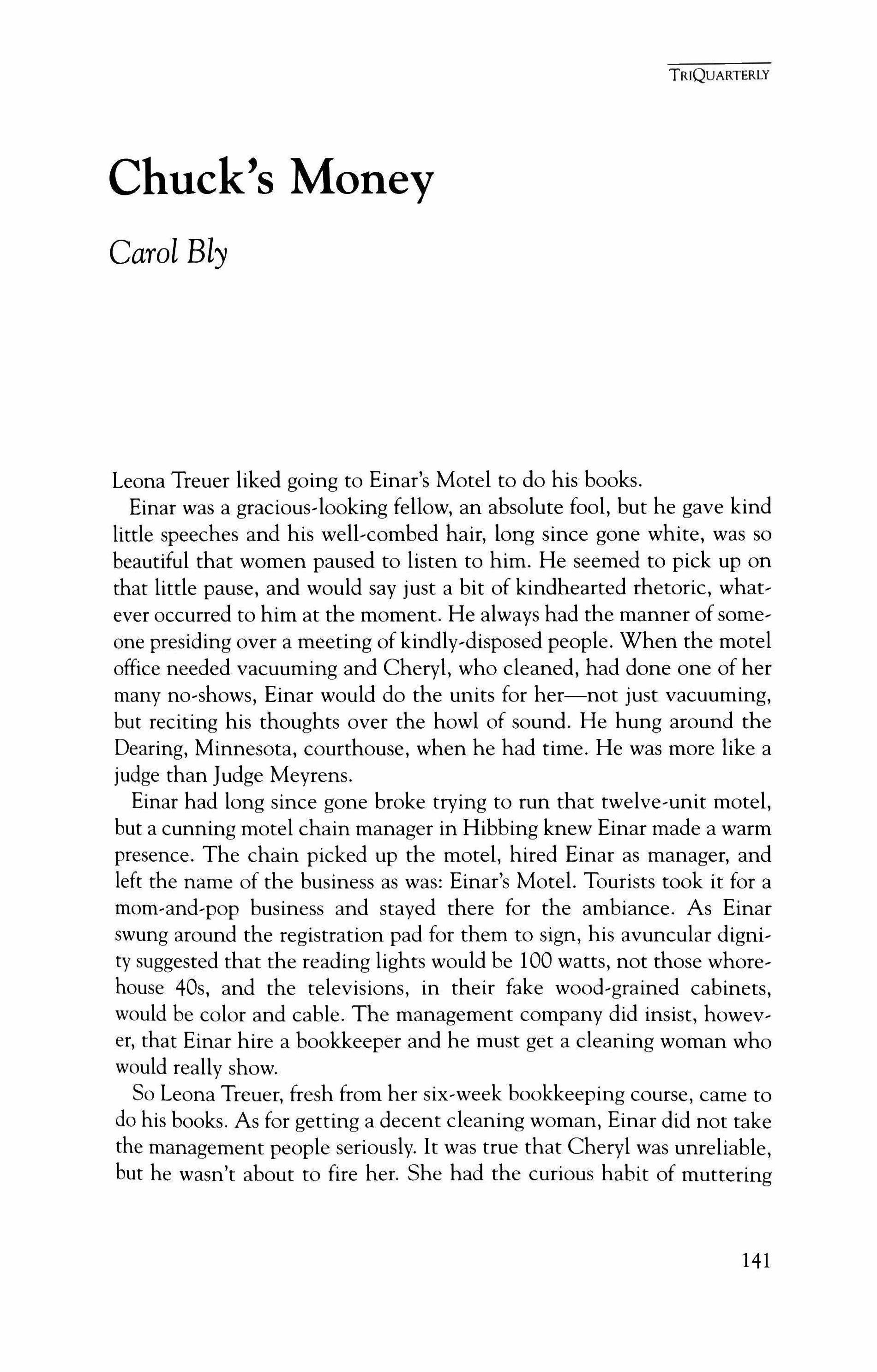 *** Leigh Buchanan Bienen is a writer, lawyer, and teacher of law, currently at Northwestern School of Law in Chicago. She is the author of Crimes of the Century: From Leopold and Loeb to 0.]. Simpson (Northeastern University Press, 1998) with Gilbert Geis. *** Carol Bly's most recent book is Changing the Bully Who Rules the World (Milkweed Press, 1996). Forthcoming are new editions of Letters from the Country (Univertsity of Minnesota Press) and My Lord Bag of Rice: New and Selected Stories (Milkweed Press). She is the 1998,99 Edelstein-Keller Author of Distinction at the University of Minnesota. *** Maxine Chernoff is the author of four works of fiction. Her novel American Heaven (Coffehouse Press, 1996) was runner-up for the Bay Area Book Reviewers Award in fiction. Her book of short stories Signs of Devotion was a New York Times notable book of 1993. Thaw will be published by Crown this fall. She is chair of Creative Writing at San Fransisco University and edits, with Paul Hoover, New American Writing. *** Bette Howland is at work on a novel and essays on American writers. "Calm Sea" is from a collection of novellas. She lives in Michigan. *** Maria Tomasula's most recent exhibitions include one-person shows at the Indianapolis Museum of Art and Chicago's Mexican Fine Arts Museum. She teaches at the University of Notre Dame.