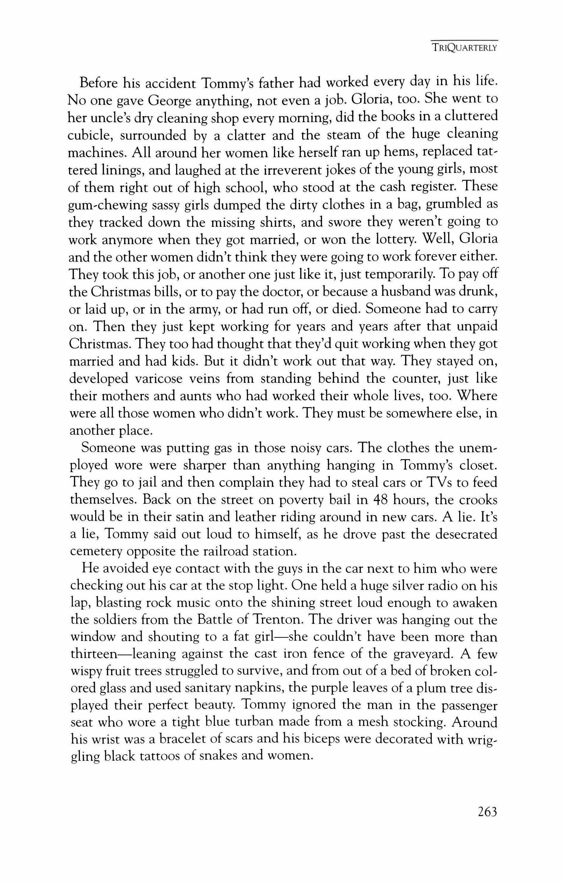 He avoided eye contact with the guys in the car next to him who were checking out his car at the stop light. One held a huge silver radio on his lap, blasting rock music onto the shining street loud enough to awaken the soldiers from the Battle of Trenton. The driver was hanging out the window and shouting to a fat girl-she couldn't have been more than thirteen-leaning against the cast iron fence of the graveyard. A few wispy fruit trees struggled to survive, and from out of a bed of broken colored glass and used sanitary napkins, the purple leaves of a plum tree displayed their perfect beauty. Tommy ignored the man in the passenger seat who wore a tight blue turban made from a mesh stocking. Around his wrist was a bracelet of scars and his biceps were decorated with wriggling black tattoos of snakes and women.