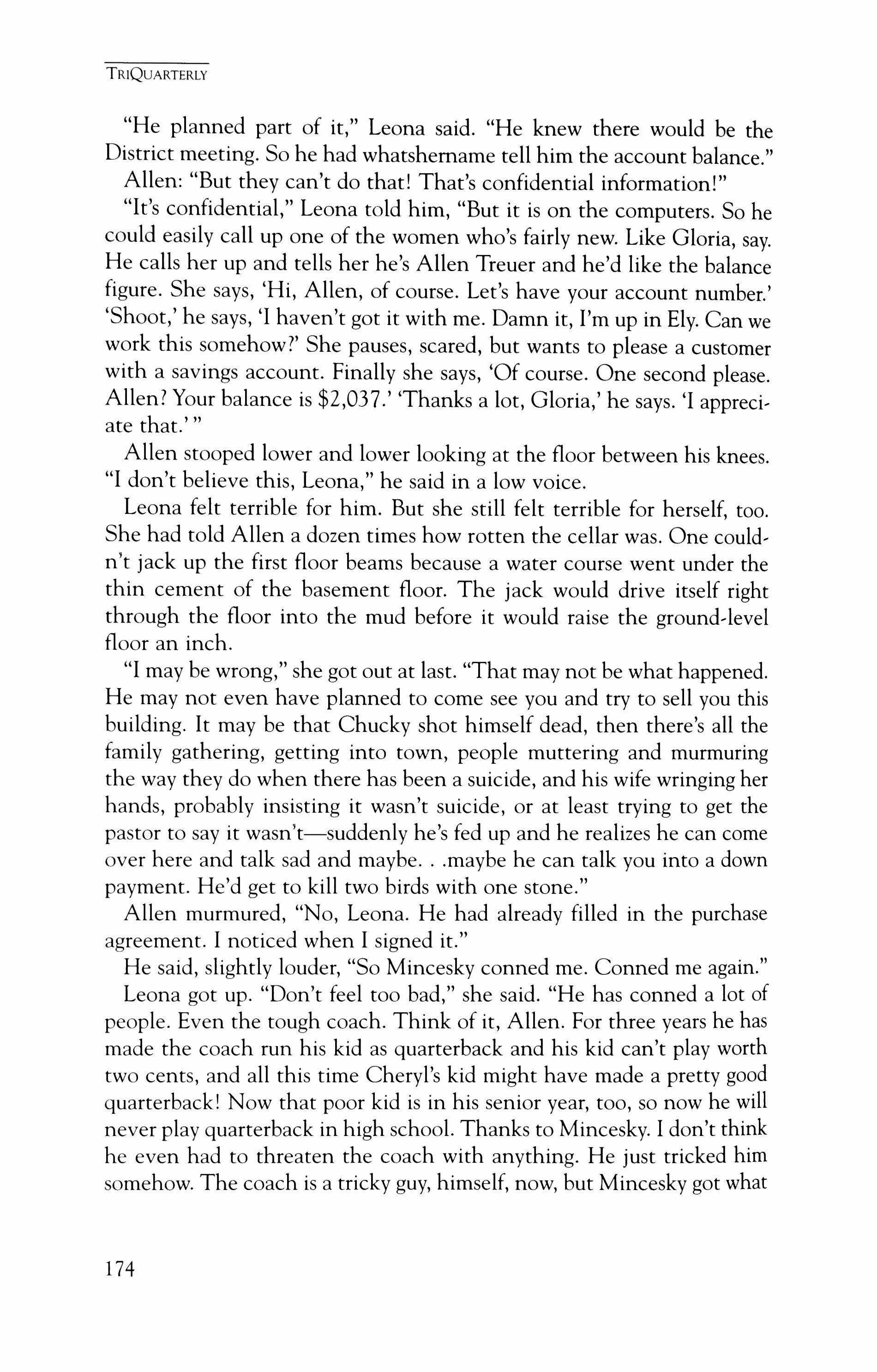 At last when he and Gloria had returned from vacation, George had gone back to work. Or it seemed he had gone back to work. The bank as an act of charity assigned him an inside job where he was required to do nothing but sit in the basement and watch a flickering row of television monitors. He just had to sit in front of the gray screens all day. But even though the task was simple, or really no task at all, George often seemed confused. He claimed he couldn't watch all twelve screens at once, although they showed only four or five different locations within the bank. He had difficulty recognizing individual faces on the blurry black and white screen. He couldn't tell the authorized employees from intruders. Several times he set off the alarm system unadvisedly, calling in the security people to apprehend a clerk, or a vault custodian, who was walking quickly and appeared to George to be making a getaway. Twice he called security on the same young black trainee who, George claimed, was skulking out of the basement with his jacket on, when the employee was just going home. Gloria told Tommy she was afraid he'd never be himself again.