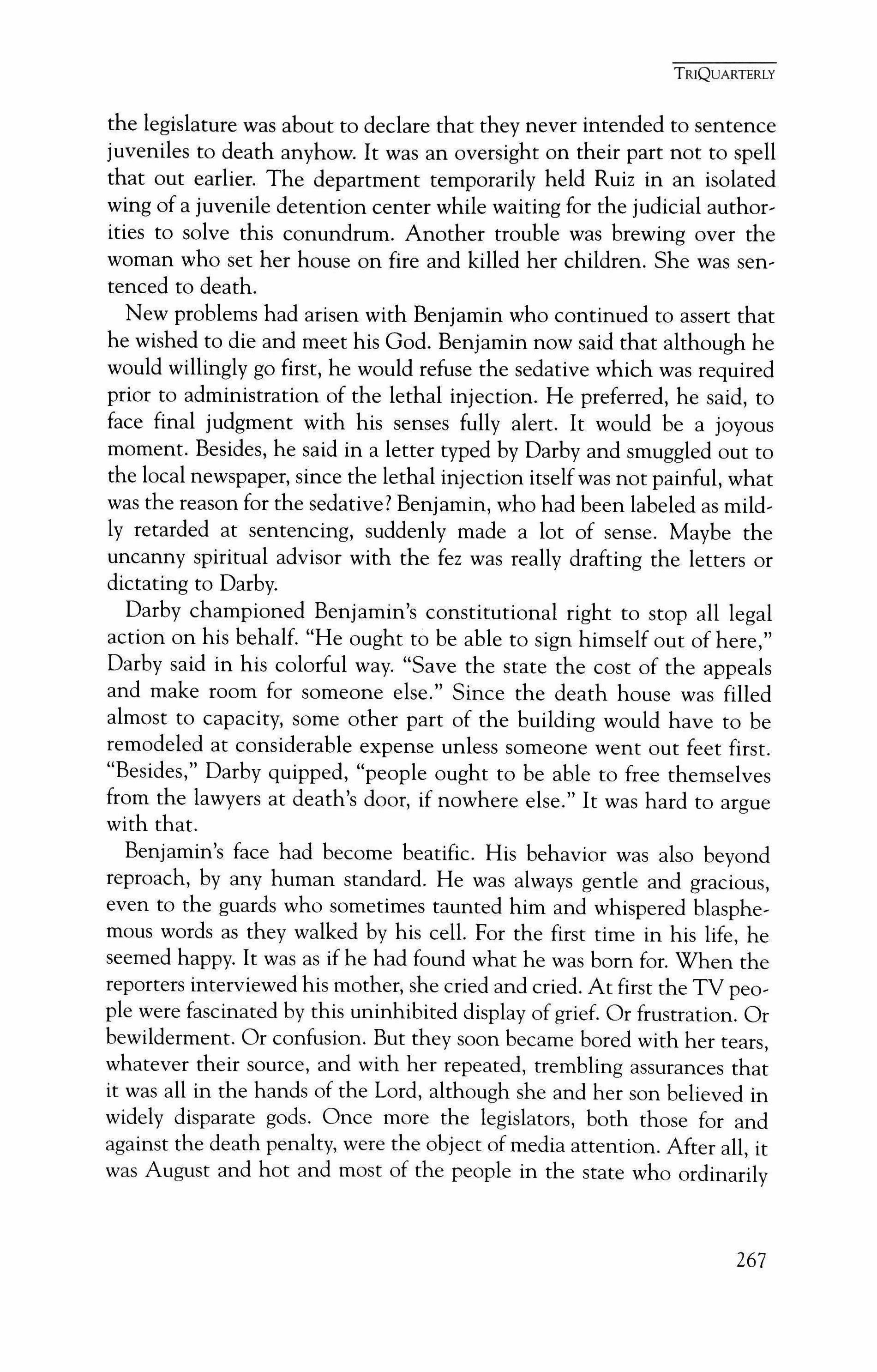 New problems had arisen with Benjamin who continued to assert that he wished to die and meet his God. Benjamin now said that although he would willingly go first, he would refuse the sedative which was required prior to administration of the lethal injection. He preferred, he said, to face final judgment with his senses fully alert. It would be a joyous moment. Besides, he said in a letter typed by Darby and smuggled out to the local newspaper, since the lethal injection itself was not painful, what was the reason for the sedative? Benjamin, who had been labeled as mildly retarded at sentencing, suddenly made a lot of sense. Maybe the uncanny spiritual advisor with the fez was really drafting the letters or dictating to Darby.