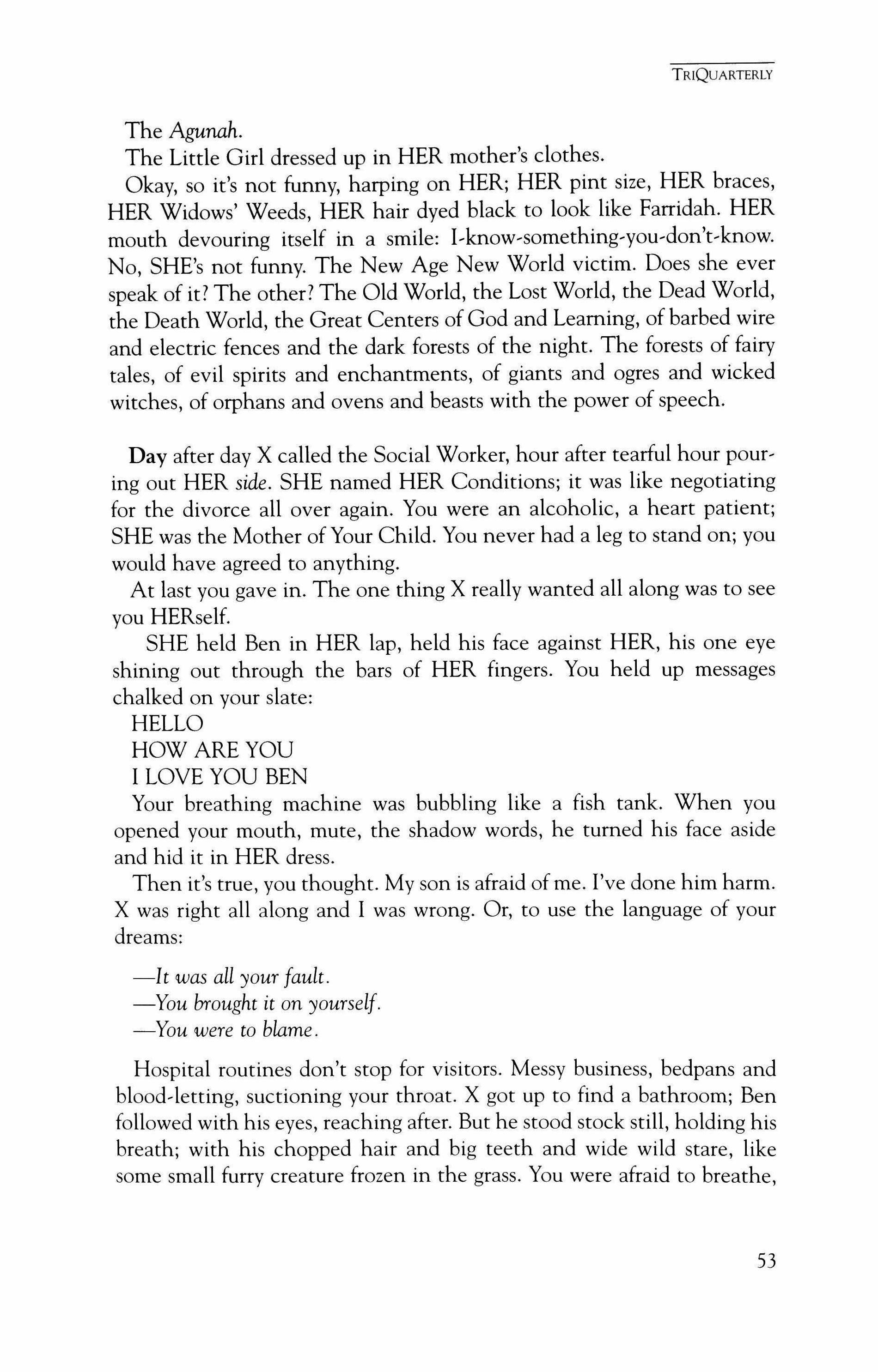 Aww, come on. What gives? You've seen this woman, haven't you? Big friendly bust, big round glasses, the kind of frizzed orange hair that looks as if it just caught fire. The motherly type; a gusher. So what's with the snotty stuff? Am I fixing to slap a paternity suit on the Rabbi? out to repossess his car? All these months, the doctors, the hospitals, the Social Workers-O the Social Workers! The road to hell, you said, is paved with Social Workers-and I'm still not used to it. Always the Collection Agency. Always the Adversary.