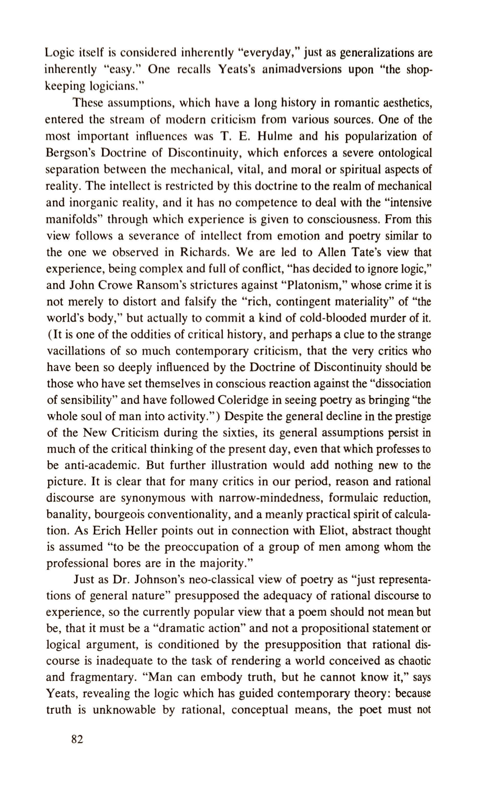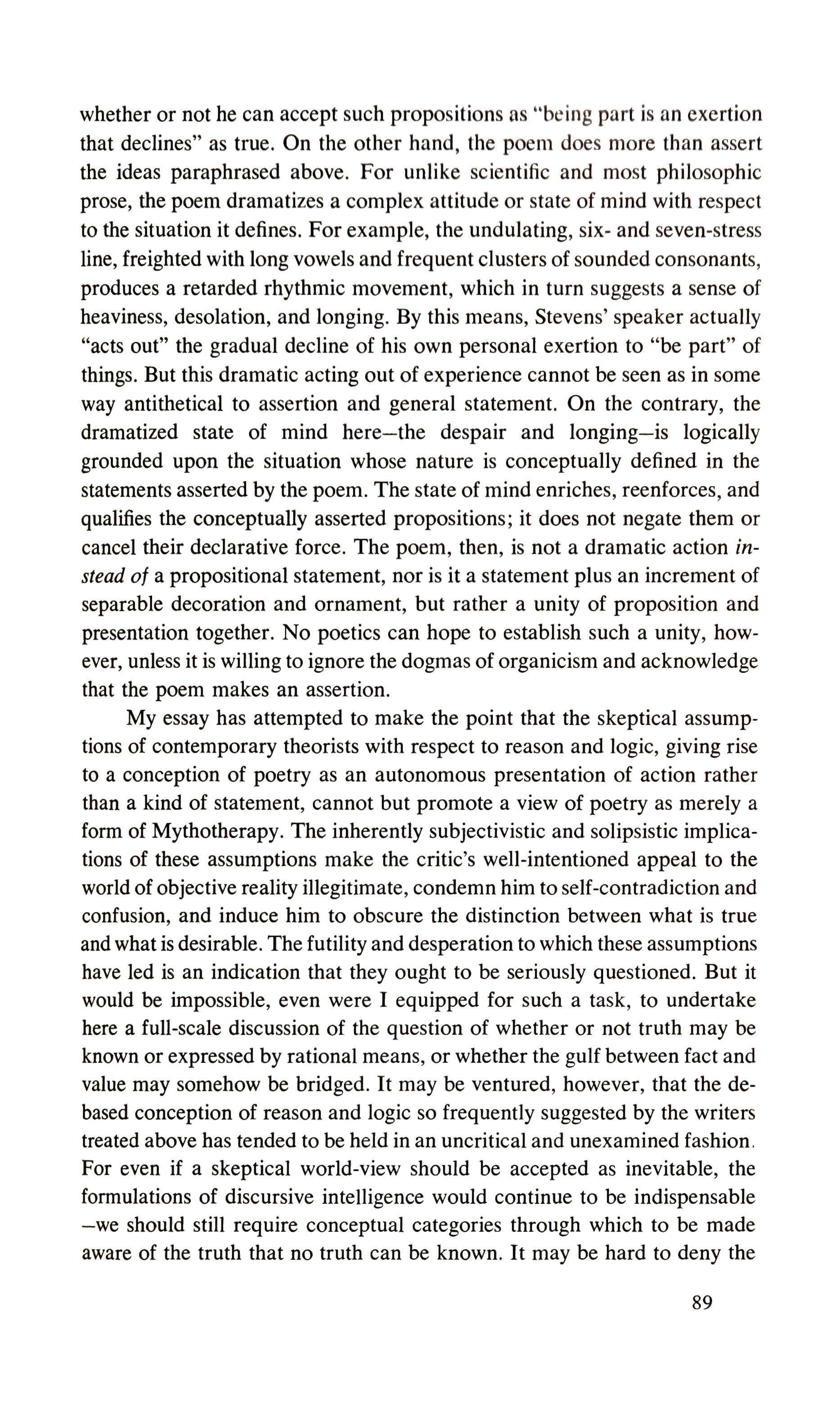 One of the difficulties of contemporary poetry is that it has partly in response to Nietzsche's complaint, 'The poets lie too much,' abandoned too completely the traditional structural resources of the art, without considering the extent to which this might mean abandoning also some of poetry's traditional, and partly hidden, functions. The formal elements were abandoned because they had come to seem a wall erected between the poet and the immediacy of experience, with its raw truth and force. Under the influence of Williams and of half-a-Pound (his preaching more than his practice), one main body of contemporary poetry has adopted a metric which, among other reductions, seeks the rhythmic patterns closest to the rhythms of contemporary speech; although this ambition is not only difficult to achieve, it is difficult to give content. It is a metric which stakes much, almost everything, on capturing, by delicacy and precision of statement, states of