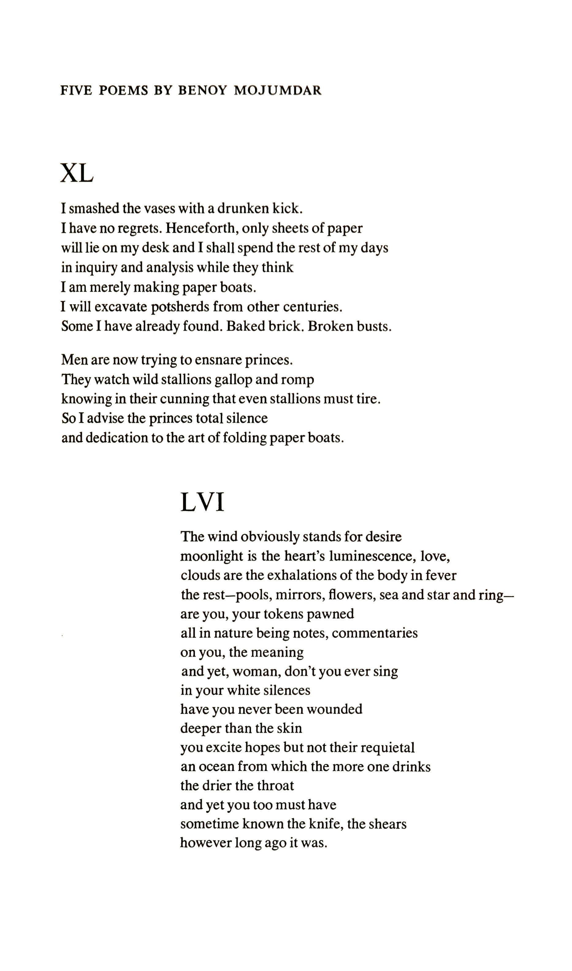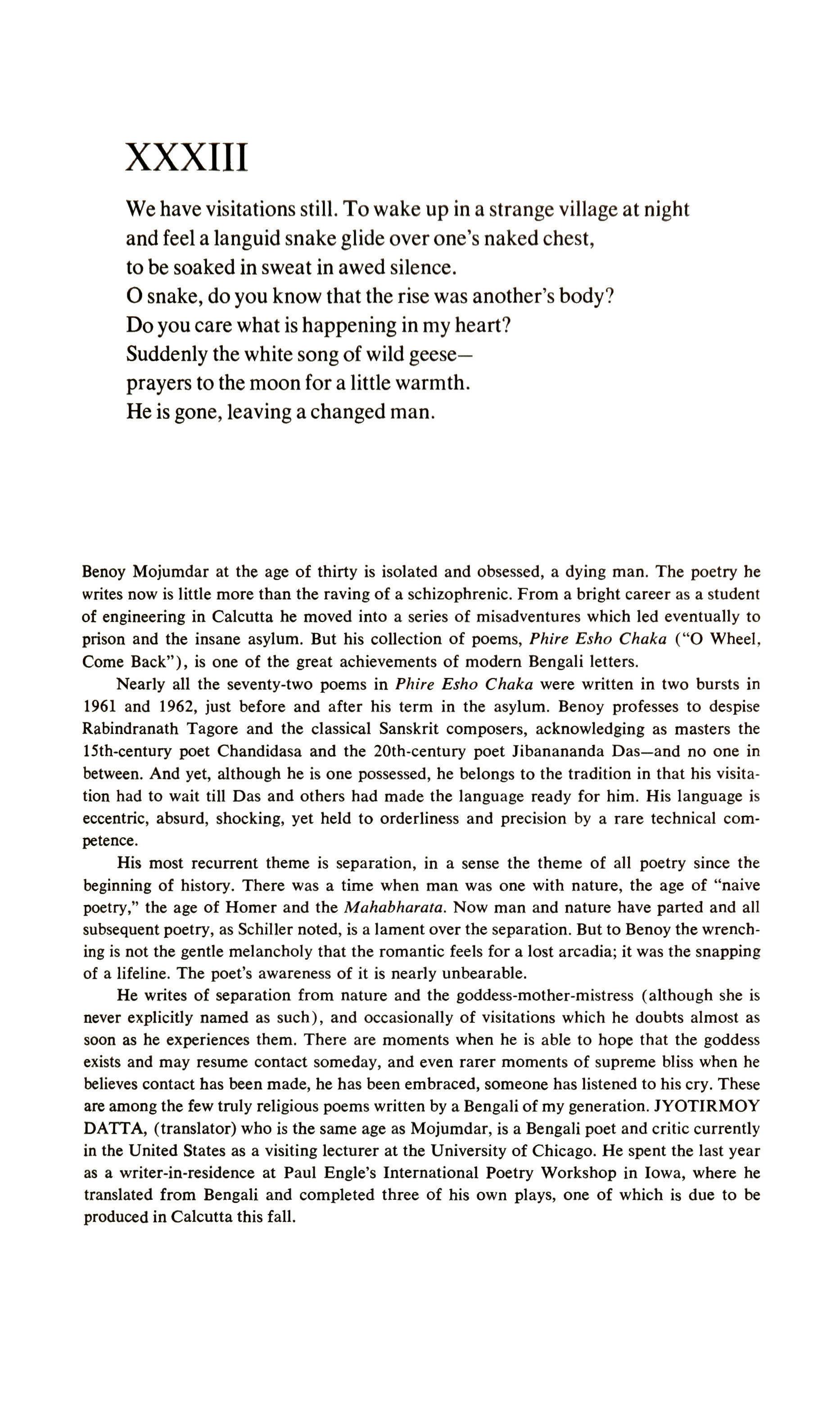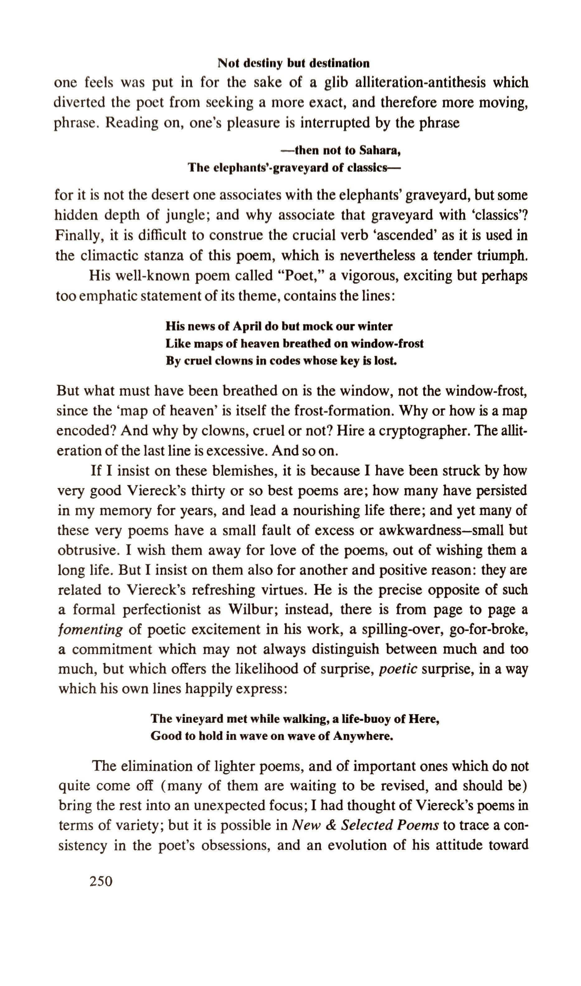 Not destiny but destination one feels was put in for the sake of a glib alliteration-antithesis which diverted the poet from seeking a more exact, and therefore more moving, phrase. Reading on, one's pleasure is interrupted by the phrase -then not to Sahara, The elcpllants'.graveyard of classlcss-for it is not the desert one associates with the elephants' graveyard, but some hidden depth of jungle; and why associate that graveyard with 'classics'? Finally, it is difficult to construe the crucial verb 'ascended' as it is used in the climactic stanza of this poem, which is nevertheless a tender triumph. His well-known poem called "Poet," a vigorous, exciting but perhaps too emphatic statement of its theme, contains the lines: