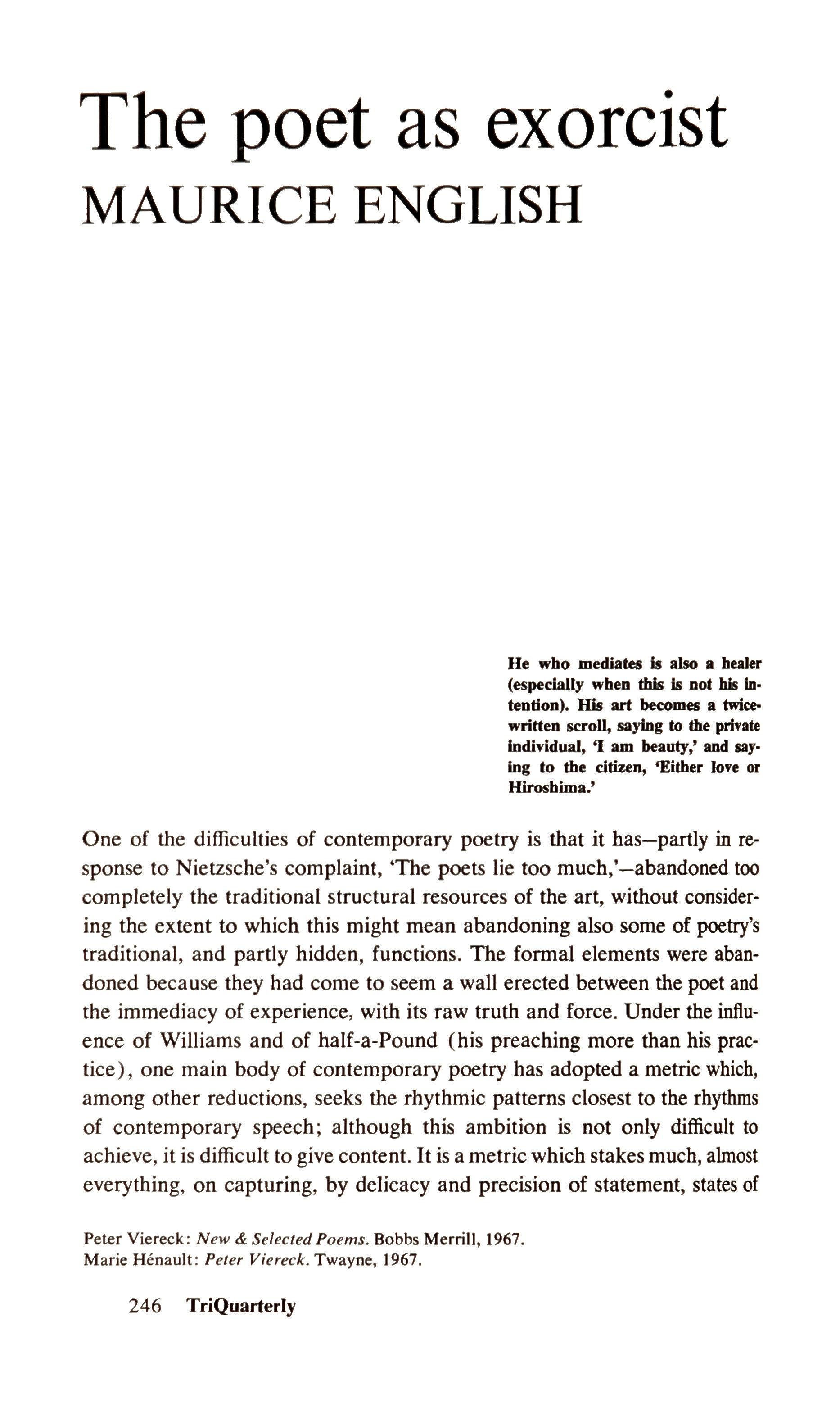 Meanwhile, we have the lyrical achievement displayed in New & Selected Poems,' and one can say of it what can be said only about genuine poetry, poetry built to last: it is a consistent, serious attempt to assert the dignity of man, while excluding as little of the raw truth of man's condition, as possible. (That poetry necessarily excludes much of that truth is the sad validation of the complaint by Nietzsche with which this review began). Viereck is the author of a body of verse that is fundamentally, though not in a simple sense, and not exclusively, social; since he has a poet's intuition as well as a poet's ear, it is often prophetic poetry; and since this is the twentieth century, the prophecy is a tragic one. At its best, it is expressed in rhythms whose resonance of feeling and sound have the force of a kind of exorcism, in the sense I have explained a sense which is akin to the feelingpeople have that there is a relation between poetry and prayer. No exorcism, poet's or priest's, will save us from any external doom; but it can modestly bless us with a certain intuition of truth which, if valid at all, will be valid for more than one generation of readers.