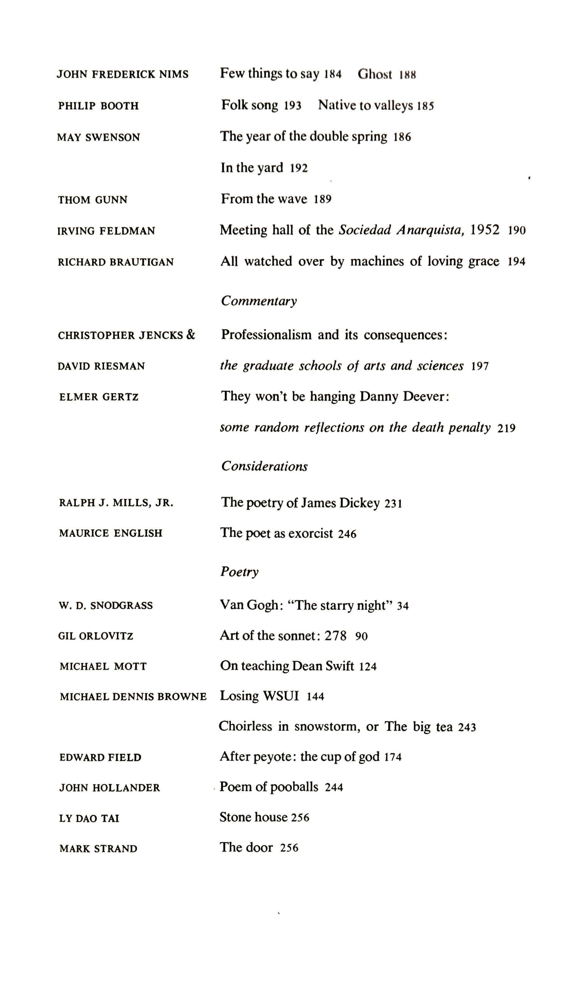 I have already insisted on the losses that result in these pages (TriQuarterly, Fall, 1966) and will not blow that horn again. I want now simply to point out that, from the readiness to sacrifice the formal aspects of poetry, those which link it with its aristocratic and hieratic origins, in favor of a highly personal and spontaneous response to experience, there has been a contradictory result: much of the characteristic poetry of our time, the poetry which is the logical development and extension of the practice of Williams through poets like Charles Olson, tends toward anonymity through the sacrifice of style, a sacrifice facilitated one could say, required by the giving up of the formal in poetry. The anonymity is not literal or absolute, of course, but it is the impression created by a pervasive exiguity of tone and feeling, by the renunciation of all that can be established in the mind by intricacies and elaborations of rhythm, imagery and vocabulary. Who feels the impulse to memorize the poems to which I allude? And how easy would they be to memorize? They are everywhere around, drifted into the little magazines on a breeze of personal sensibility, but carrying no personal signature.