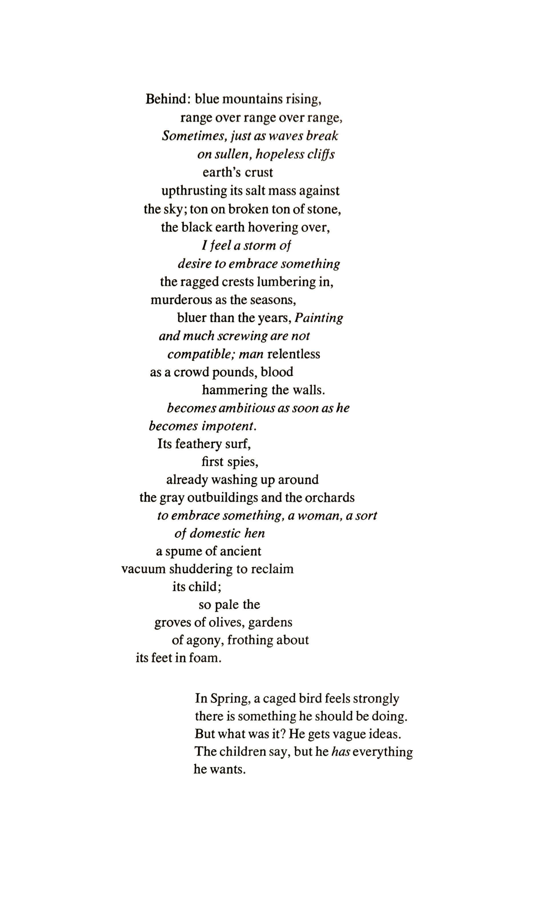 These speculations lose nothing of their macabre quality from appearing alongside poems which celebrate romantic love, his children, nature in its more fostering moods, and an amused delight in the sleight-of-hand of poetry. But a darkness is never, or hardly ever, absent. He says to his love: