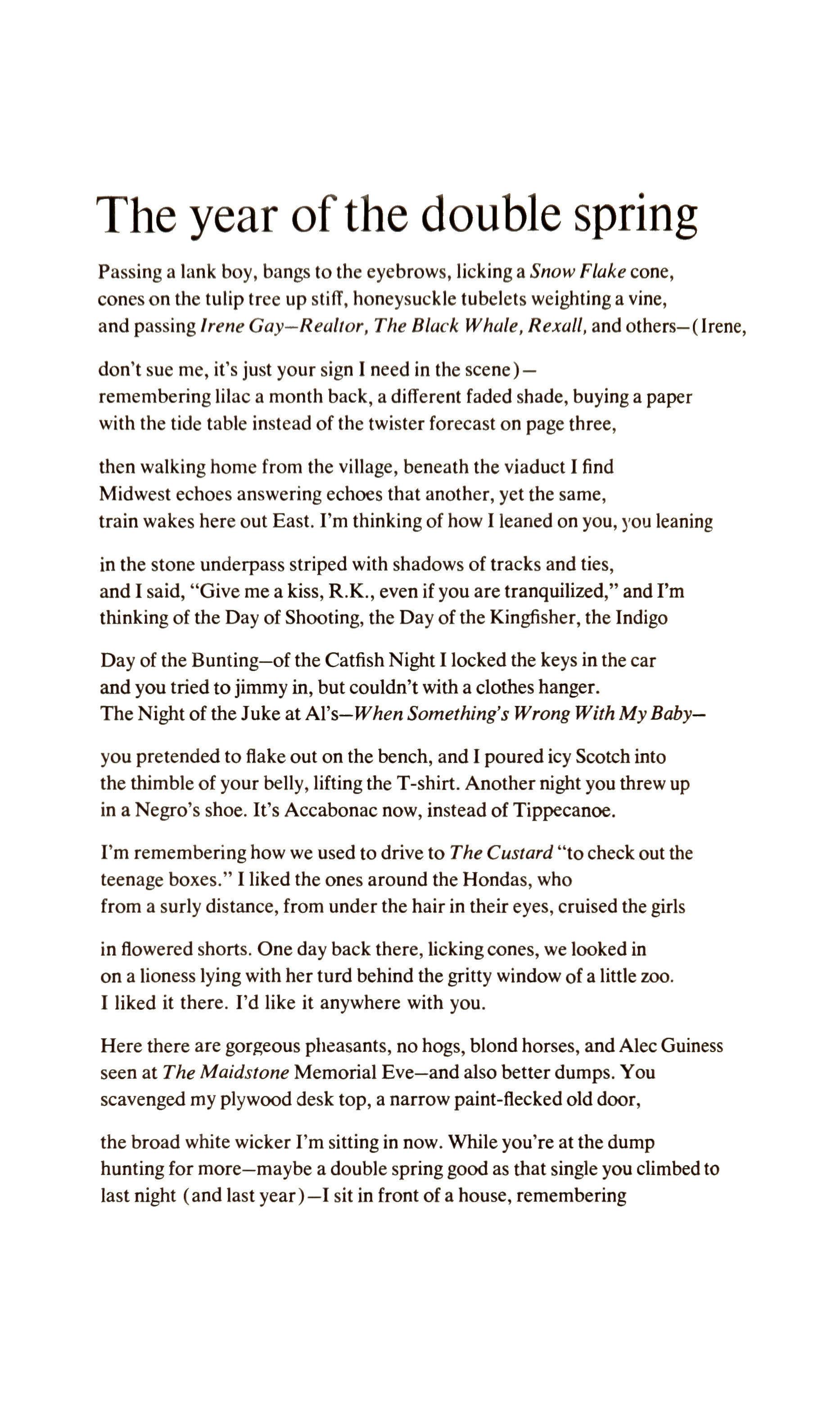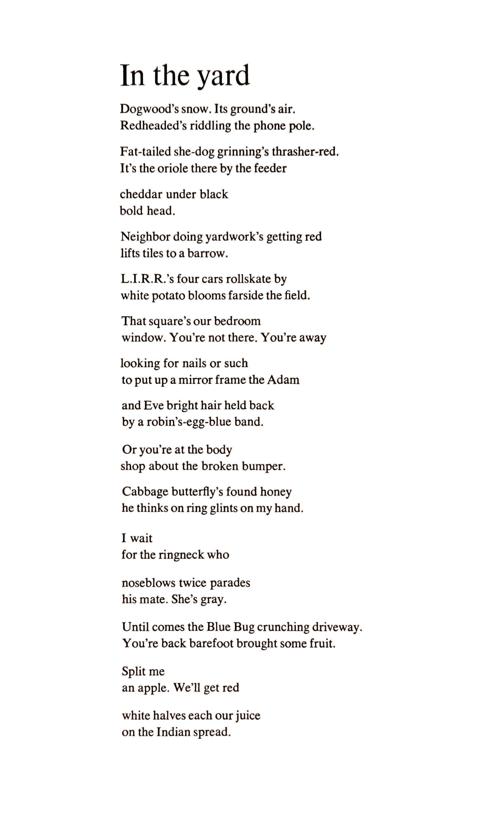 Some poems are missing from New & Selected Poems that I myself regret, like "The Big Graveyard," and imaginative explorations like the two studies in pathology named above. The arrangement of the book is deliberately not chronological, but it is not arbitrary, either. The poems are arranged in groups around a particular theme or "obsession" of their author. The first group is called "The Tree Menagerie" and we therefore find ourselves at once in a world of fancy which is four-square Viereckian, with its amused and reckless play with rhyme and meter, its lapses and retrievals of taste, its surprises of imagery and invention, its grotesqueries which suddenly become brilliant condensations: