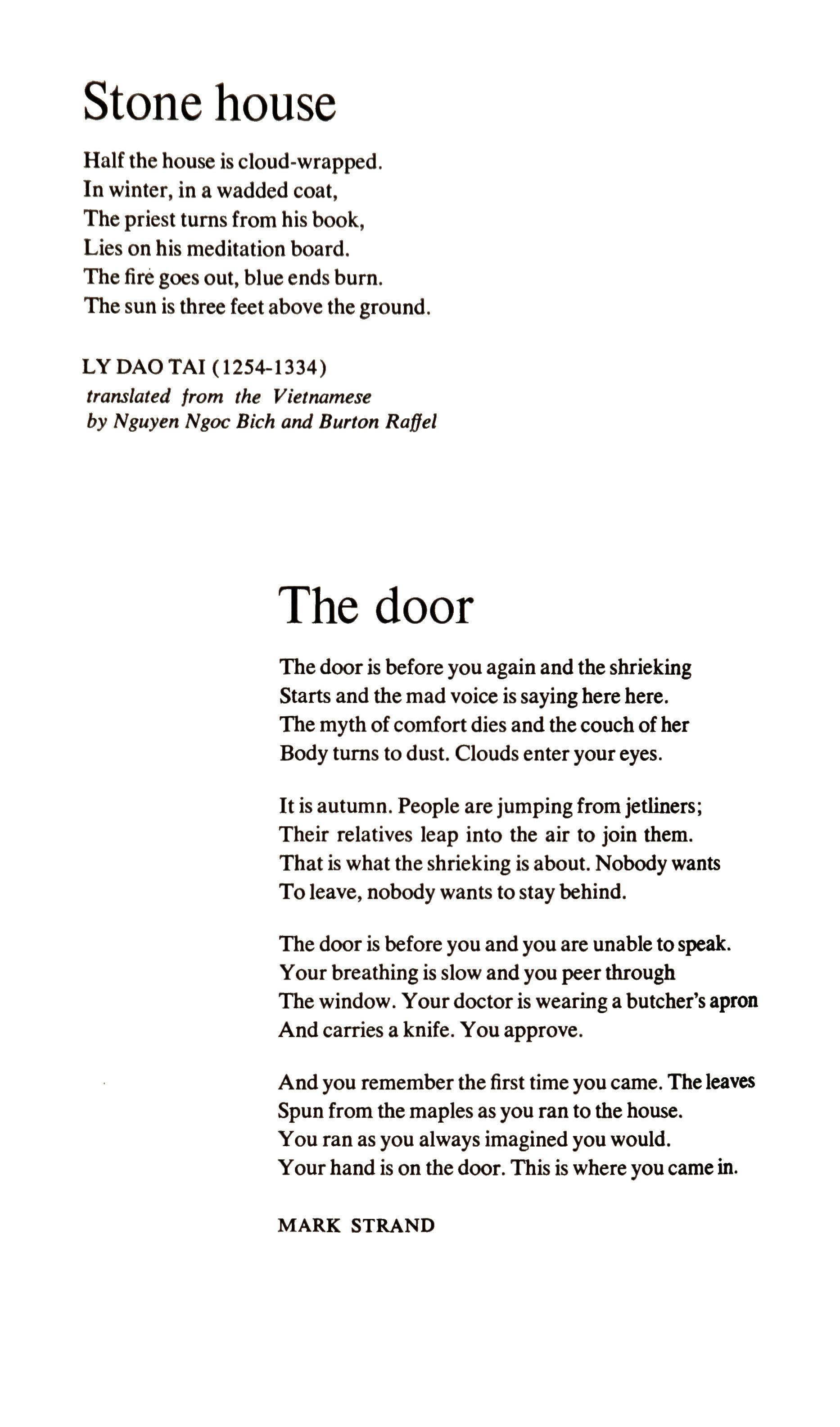 Half the house is cloud-wrapped. In winter, in a wadded coat, The priest turns from his book, Lies on his meditation board. The fire goes out, blue ends burn. The sun is three feet above the ground.