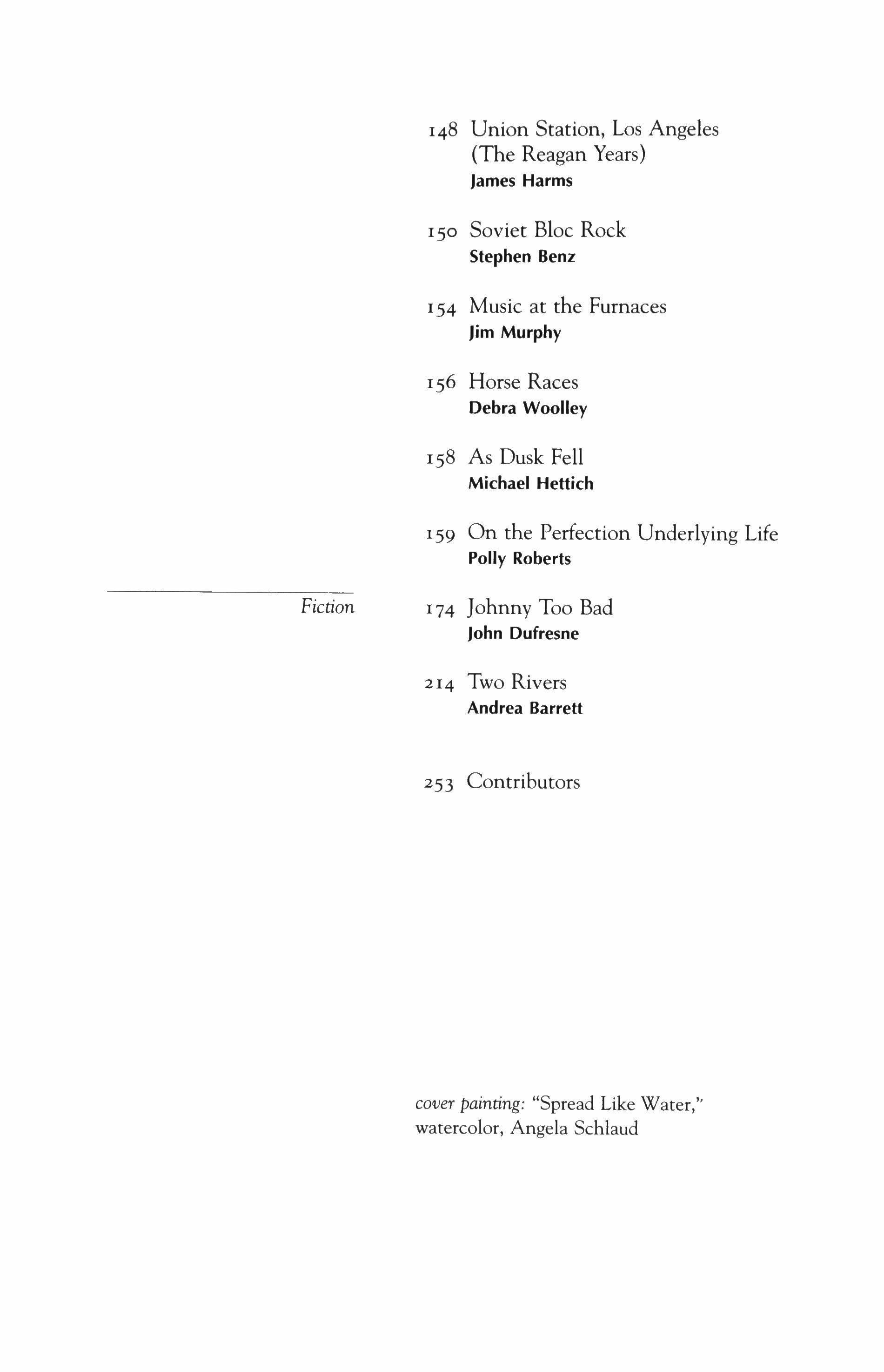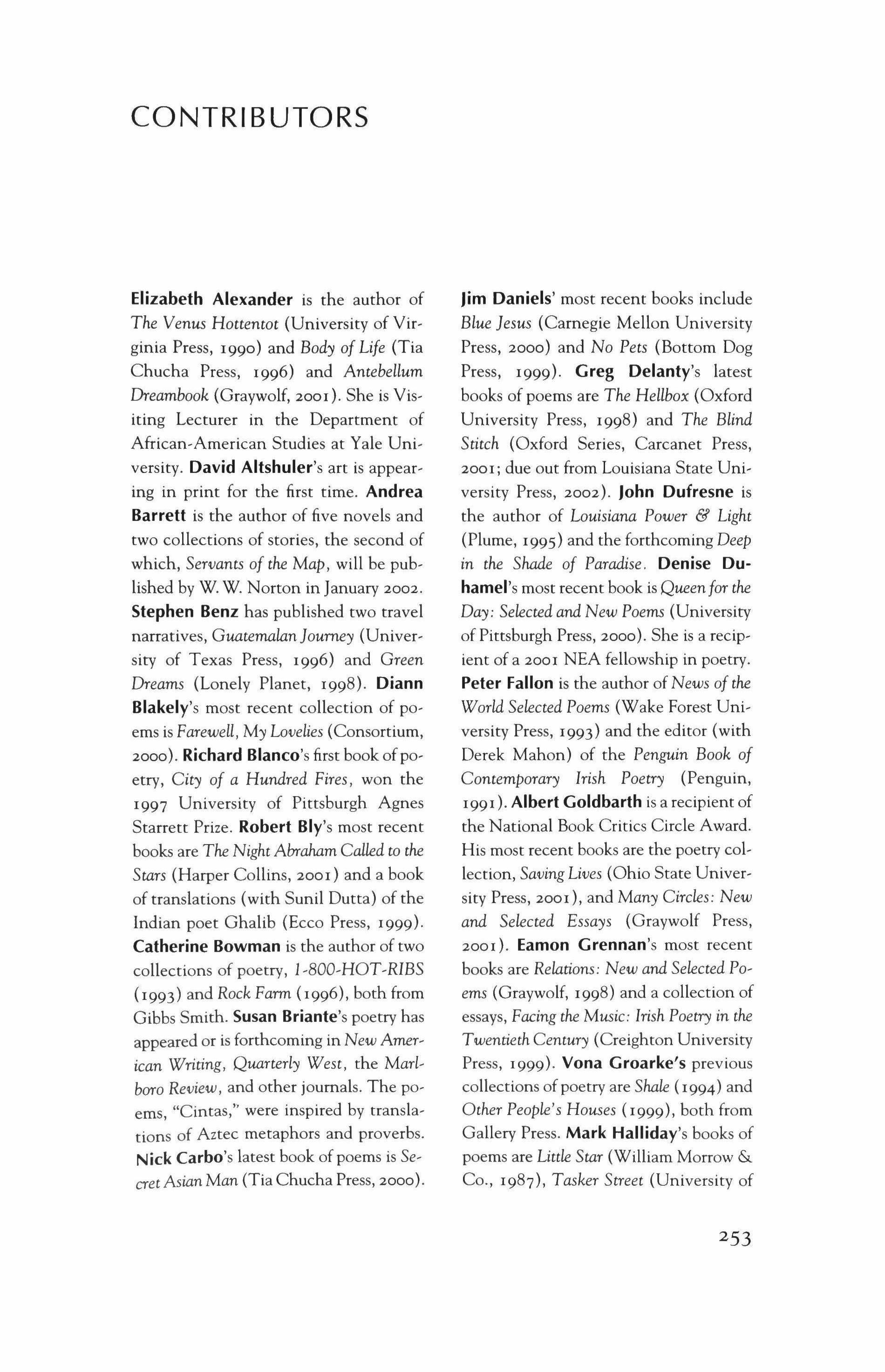 Elizabeth Alexander is the author of The Venus Hottentot (University of Virginia Press, 1990) and Body of Life (Tia Chucha Press, 1996) and Antebellum Dreambook (Graywolf, 2001). She is Visiting Lecturer in the Department of African-American Studies at Yale University. David Altshuler's art is appearing in print for the first time. Andrea Barrett is the author of five novels and two collections of stories, the second of which, Servants of the Map, will be published by W. W. Norton in January 2002. Stephen Benz has published two travel narratives, GuatemalanJourney (University of Texas Press, 1996) and Green Dreams (Lonely Planet, 1998). Diann Blakely's most recent collection of poems is Farewell, My Lovelies (Consortium, 2000). Richard Blanco's first book ofpoetry, City of a Hundred Fires, won the 1997 University of Pittsburgh Agnes Starrett Prize. Robert Bly's most recent books are The Night Abraham Called to the Stars (Harper Collins, 2001) and a book of translations (with Sunil Dutta) of the Indian poet Ghalib (Ecco Press, 1999).