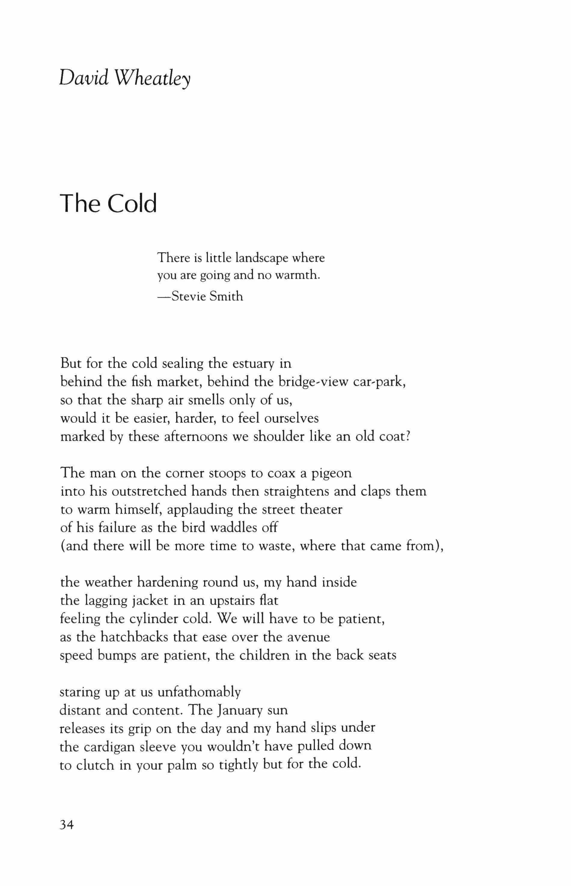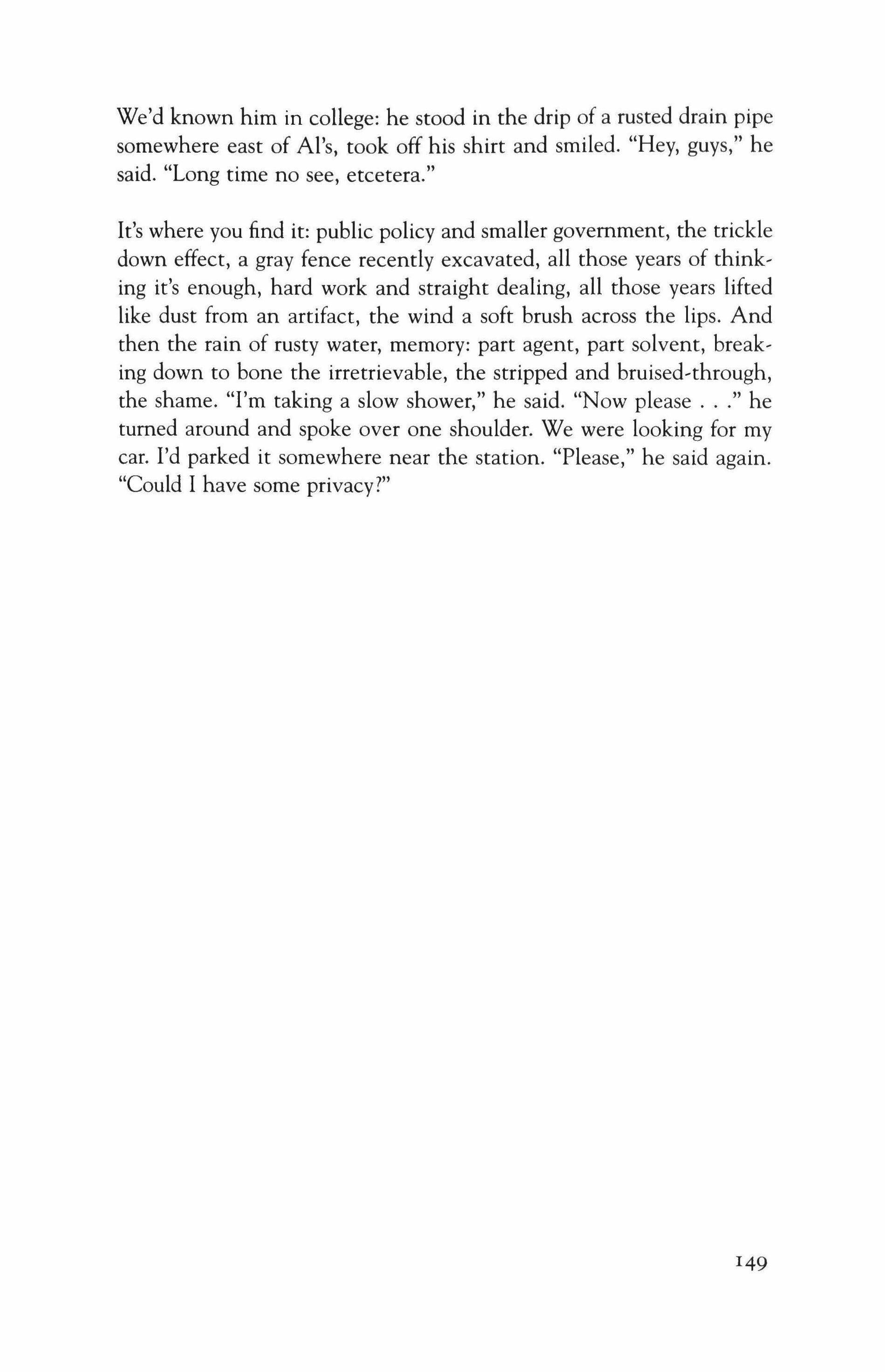 the Black Hills: Notes on the New Irish (University of Wisconsin Press, 2000). David Foster Wallace, author of Infinite Jest and other works, has recently been appointed Disney Professor of Creative Writing at Pomona College. Martin Walls' collection ofpoetry, Human Detail in Care of National Trust, was published by New Issues Press (2001). Charles Harper Webb's most recent book is Tulip Farms and Leper Colonies (BOA Editions, fall 2001). Liver (University of Wisconsin Press, 1999) won the Felix Pollak Prize. lydia Webster's work has appeared in Quarterly West, Salt Hill, Puetro del Sol, Willow Review, and StoryQuarterly. David Wheatley's two collections of poetry are Thirst (1997) and Misery Hill (2000). He co-edits the journal, Metre, and writes on poetry for the Times Literary Supplement, London Review of Books, and the Irish Times. A native of Jamaica, Debra Woolley currently lives in Miami. This is her first publication.