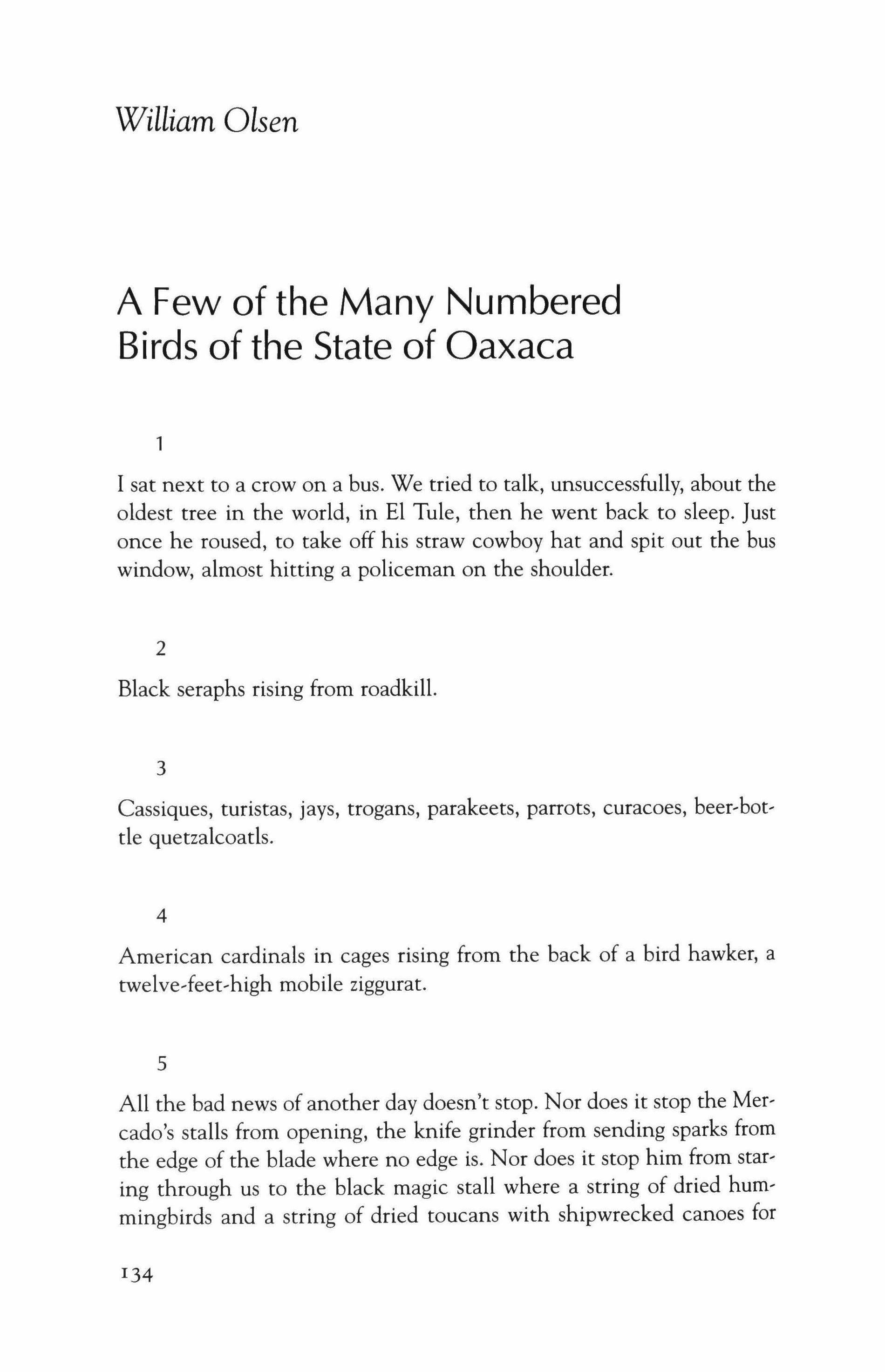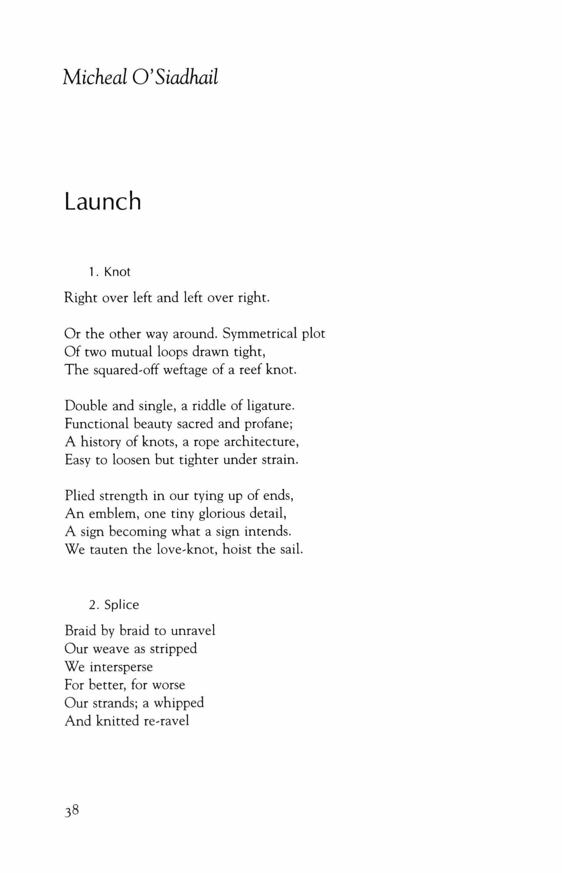 guin, 1998). James liddy's recent books are his Collected Poems (Creighton University Press, 1995) and Gold Set Dancing (Salmon Press, 2000). Kristina Martinez's work has appeared most recently in Spoon River, Poetry Review, and Yemassee. Campbell McGrath is a 1999 MacArthur Fellow. His most recent collection is Florida Poems (Harper Collins, 2002). Medbh McGuckian teaches creative writing at Queen's University in Belfast. Her most recent collection of poetry is Shelmalier (Wake Forest University Press, 1998). lissette Mendez lives in Miami Beach, Florida, where she is at work on a memoir about the Mariel boatlift. Nicole Moustaki is the author of The Complete Idiot's Guide to Writing Poetry (April 2001, Alpha Books). Jim Murphy's chapbook, The Memphis Sun, won the Stan and Tom Wick Poetry Award and was published by Kent State University Press (2000). Conor O'Caliaghan has published two collections ofpoetry in Ireland, The History of Rain (1993) and Seatown (1999). A selection from both collections, Seatown and Earlier Poems, was published by Wake Forest University Press (2000). Mary O'Donnell's most recent novel is The Elysium Treatment (Trident Press, 2000). Dennis O'Driscoli's five collections of poetry include Weather Permitting (Anvil Press, 1999). He received a Lannan Literary Award in 1999. William Olsen has published three collections of poetry, The Hand of God and a Few Bright Flowers (University of Illinois Press, 1998) and Vision of a Storm Cloud (TriQuarterly Books, 1996), and Trouble Lights (TriQuarterly Books, 2001). Micheal O'Siadhail's ten collections of poetty include his most recent, Our Double Time (Bloodaxe, 1998), and a new selection of earlier work, Poems 1975-95: Hail! Madam Jazz and A Fragile City