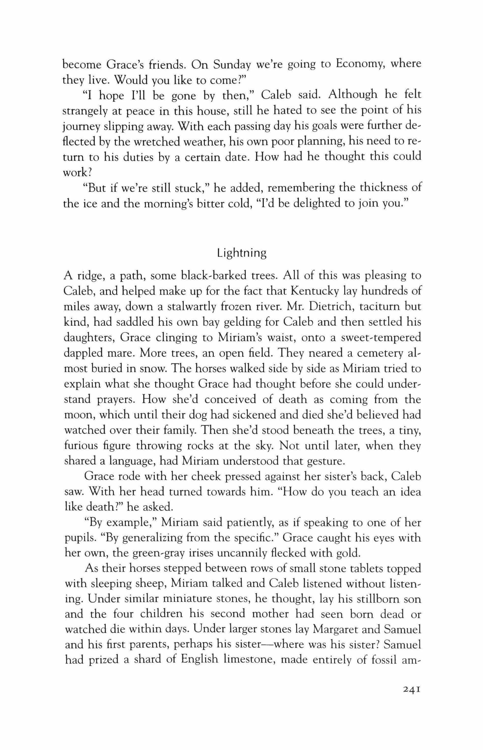 Beneath her feet, beneath the river, Grace thought, the world was as densely layered as a leek. Was that what Caleb meant? Her geography book had said nothing of this, that beneath the superficial film of dirt and vegetation were layers of fish and serpents and bugs and plants, frozen lives, life she hadn't known was alive-anything might exist in the rocks and that she hadn't seen it before was only because she hadn't thought to look. She bent down, searching through the rusty pebbles fanned across the ice and then cracking a smooth oval the size of her palm against a large rock. Shocked and disappointed, she held the pieces out to Caleb.