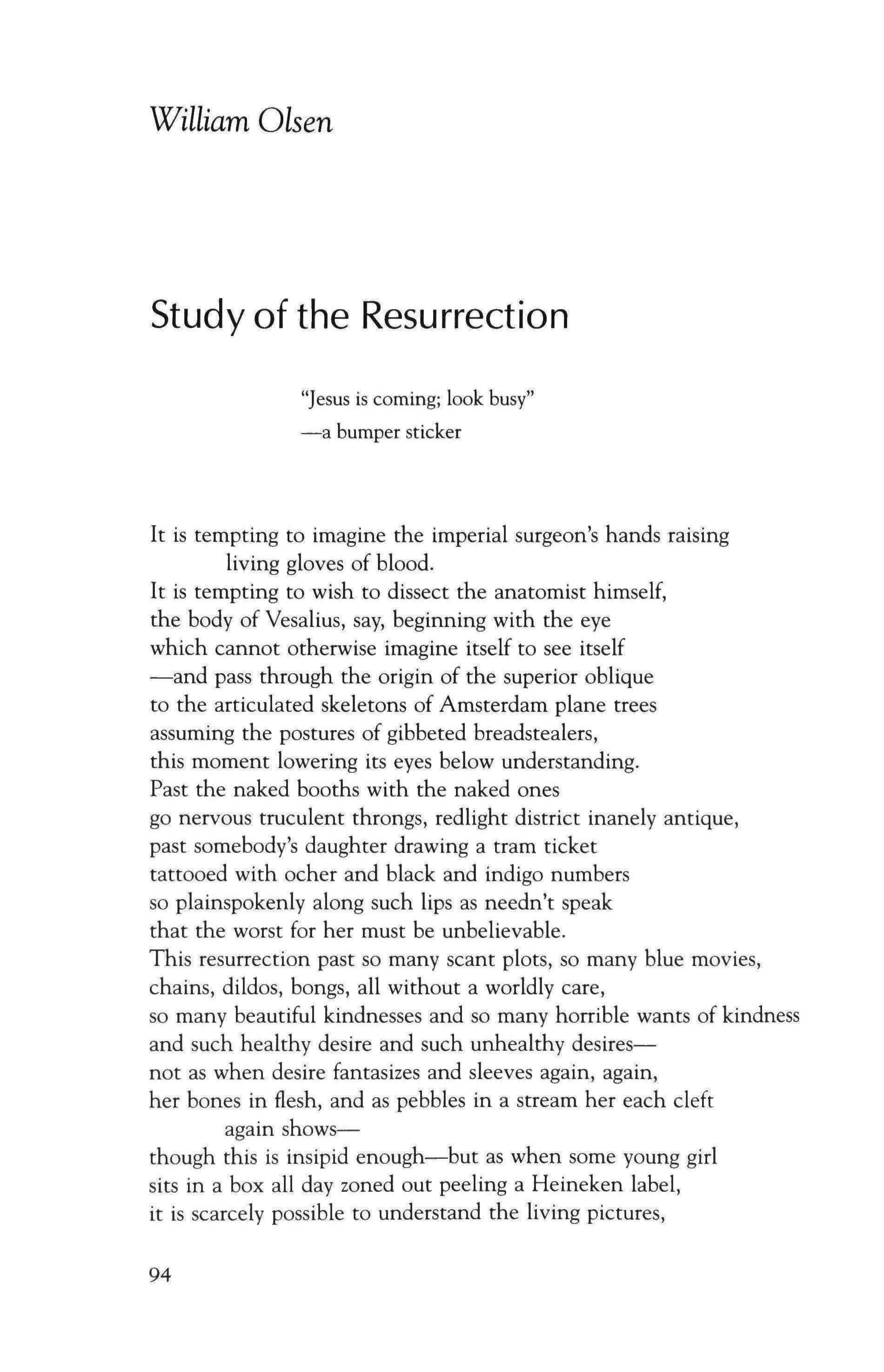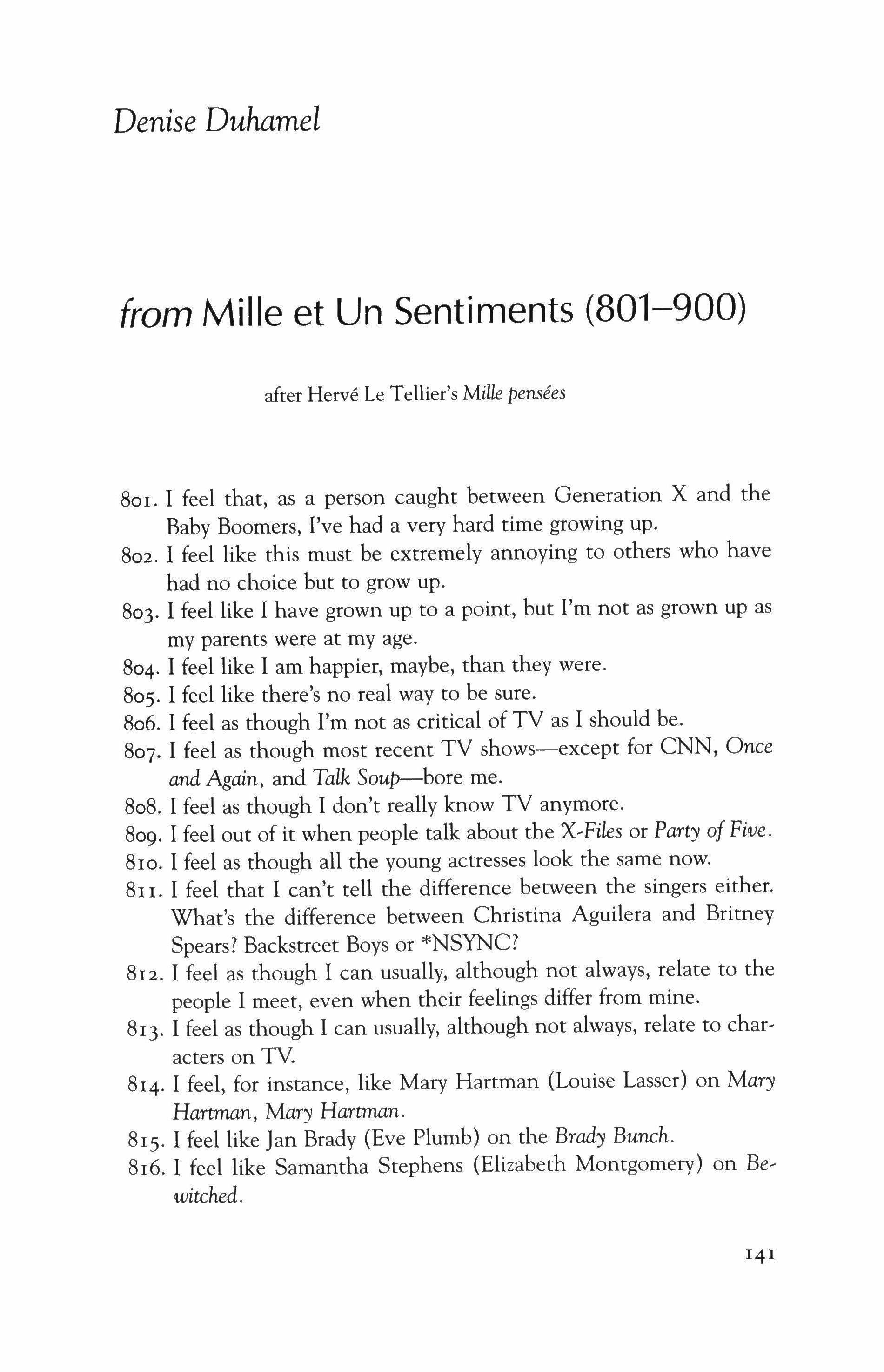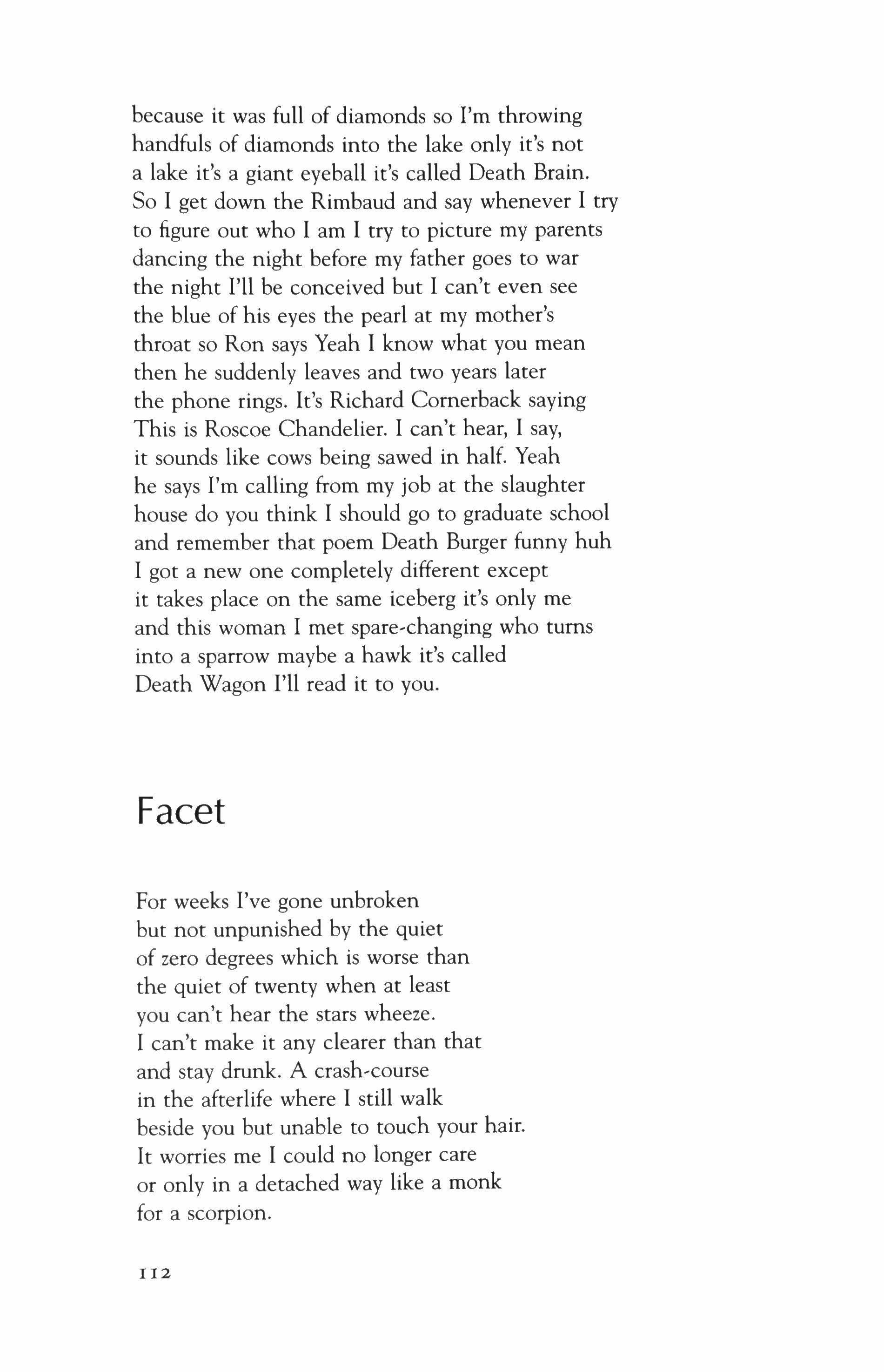 Jim Daniels' most recent books include Blue Jesus (Carnegie Mellon University Press, 2000) and No Pets (Bottom Dog Press, 1999). Greg Delanty's latest books of poems are The Hellbox (Oxford University Press, 1998) and The Blind Stitch (Oxford Series, Carcanet Press, 2001; due out from Louisiana State University Press, 2002). John Dufresne is the author of Louisiana Power & Light (Plume, 1995) and the forthcoming Deep in the Shade of Paradise. Denise Duhamel's most recent book is Queenfor the Day: Selected and New Poems (University of Pittsburgh Press, 2000). She is a recipient of a 2001 NEA fellowship in poetry. Peter Fallon is the author of News of the World Selected Poems (Wake Forest University Press, 1993) and the editor (with Derek Mahon) of the Penguin Book of Contemporary Irish Poetry (Penguin, 1991). Albert Goldbarth is a recipient of the National Book Critics Circle Award. His most recent books are the poetry collection, Saving Lives (Ohio State University Press, 2001), and Many Circles: New and Selected Essays (Graywolf Press, 2001). Eamon Grennan's most recent books are Relations: New and Selected Poems (Graywolf, 1998) and a collection of essays, Facing the Music: Irish Poetry in the Twentieth Century (Creighton University Press, 1999). Vona Groarke's previous collections ofpoetry are Shale (1994) and Other People's Houses (1999), both from Gallery Press. Mark Halliday's books of poems are Little Star (William Morrow & Co., 1987), Tasker Street (University of