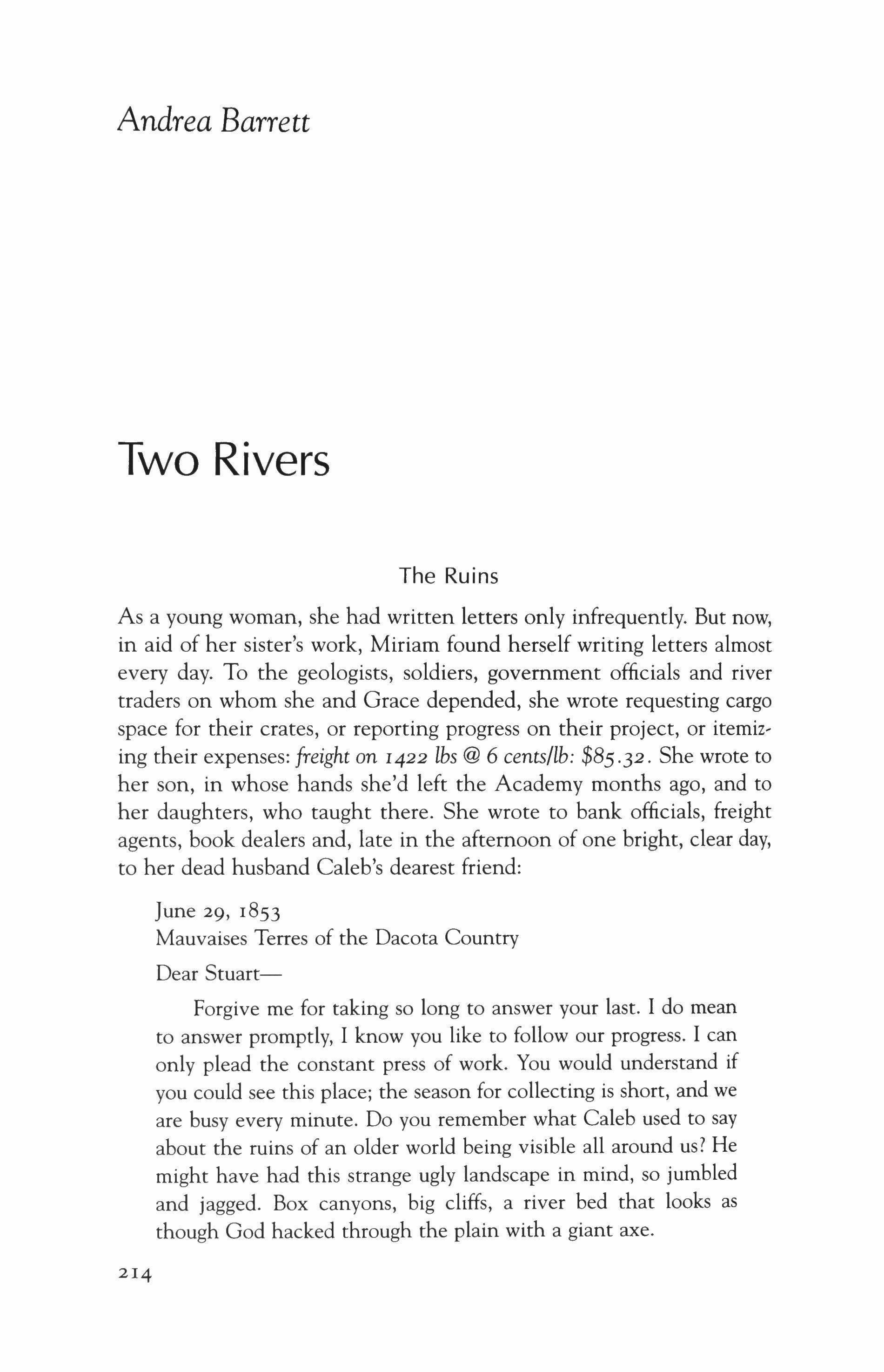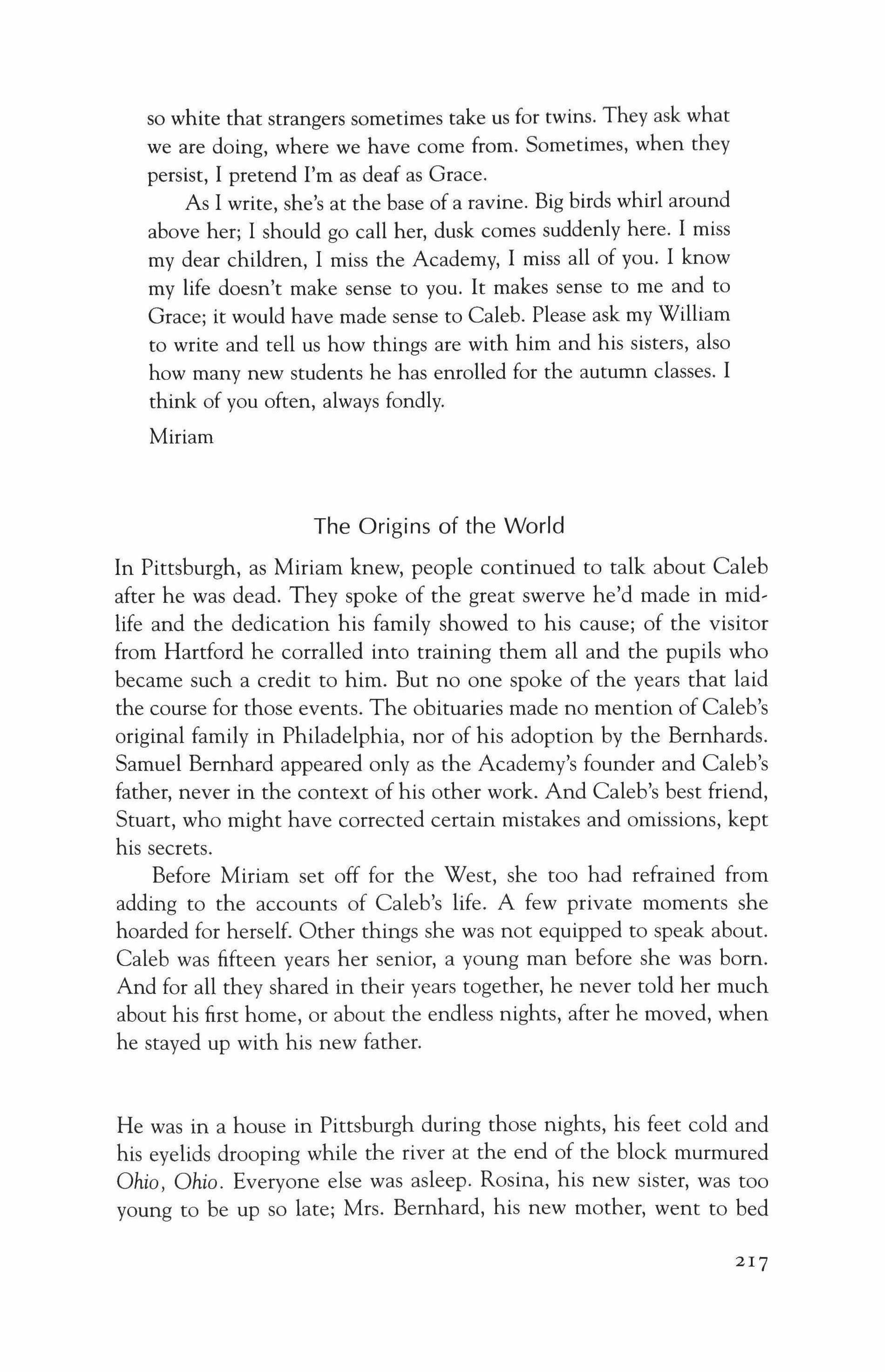 Out here, surrounded by the evidence of vanished rivers, Miriam thinks of that evening riding home along the frozen Ohio. At what moment had the stream of Caleb's life bent and merged with hers? The people she's left behind in Pittsburgh know nothing of this; nor does Stuart. When she finds herself signing, almost unconsciously-Was it what you wanted, was she like a daughter, was she more to you than your own daughters?-she is more reassured than surprised.
