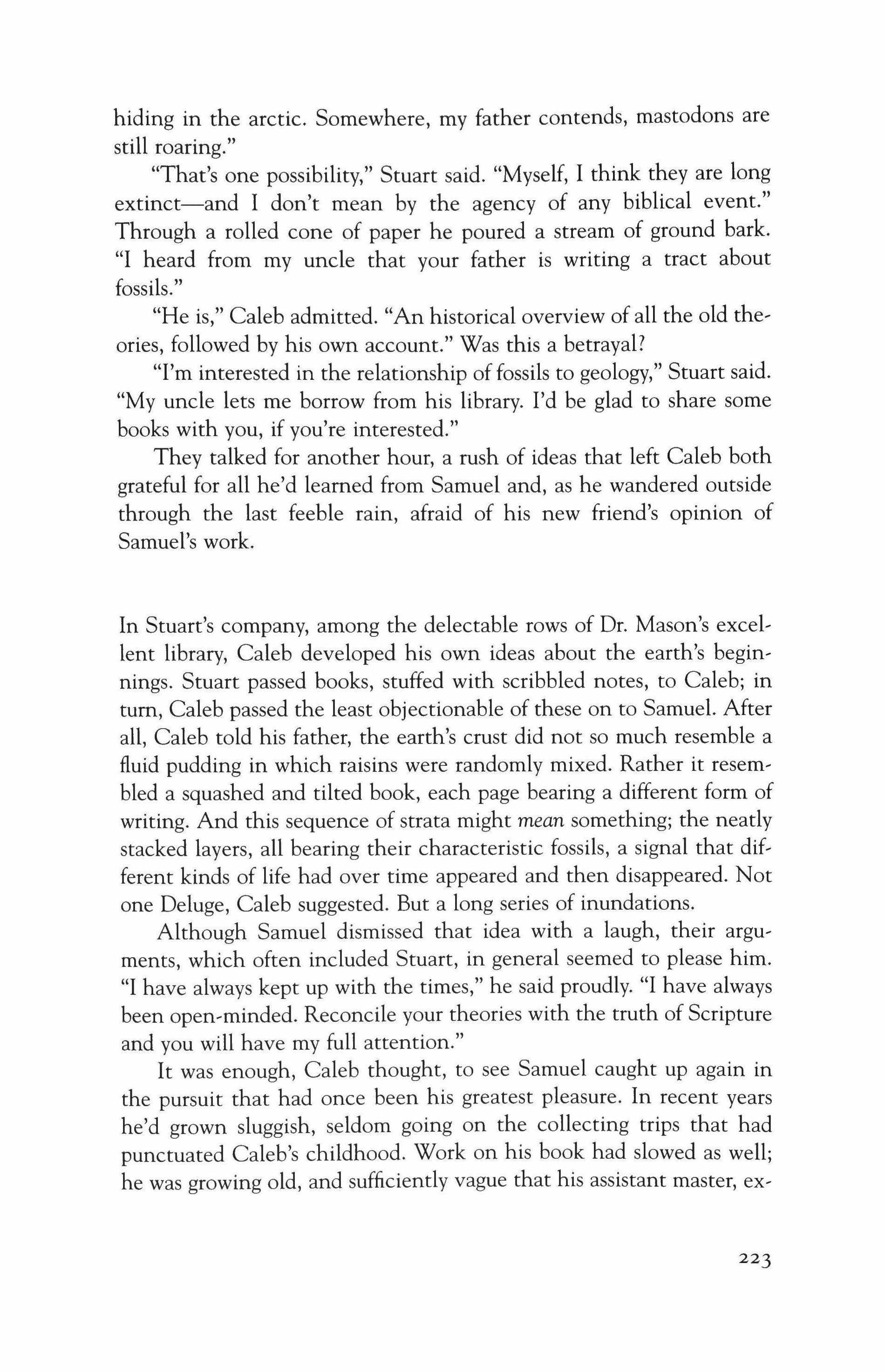 For years he'd listened without complaint as Samuel described, first to him, then to them, the earth's unchanging perfection. Some of the boys, clean and well-dressed, had listened attentively. But the shabby ones, those with dusty hands and shadowed eyes, missing parents, irregular households: what had they known of such order? Perhaps, Caleb thought, like him they'd seen evidence of a Maker whose attention wandered. One day, after taking over the afternoon class, he'd offered them an alternate view of the earth's history.