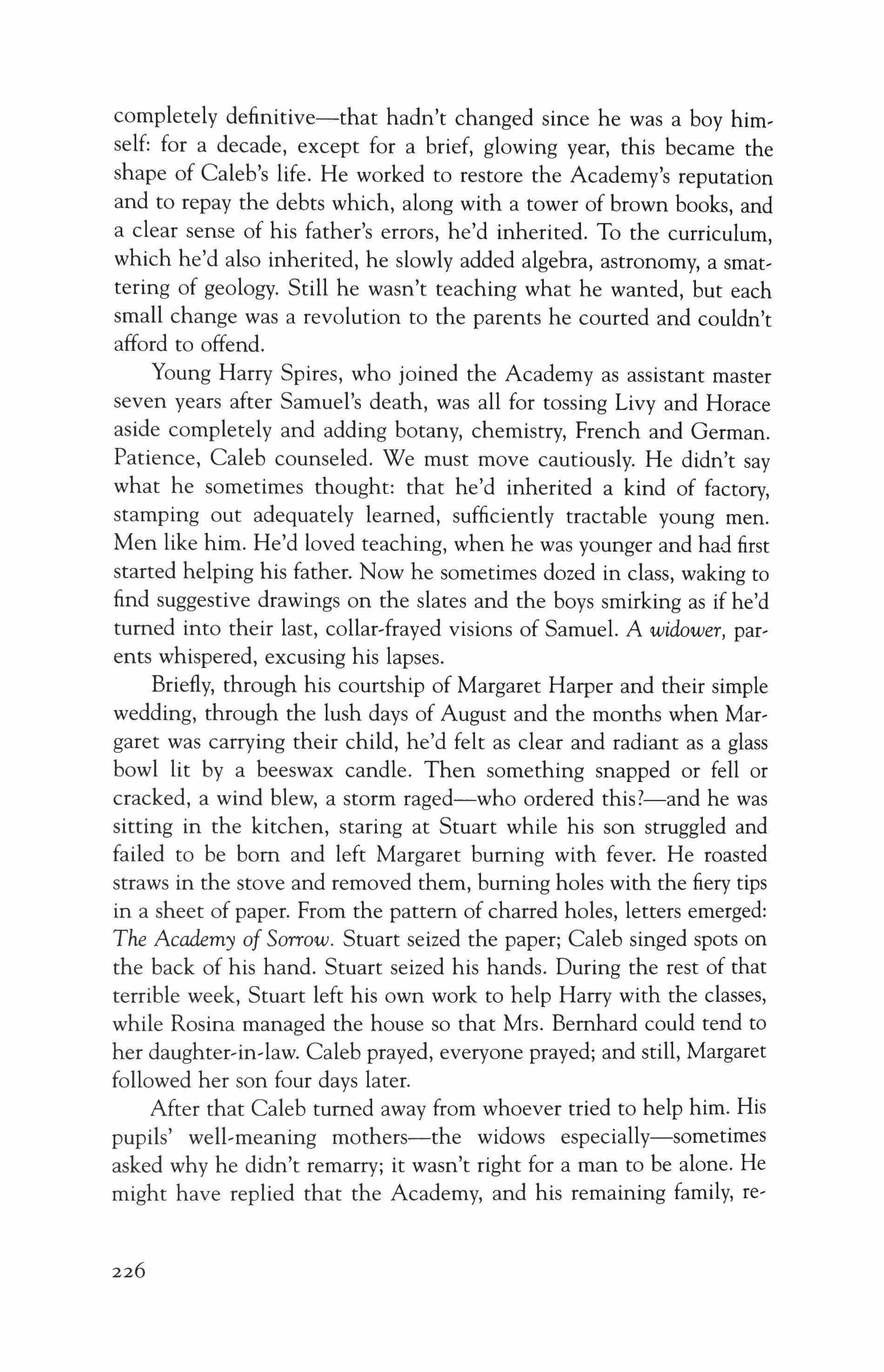 In her opinion they were lucky despite meeting so late in his life: their school's success, and their three healthy children, more than many get. Was that enough? It was never like him to complain. She always knew that his fascination for Grace was part of his bond to her. As he always knew what she most wanted. And if he didn't feel for her exactly what he felt for Margaret, if his mind wasn't braided as closely with hers as it was with Stuart's-what did that matter? They worked together, they made a life. In the dormitory they built for the boarders, they sometimes found the children, late at night, huddled around an illegal candle with their hands flying urgently. Despite the risk of fire, Caleb could never bear to snuff the flame.