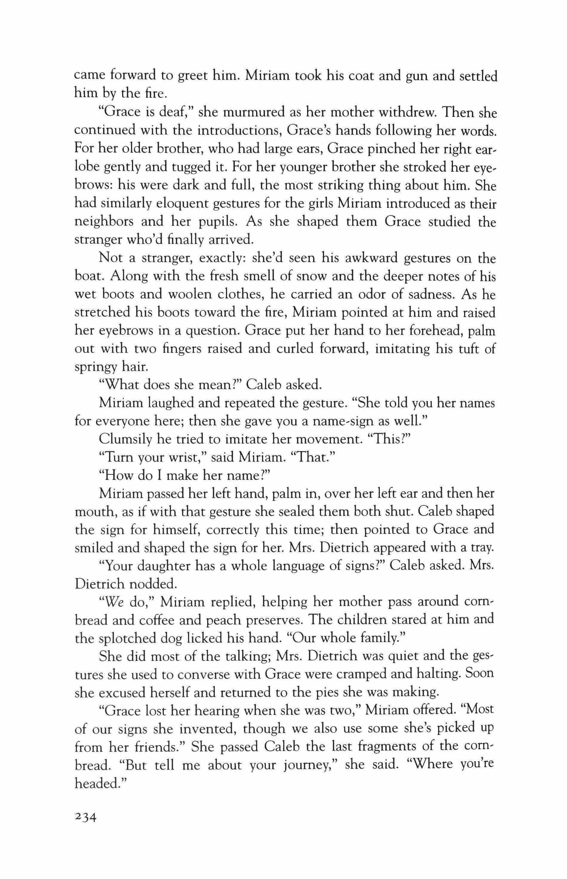 Were you happy? she signs to Caleb. Under this vast and steely sky the world seems ancient, and very large. She feeds more grass to the little flame and adds this: I was.