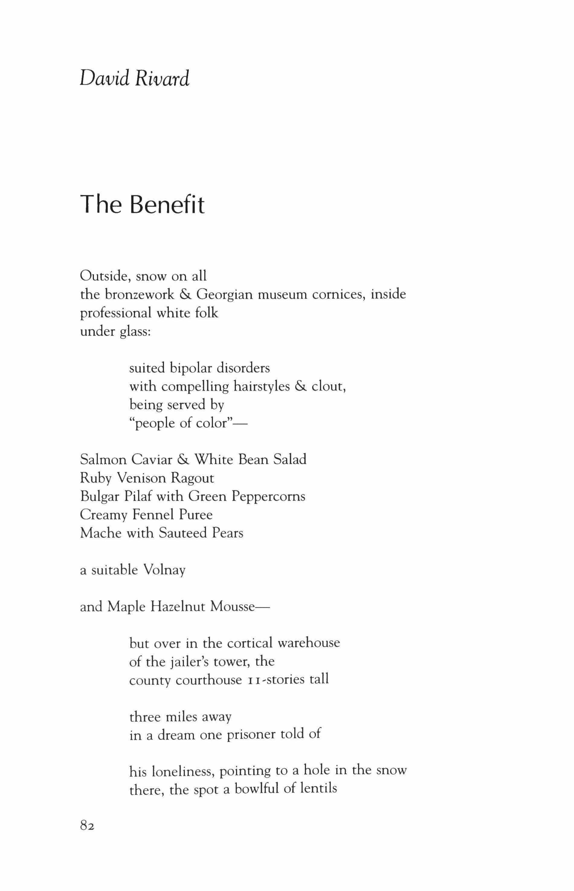 (Bloodaxe, 1999). David Rivard's most recent book is Bewitched Playground (Graywolf, 2000). He won the James Laughlin Prize from the Academy of American Poets for Wise Poison (Graywolf, 1996). Polly Roberts' work has appeared in the Antioch Review, Another Chicago Magazine, and the Paterson Literary Review. Hugo Rodriguez is a firefighter and paramedic in Miami, Florida. His poetry has appeared in Mid-American Review, International Poetry Review, and other journals. Aidan Rooney-Cespedes won the 1997 W.B. Yeats Po-etry Competition and the Sunday Tribune/Hennessy Cognac Award for New Irish Poetry. His poetry has appeared in Poetry Ireland Review, Brangle, College English and Metre. Angela Schlaud is an artist living in Evanston, IL. Bill Tinley has published widely in journals in Europe and North America. He won the 1996 Patrick Kavanaugh Award. Eamonn Wall's most recent books are The Crosses (Salmon, 2000) and From the Sine Cafe to
