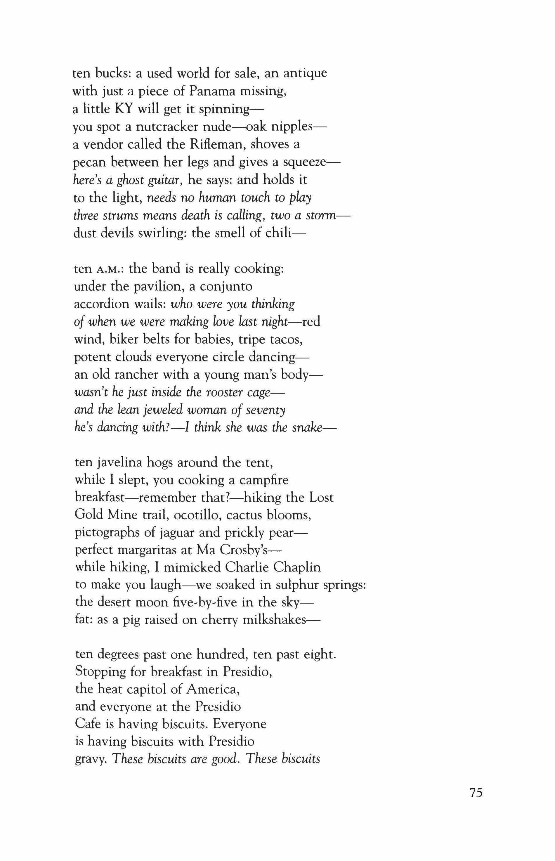 Catherine Bowman is the author of two collections of poetry, 1-800-HOT-RIBS (1993) and Rock Farm (1996), both from Gibbs Smith. Susan Briante's poetry has appeared or is forthcoming in New American Writing, Quarterly West, the Marlboro Review, and other journals. The poems, "Cintas," were inspired by translations of Aztec metaphors and proverbs. Nick Carbo's latest book of poems is Secret Asian Man (Tia Chucha Press, 2000).