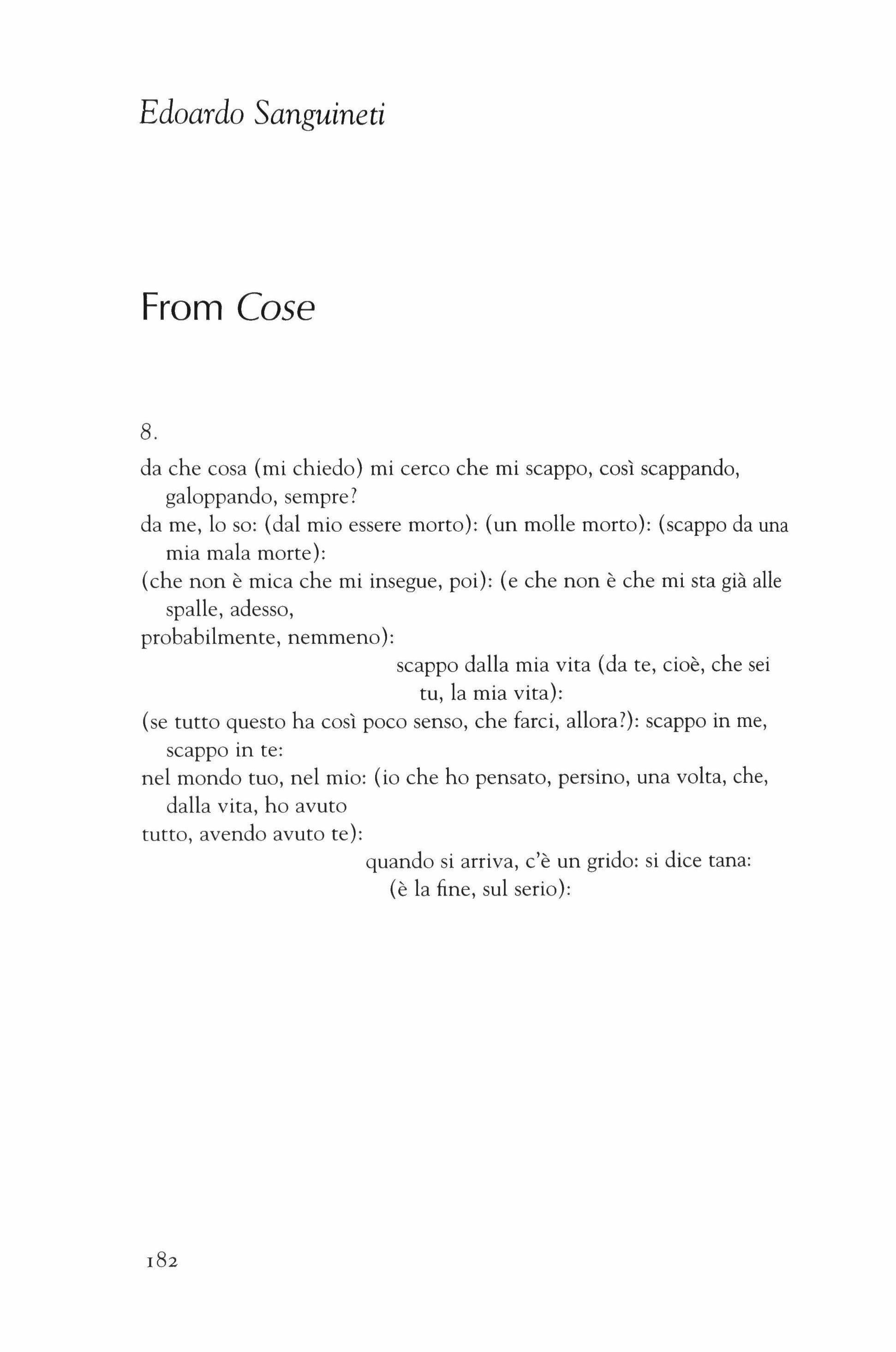Edoardo Sanguineti was born in Genova in 1930. He is one of the foremost Italian poets, critics, translators and scholars. His first book, Laborintus appeared in 1956, and he was a key member of the "nee-experimental" "Gruppo '63," who convened that year in Palermo and included the poet Amelia Rosselli, the critic Umberto Eco, and other writers, musicians, and poets dedicated to exploring the connections between high and mass culture and to disrupting the prevailing ideology. From 1979 to 1983 Sanguineti was a Communist delegate to the Italian Parliament. Sanguineti has won a number of major prizes during his long career: the Premio Calepino in 2001; the Premio Bagutta in 2002; the Premio Speciale della Giuria dei Letterati, the Premio di poesia Carlo Betocchi, the Premio Letterario Castelfiorentino, and the Premio alla Carrriera del Festival Nazionale di Poesia Italiana Citra di San Pelligrino Terme-all in 2003; the Premio Lericipea in 2004 and, in 2006, the Premio Librex-Montale, His most recent book of poems is the collection Il gatto lupesco. Poesie 1982-2001