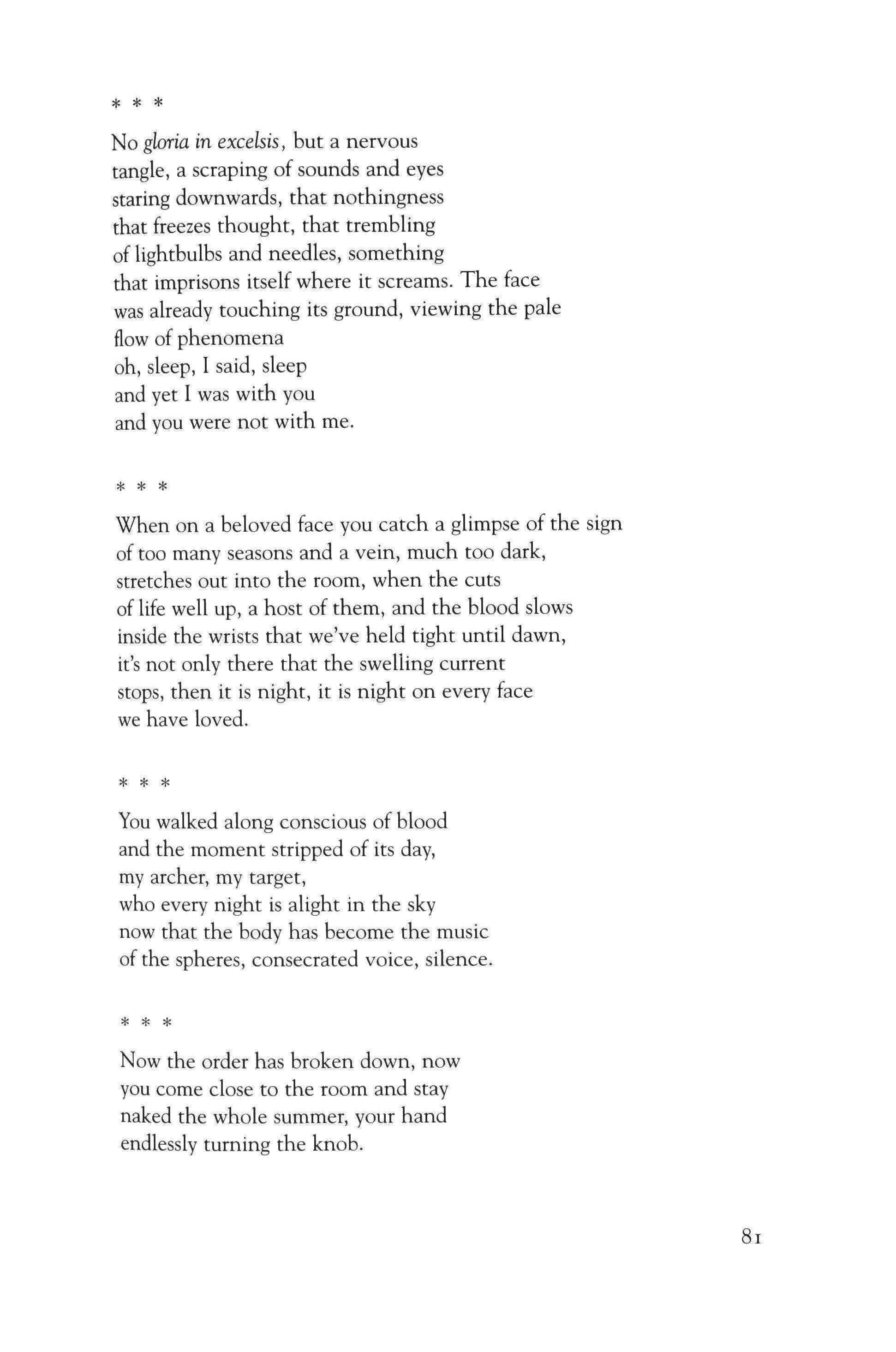 Roberto Cigliucci was born in 1962. He lives in Rome, where he teaches at the University ofRome, La Sapienza. Gigliucci has published his poems in II Caffe illustrato, Letteratura, Capoverso, and other journals. He is also the author of a novel, Finche siamo giovani, and numerous works of literary criticism, including his recent study, Realismo metafisico e Montale. A graduate of the Centro Sperimentale di Cinematografia, he has produced documentaries on subterranean Rome and on Cezanne.
