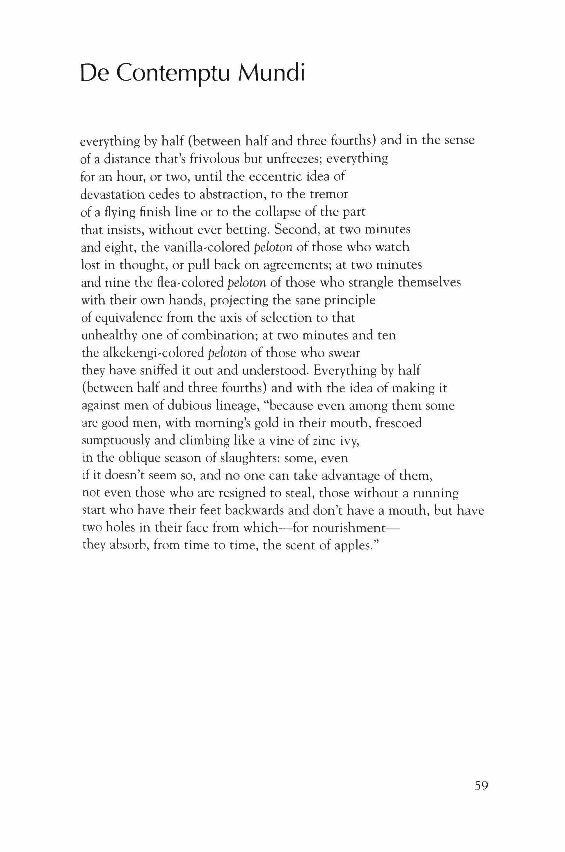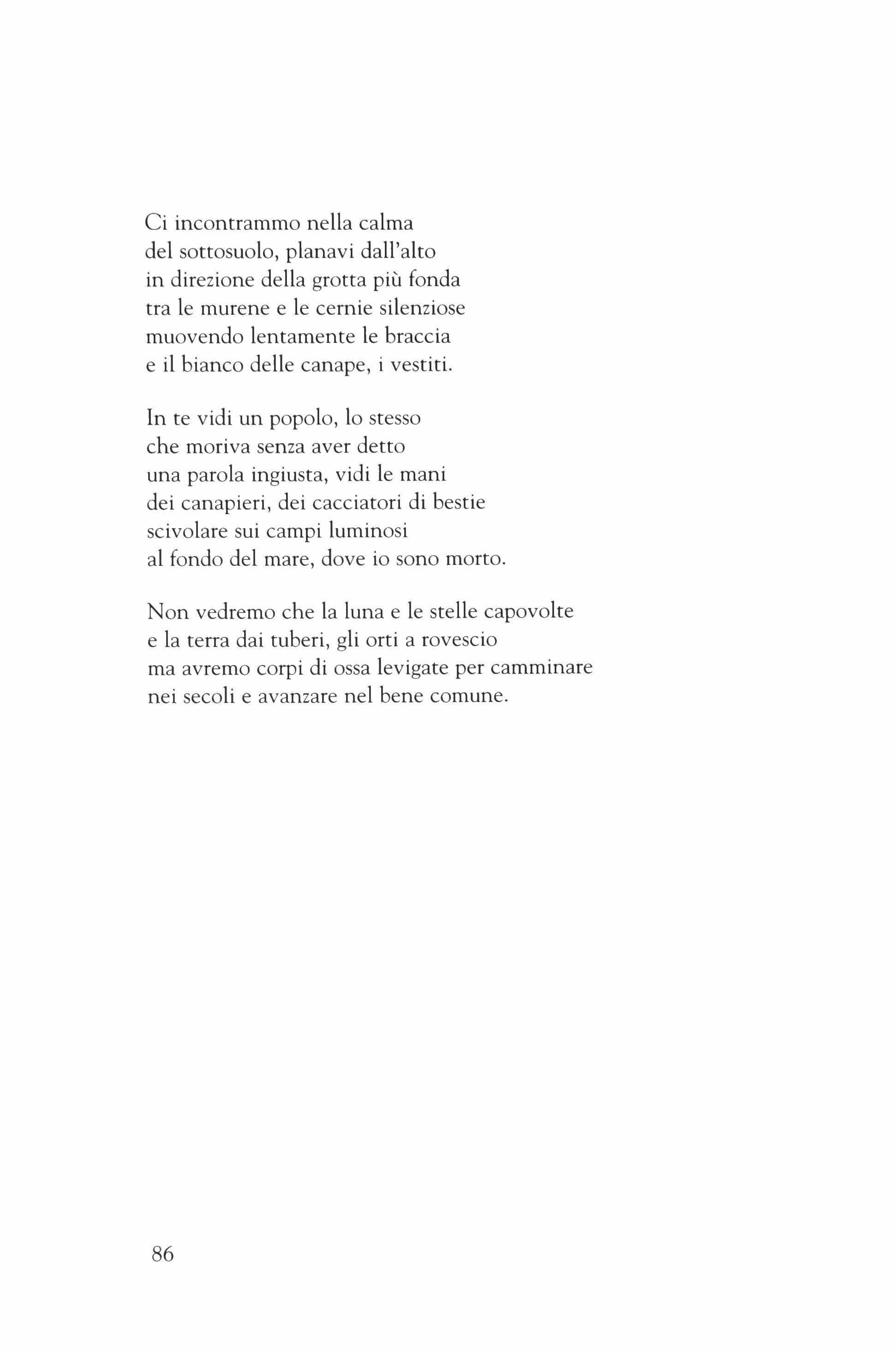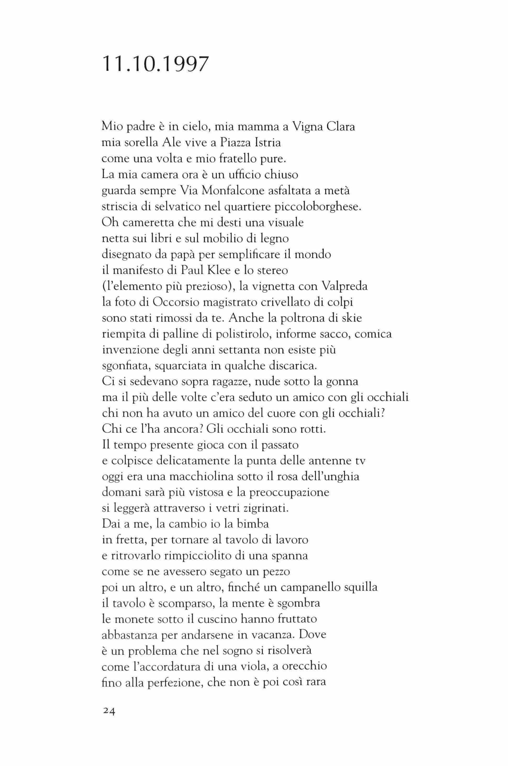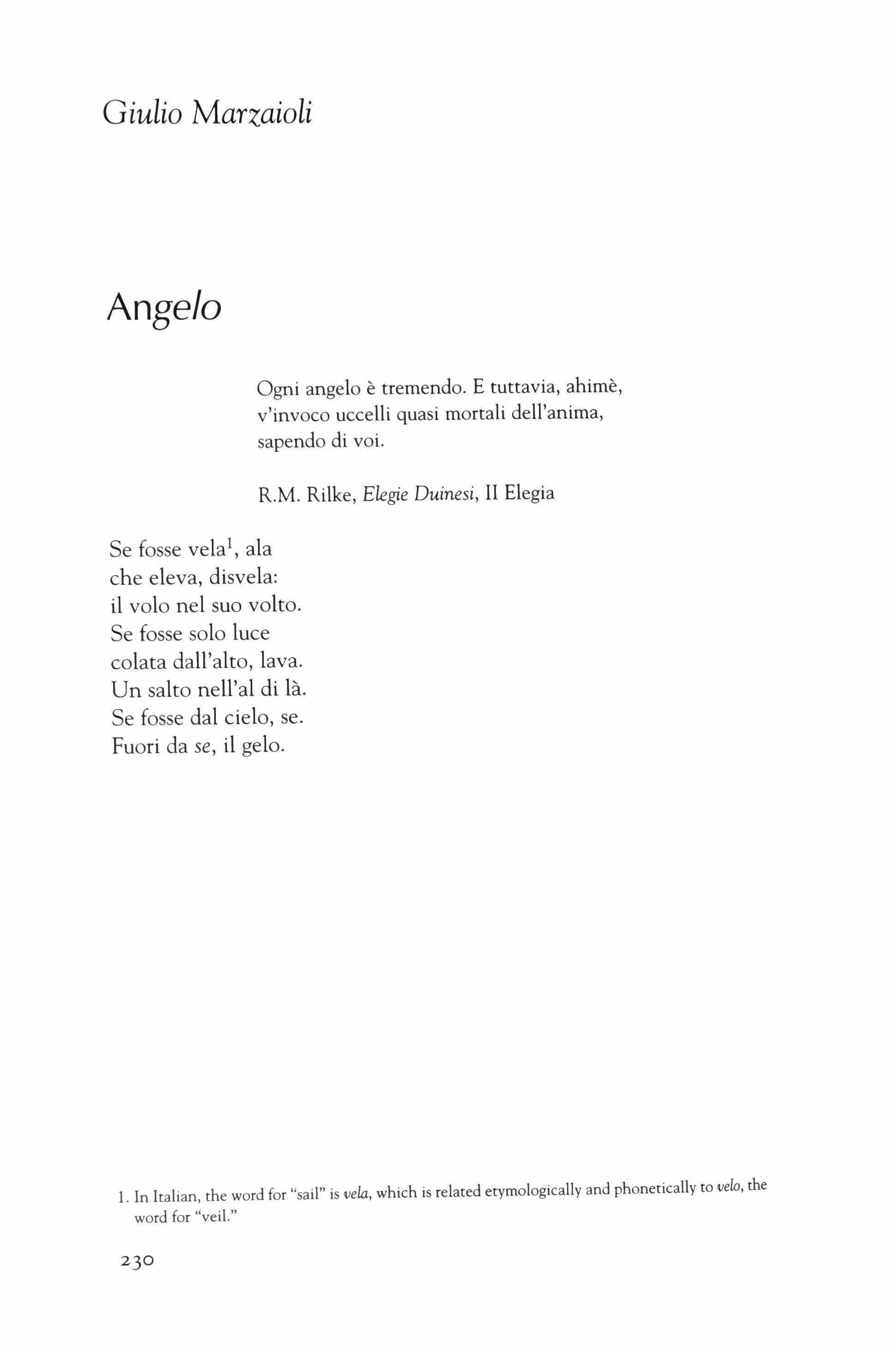 Giulio Marzaioli was born in Florence in 1972. He lives in Rome and has published In re ipsa, for which he won the Premio Montano in 2005, Quadranti, and Appunti del non vero-Scritture verso il teatro. In addition to his work as a poet, his writings for the stage have appeared in many theaters. In 2002 he founded, with Romina De Novellis, the experimental theater company DENOMA.