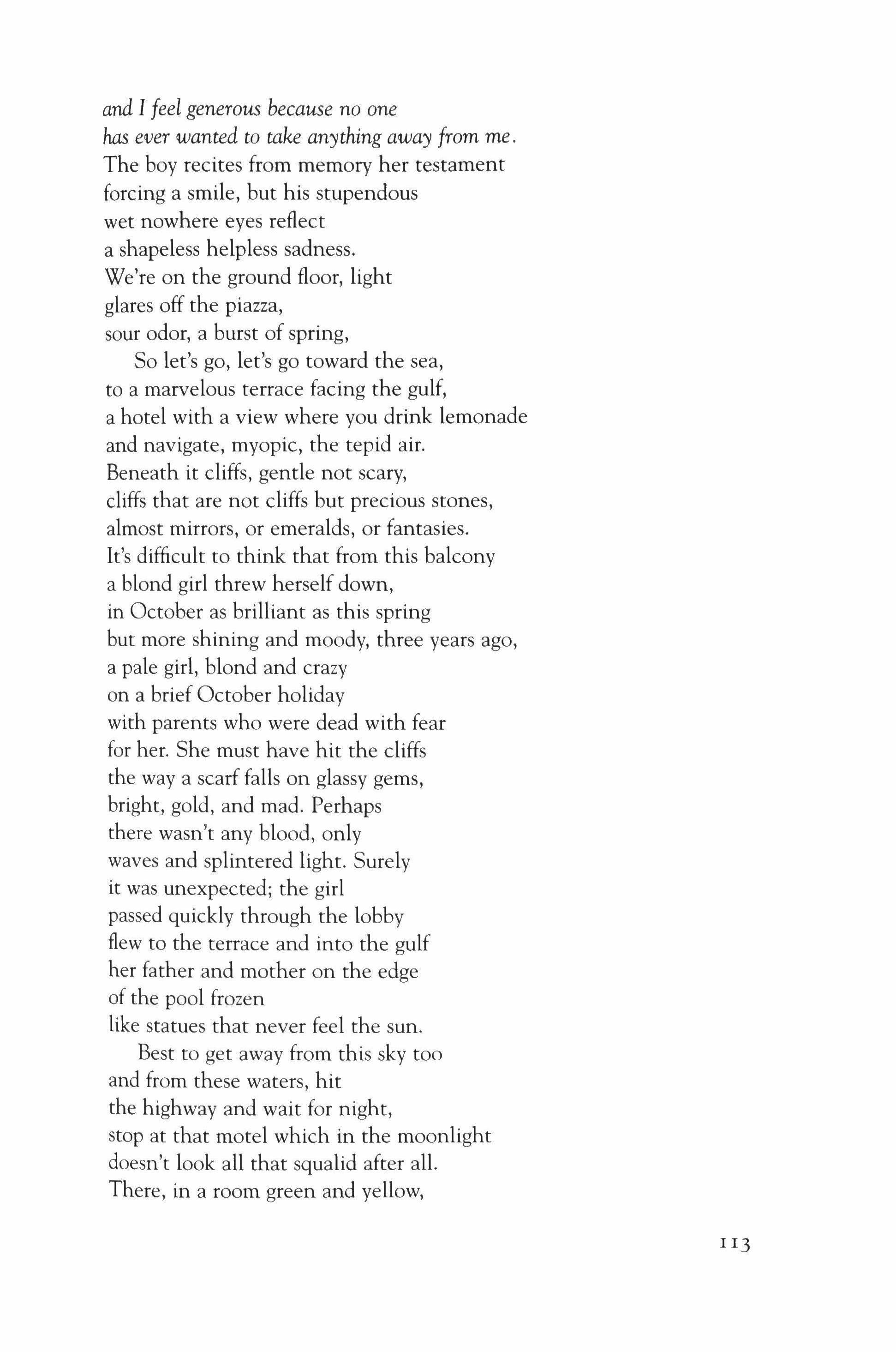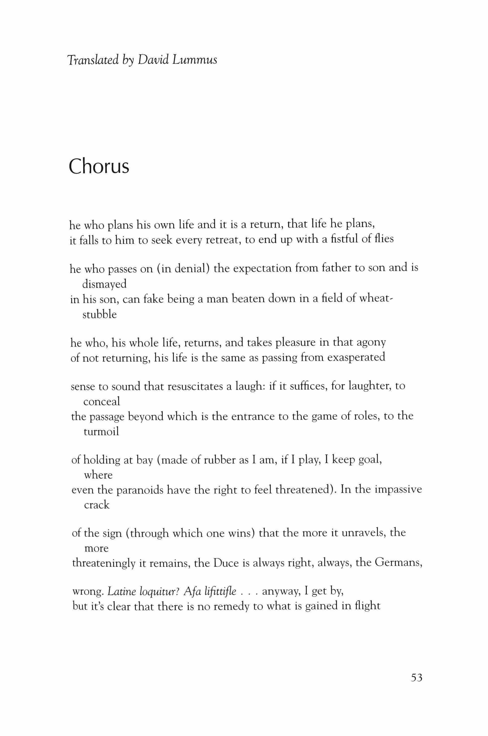 David Lummus was born in Texas. He is a Ph.D. candidate in Italian Studies at Stanford University, where he is currently completing his dissertation on Giovanni Boccaccio's Genealogie Deorum Gentilium. He has translated Pietro Zullino's novel Cynthia with her eyes, a selection of which appeared in TriQuarterly, and has written on Boccaccio, Italian philology, and Valerio Magrelli.