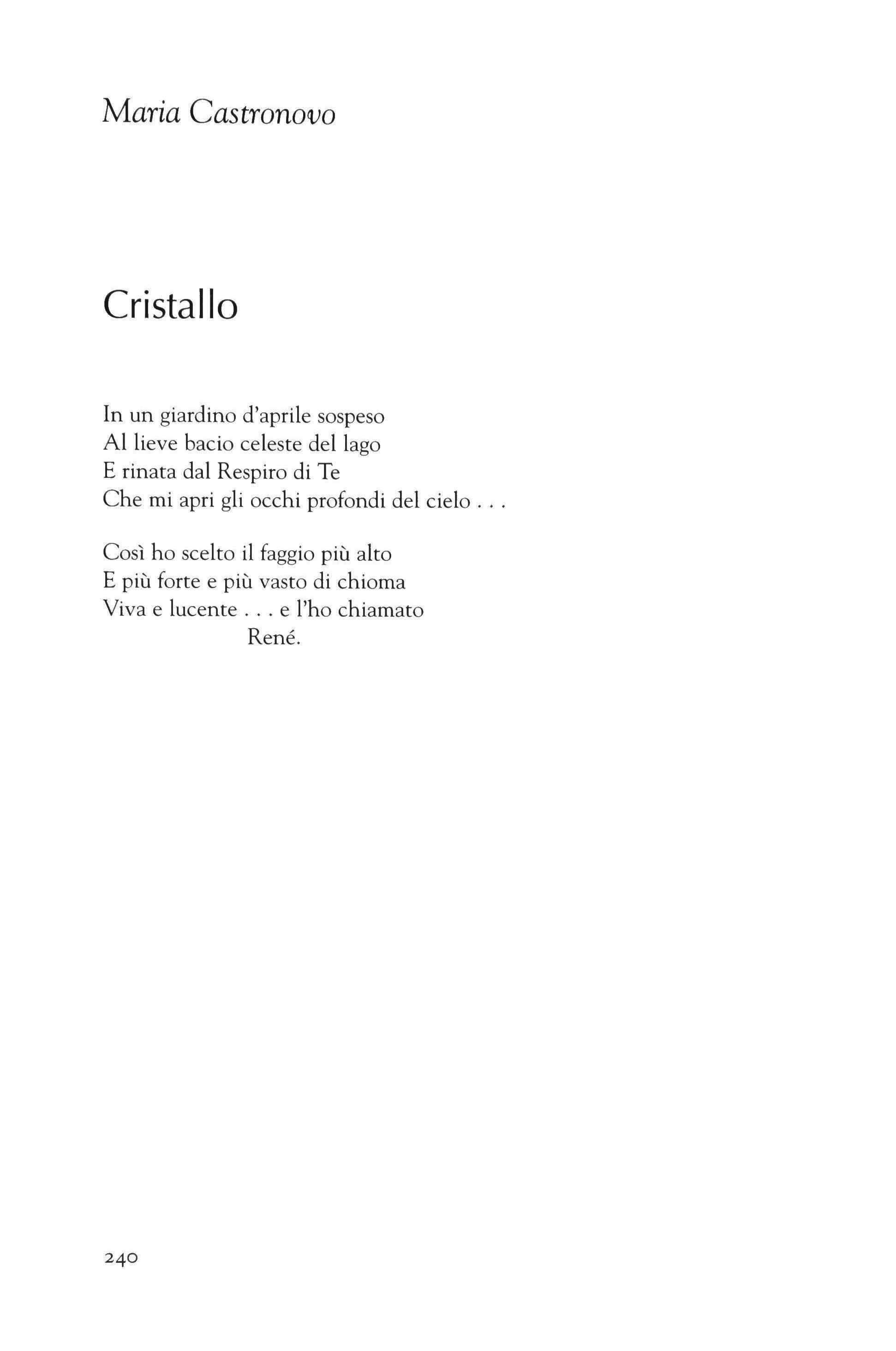 Maria Castronovo was born in 1953 in Venice. She is a professor of Literature and History. Her most recent publications include the essays Questi dorati orrori (2003), Viaggio in terra di poesia (2001), and the novels II Silenzio del Fauno (2004) and Sopta il primo fumo caldo (1997).