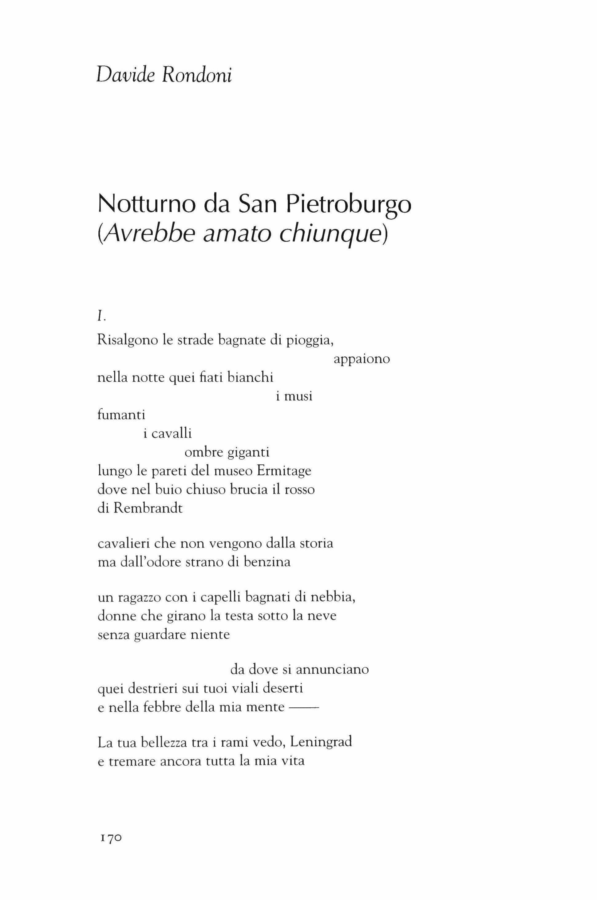 Davide Rondoni was born in Forll in 1964. He lives in Bologna, where he directs the Center for Contemporary Poetry at the Universita' di Bologna and edits the journal clanDestino and a number of poetry series by small presses. He has published many books of poems, beginning with La frontiera delle ginestre in 1985; his most recent books are Il Bar del Tempo, 1999, Avrebbe amato chiunque, 2003, Compianto, vita, 2004, and L'acqua visitata da1 fuoco, 2005.