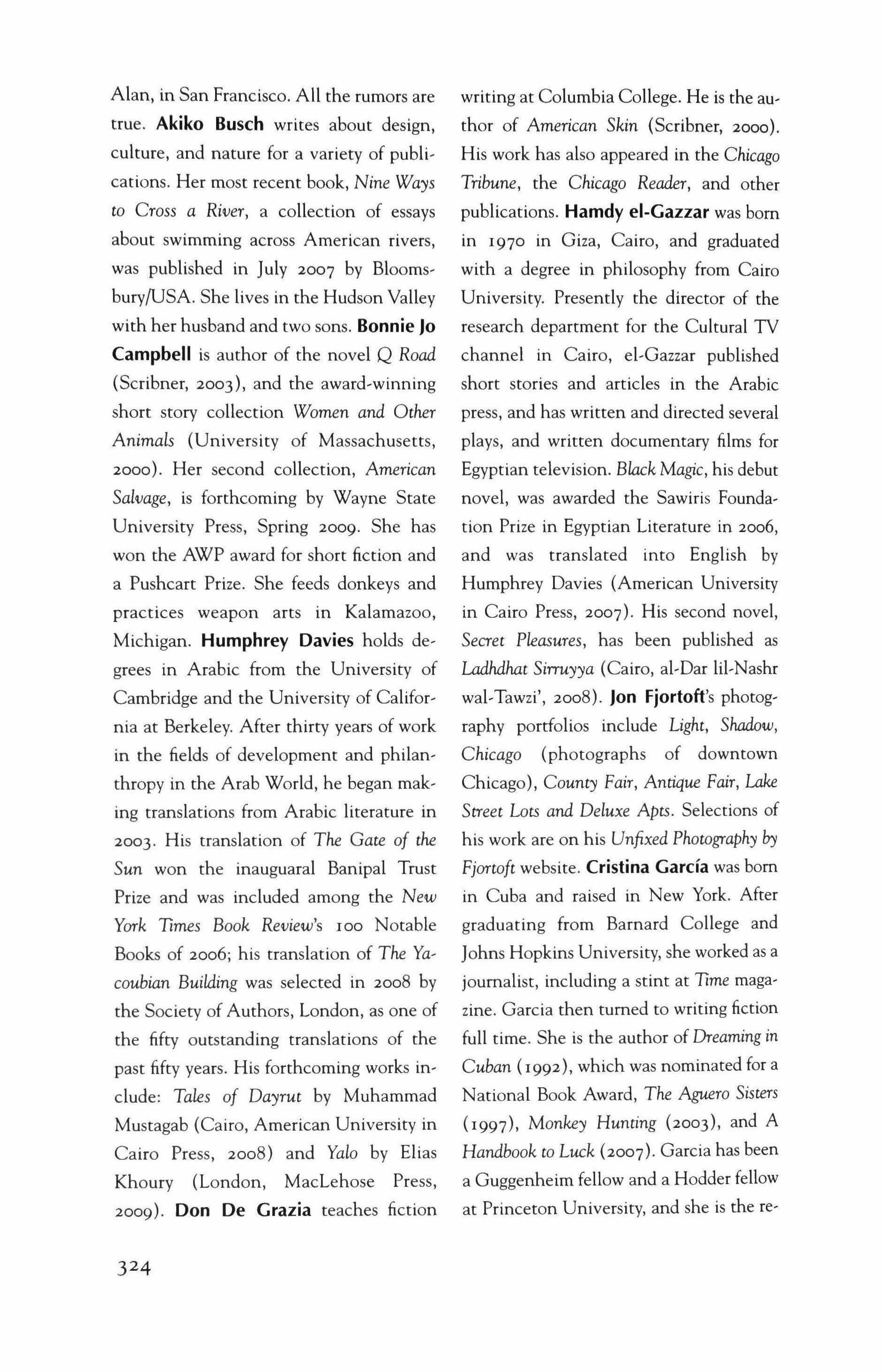writing at Columbia College. He is the author of American Skin (Scribner, 2000). His work has also appeared in the Chicago Tribune, the Chicago Reader, and other publications. Hamdy el-Gazzar was born in 1970 in Giza, Cairo, and graduated with a degree in philosophy from Cairo University. Presently the director of the research department for the Cultural TV channel in Cairo, el-Gazzar published short stories and articles in the Arabic press, and has written and directed several plays, and written documentary films for Egyptian television. Black Magic, his debut novel, was awarded the Sawiris Foundation Prize in Egyptian Literature in 2006, and was translated into English by Humphrey Davies (American University in Cairo Press, 2007). His second novel, Secret Pleasures, has been published as Ladhdhat Sirruyya (Cairo, al-Dar lil-Nashr wal-Tawzi', 2008). Jon Fjortoft's photography portfolios include Light, Shadow, Chicago (photographs of downtown Chicago), County Fair, Antique Fair, Lake Street Lots and Deluxe Apts. Selections of his work are on his Unfixed Photography by Fjortoft website. Cristina Garda was born in Cuba and raised in New York. After graduating from Barnard College and Johns Hopkins University, she worked as a journalist, including a stint at Time magazine. Garcia then turned to writing fiction full time. She is the author of Dreaming in Cuban (1992), which was nominated for a National Book Award, The Aguero Sisters (1997), Monkey Hunting (2003), and A Handbook to Luck (2007). Garcia has been a Guggenheim fellow and a Hodder fellow at Princeton University, and she is the re-
