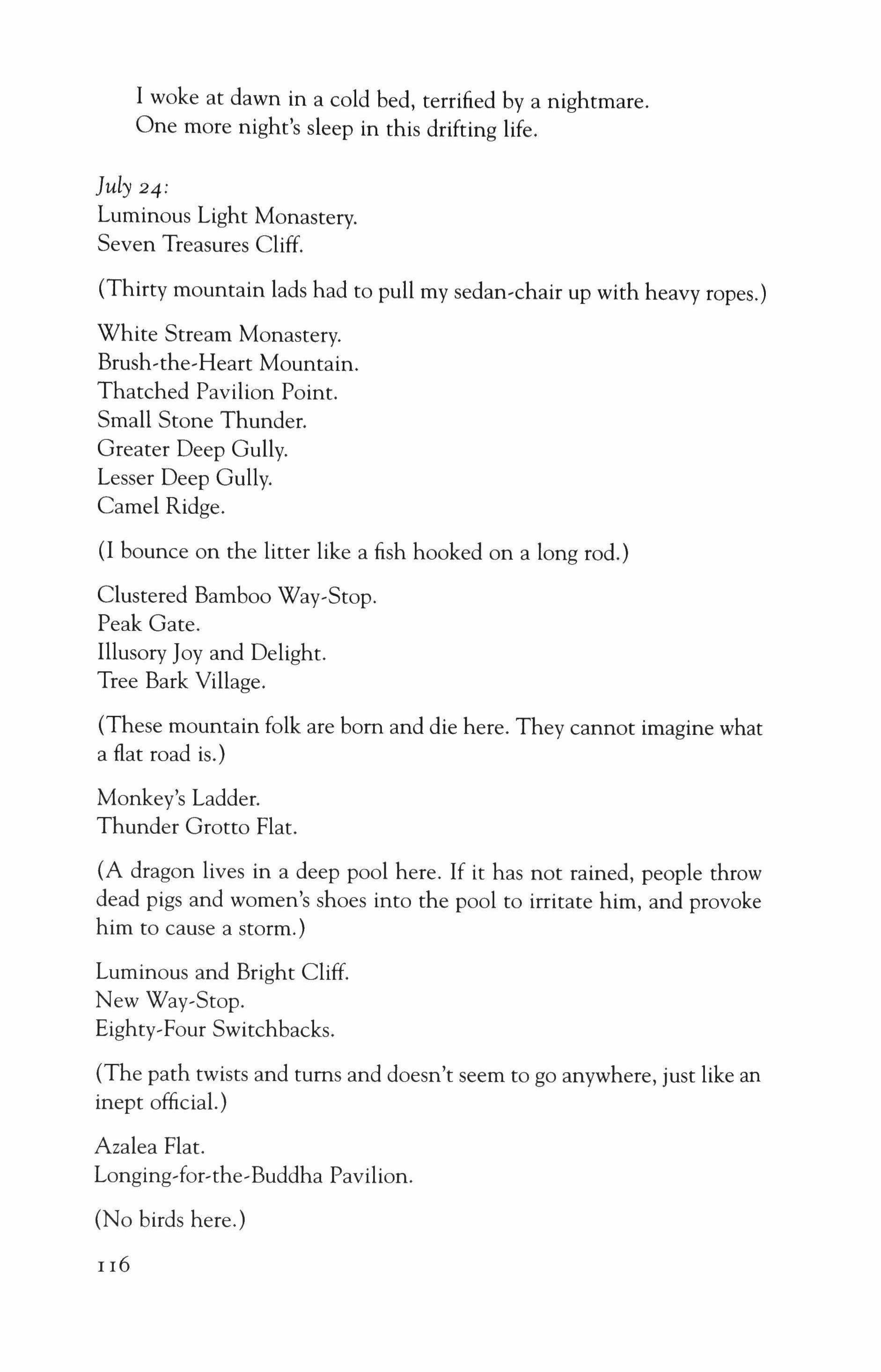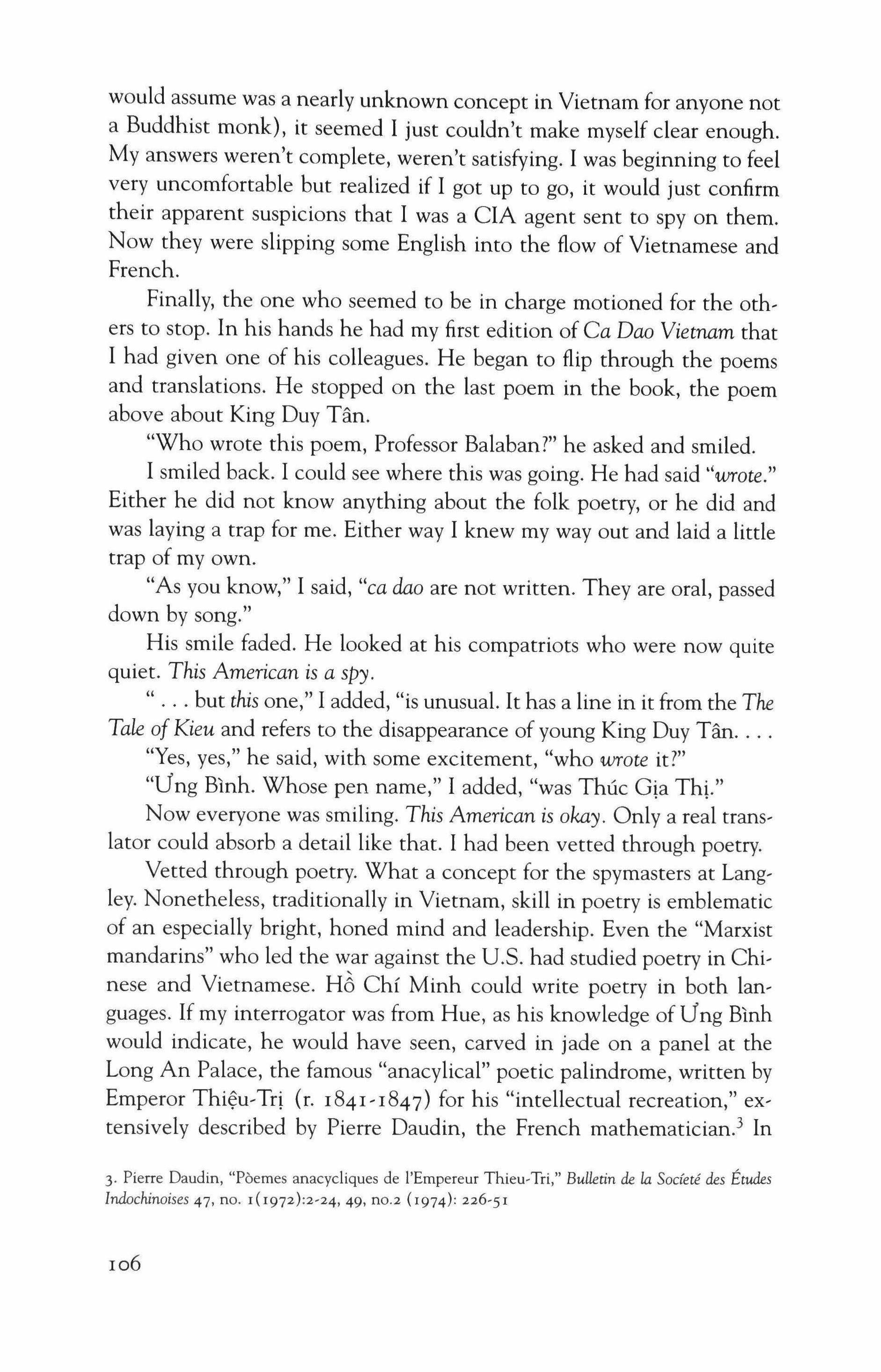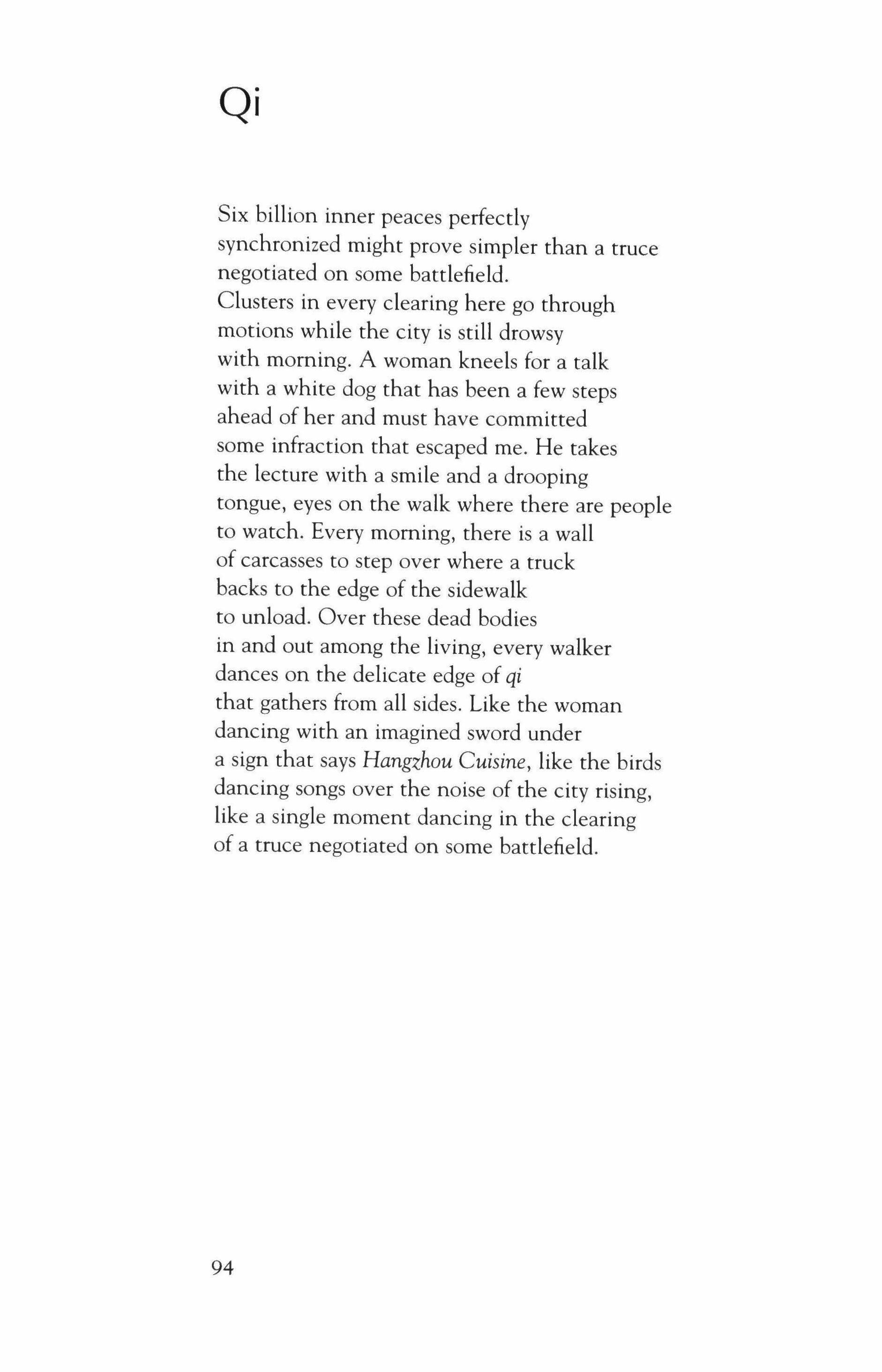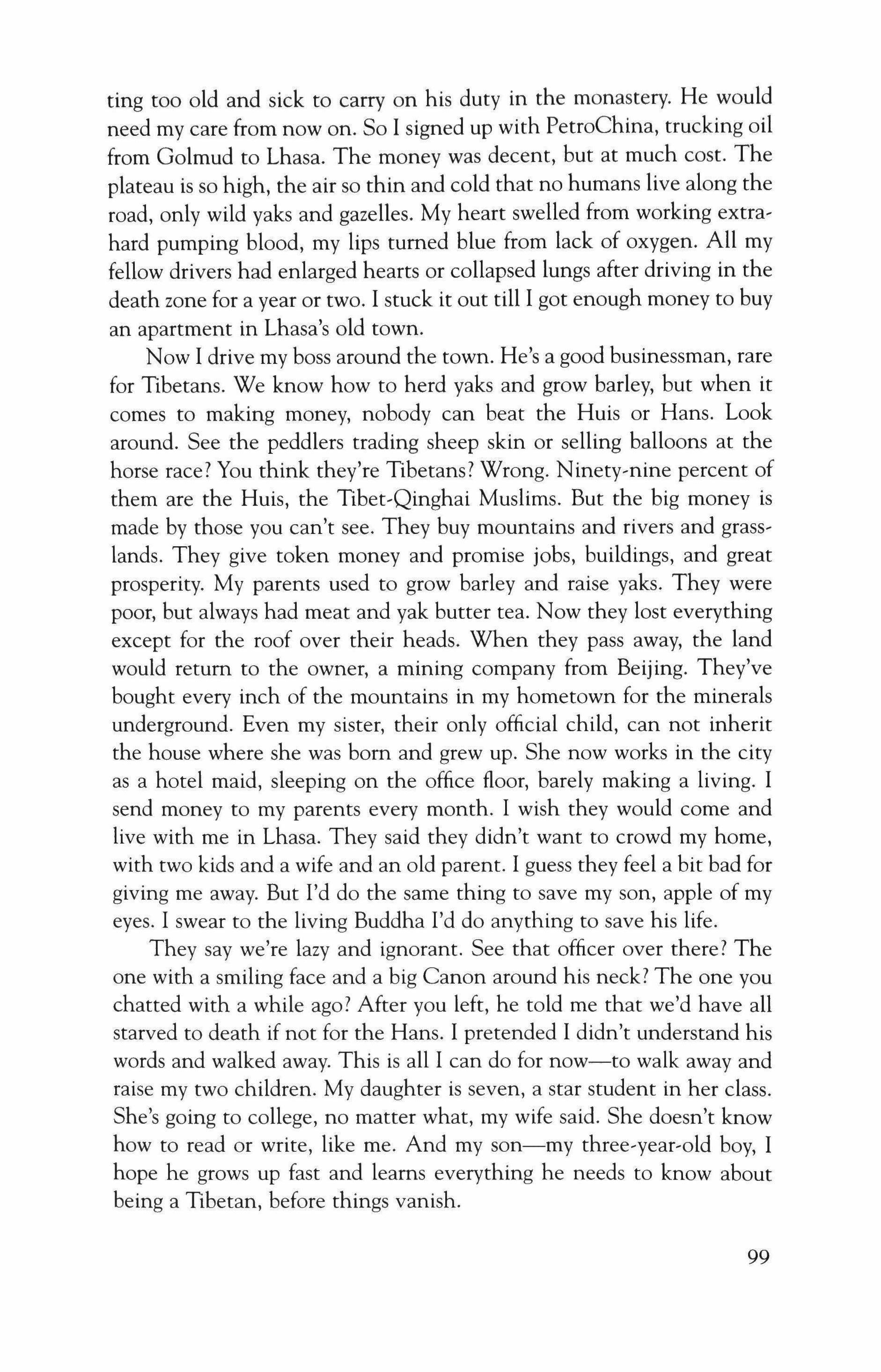 While many writers concentrate on home, others write of journeys. China is both destination and catalyst for Steven Schroeder's gracefully unnerving poems, two devastating short stories by Wang Ping, and Eliot Weinberger's poetic and sly travel essay. Poet, memoirist, and translator John Balaban takes us to Vietnam in his deeply affecting meditation on war, poetry, and healing. Philosopher and musician David Rothenberg, whose nonfiction books offer new insights into the songs of birds and whales, presents a work of fiction about a quest for wisdom in Norway wryly tided, "Is Your Journey Really Necessary?" Writing with stinging matter-of-factness, Daniel Rothenberg, of DePaul University's International Human Rights Law Institute, chronicles his quest for justice in real-life dispatches from Iraq.