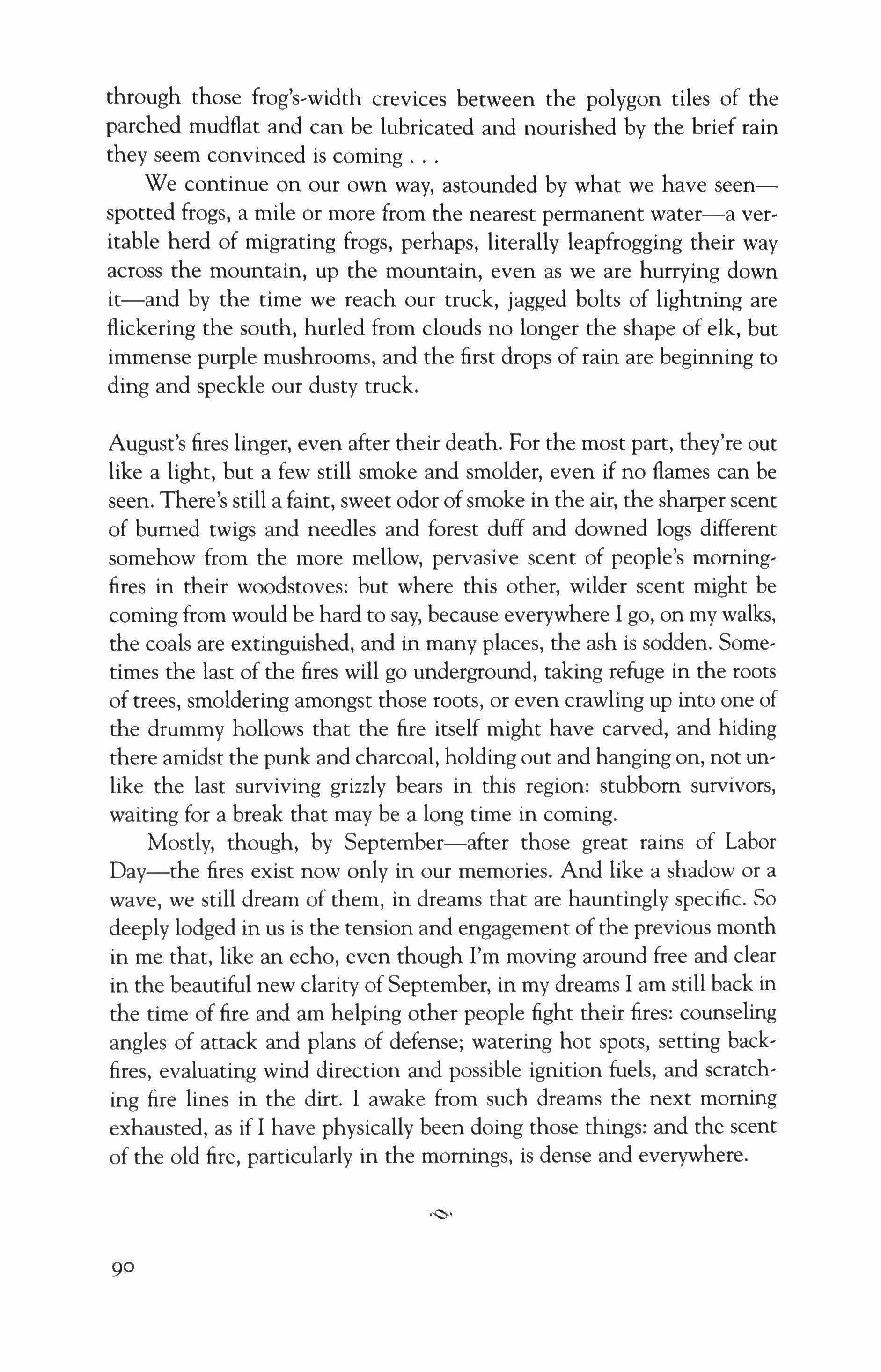 writing-ofdelving deeply into the life and history of a certain valley or desert, mountain, coast, river or pond-has been a key and increasingly urgent aspect of American letters as generation by generation we have heedlessly exploited, looted, and abused the living world. Rick Bass is an essential voice in praise and defense of the wild. His essay, "The Rains in September," is from a journal covering a year watching a cherished Montana marsh. Alison Swan writes in a similar vein about a small bedrock island in Lake Superior, and Akiko Busch chronicles the impact of an invasive species in the Hudson River. Each of these attentive and knowledgeable writers reveals dimensions of life most of us never detect.