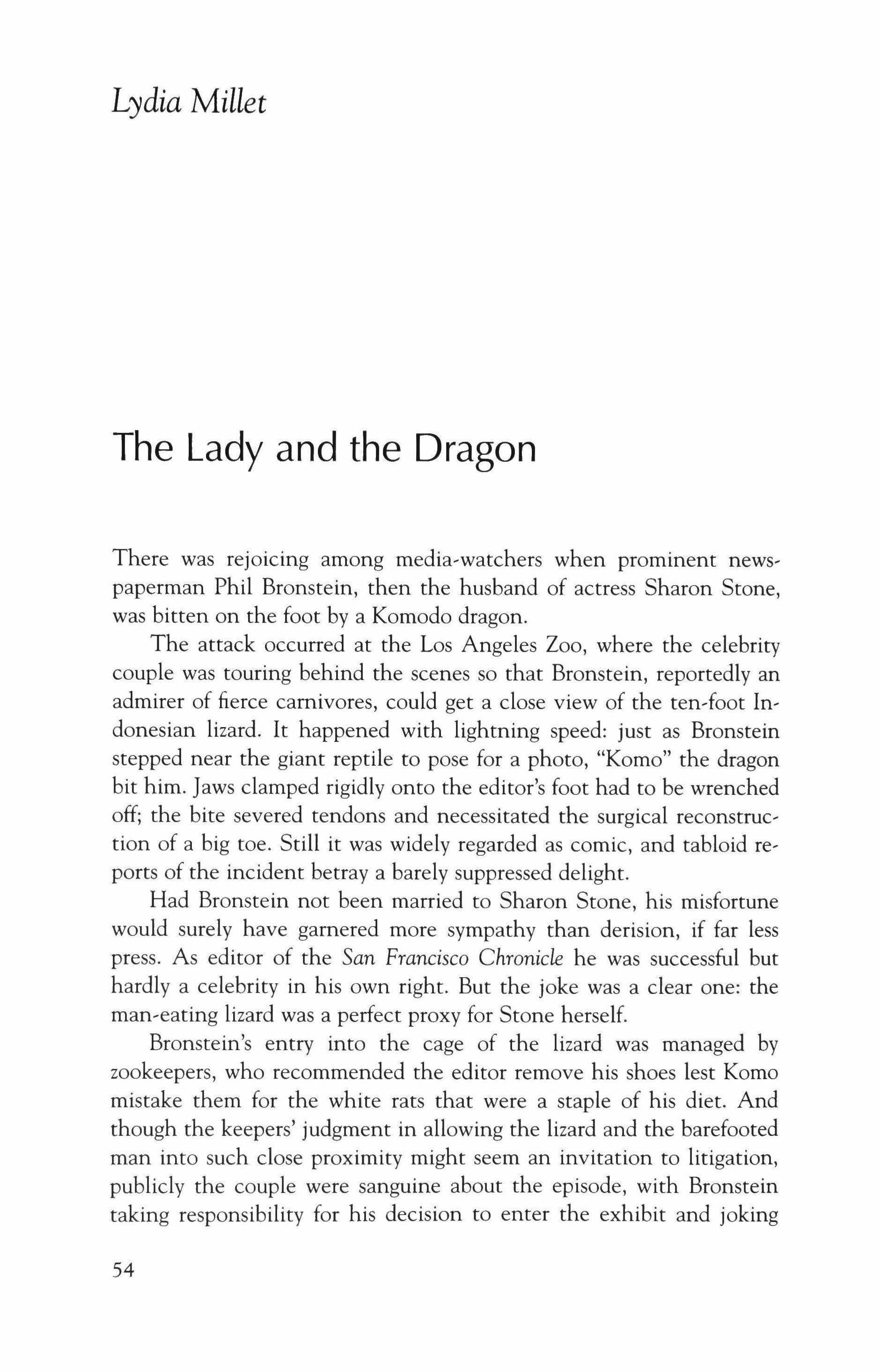 This is a landscape and mindscape David Treuer knows well, and he takes us there in "Hard Body," a wrenching short story about a soldier back from Iraq working as an ambulance driver on an Indian reservation. Kate Braverman is also attuned to the shadow side of human endeavors, and fuses a radioactive lyricism with a cauterizing view of societal ills in "Autumn Alchemy," a short story about a mercenary molecular biologist who undergoes a radical metamorphosis. A Komodo dragon, Sharon Stone, and an Indonesian billionaire convene in "The Lady and the Dragon," a shattering story by Lydia Millet, a writer who conducts eviscerating moral and spiritual inquiries in fiction that melds sorrow and wit, sensuous realism and precise satire. In Egyptian writer Hamdy el-Gazzar's riveting tale, "Two Killings," one man's need to make a living, and his longing to make something of himself, turn treacherous in a land poisoned by violence and corruption. Set a world away in Chicago, Barry Lopez's stabbing story, "Hidian," is also an intense first-person tale about a man in trouble, albeit in a more subtly bankrupt society.