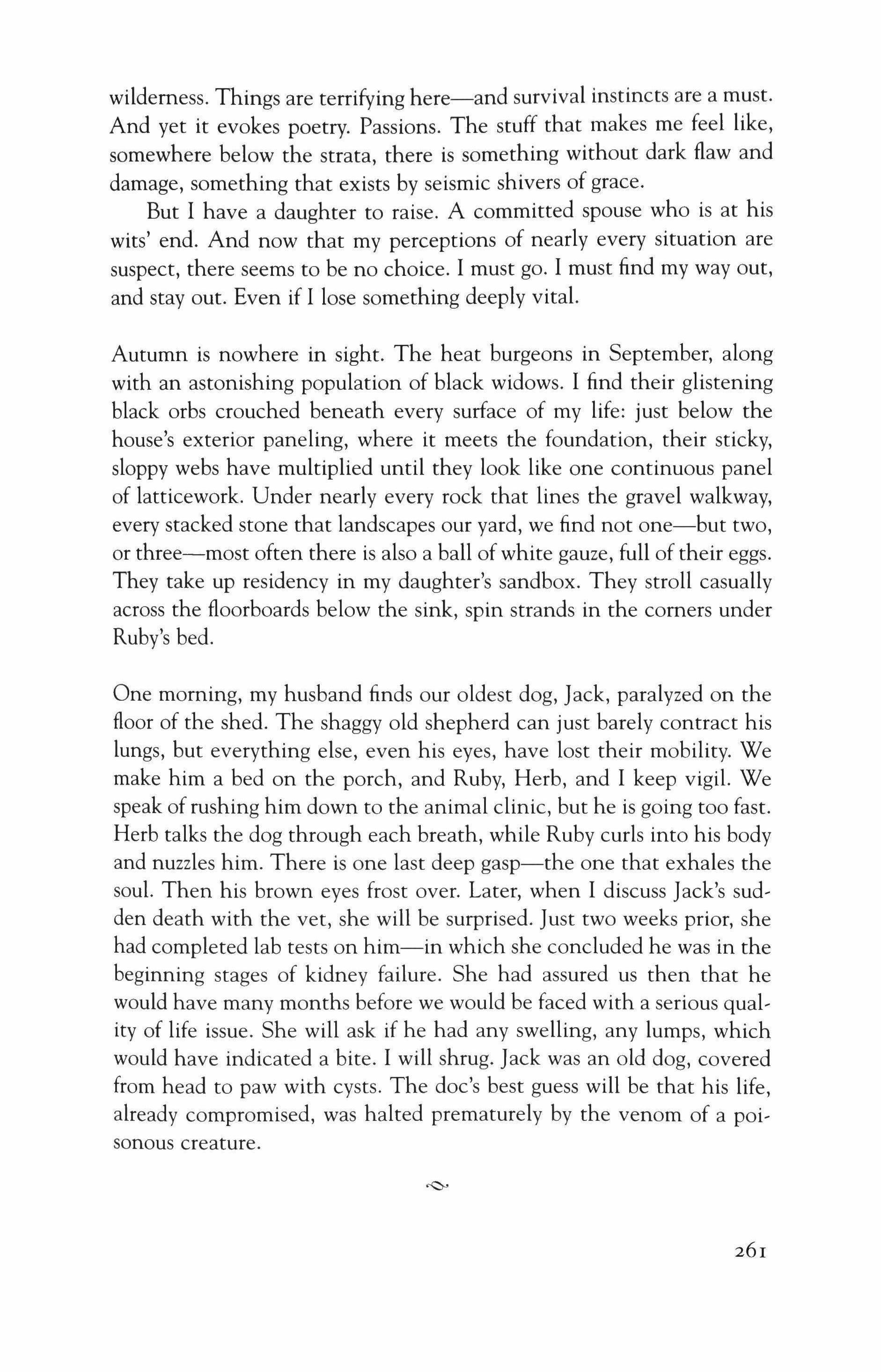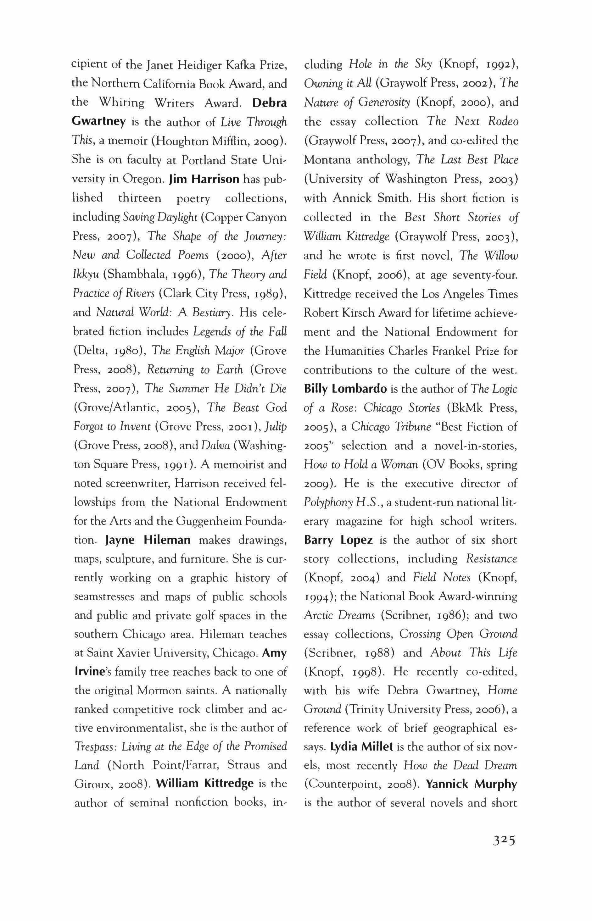 cipient of the Janet Heidiger Kafka Prize, the Northern California Book Award, and the Whiting Writers Award. Debra Gwartney is the author of Live Through This, a memoir (Houghton Mifflin, 2009). She is on faculty at Portland State University in Oregon. Jim Harrison has published thirteen poetry collections, including SavingDaylight (Copper Canyon Press, 2007), The Shape of the Journey: New and Collected Poems (2000), After Ikkyu (Shambhala, 1996), The Theory and Practice of Rivers (Clark City Press, 1989), and Natural World: A Bestiary. His celebrated fiction includes Legends of the Fall (Delta, 1980), The English Major (Grove Press, 2008), Returning to Earth (Grove Press, 2007), The Summer He Didn't Die (Grove/Atlantic, 2005), The Beast God Forgot to Invent (Grove Press, 2001), JuliP (Grove Press, 2008), and Dalva (Washington Square Press, 1991). A memoirist and noted screenwriter, Harrison received fellowships from the National Endowment for the Arts and the Guggenheim Foundation. Jayne Hileman makes drawings, maps, sculpture, and furniture. She is currently working on a graphic history of seamstresses and maps of public schools and public and private golf spaces in the southern Chicago area. Hileman teaches at Saint Xavier University, Chicago. Amy Irvine's family tree reaches back to one of the original Mormon saints. A nationally ranked competitive rock climber and active environmentalist, she is the author of Trespass: Living at the Edge of the Promised Land (North Point/Farrar, Straus and Giroux, 2008). William Kittredge is the author of seminal nonfiction books, in-