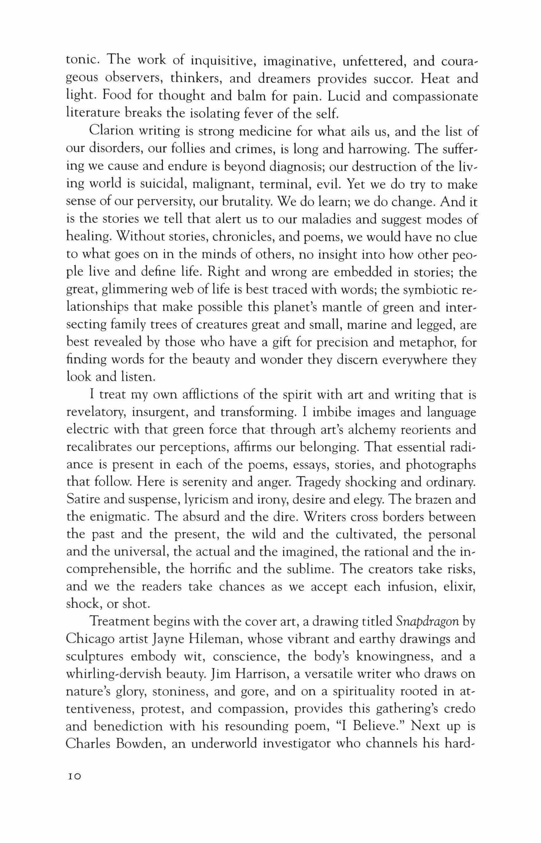 Treatment begins with the cover art, a drawing titled Snapdragon by Chicago artist Jayne Hileman, whose vibrant and earthy drawings and sculptures embody wit, conscience, the body's knowingness, and a whirling-dervish beauty. Jim Harrison, a versatile writer who draws on nature's glory, stoniness, and gore, and on a spirituality rooted in attentiveness, protest, and compassion, provides this gathering's credo and benediction with his resounding poem, "I Believe." Next up is Charles Bowden, an underworld investigator who channels his hard-