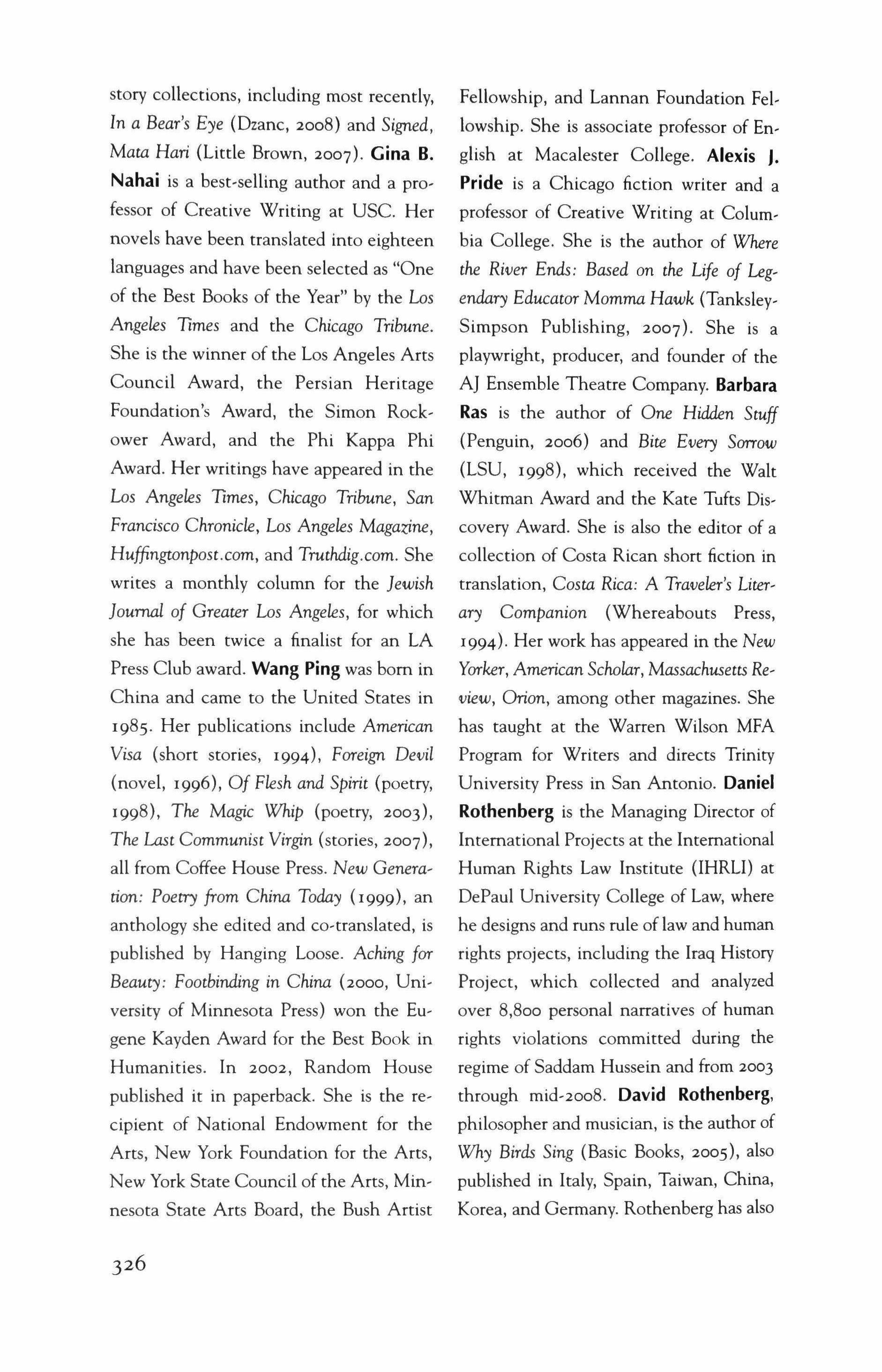 story collections, including most recently, In a Bear's Eye (Dzanc, 2008) and Signed, Mata Hari (Little Brown, 2007). Gina B. Nahai is a best-selling author and a professor of Creative Writing at USc. Her novels have been translated into eighteen languages and have been selected as "One of the Best Books of the Year" by the Los Angeles Times and the Chicago Tribune. She is the winner of the Los Angeles Arts Council Award, the Persian Heritage Foundation's Award, the Simon Rockower Award, and the Phi Kappa Phi Award. Her writings have appeared in the Los Angeles Times, Chicago Tribune, San Francisco Chronicle, Los Angeles Magazine, HuffingwnposLcom, and Truthdig.com. She writes a monthly column for the Jewish Journal of Greater Los Angeles, for which she has been twice a finalist for an LA Press Club award. Wang Ping was born in China and came to the United States in 1985. Her publications include American Visa (short stories, 1994), Foreign Devil (novel, 1996), Of Flesh and Spirit (poetry, 1998), The Magic Whip (poetry, 2003), The Last Communist Virgin (stories, 2007), all from Coffee House Press. New Generation: Poetry from China Today (1999), an anthology she edited and co-translated, is published by Hanging Loose. Aching for Beauty: Footbinding in China (2000, University of Minnesota Press) won the Eugene Kayden Award for the Best Book in Humanities. In 2002, Random House published it in paperback. She is the recipient of National Endowment for the Arts, New York Foundation for the Arts, New York State Council of the Arts, Minnesota State Arts Board, the Bush Artist