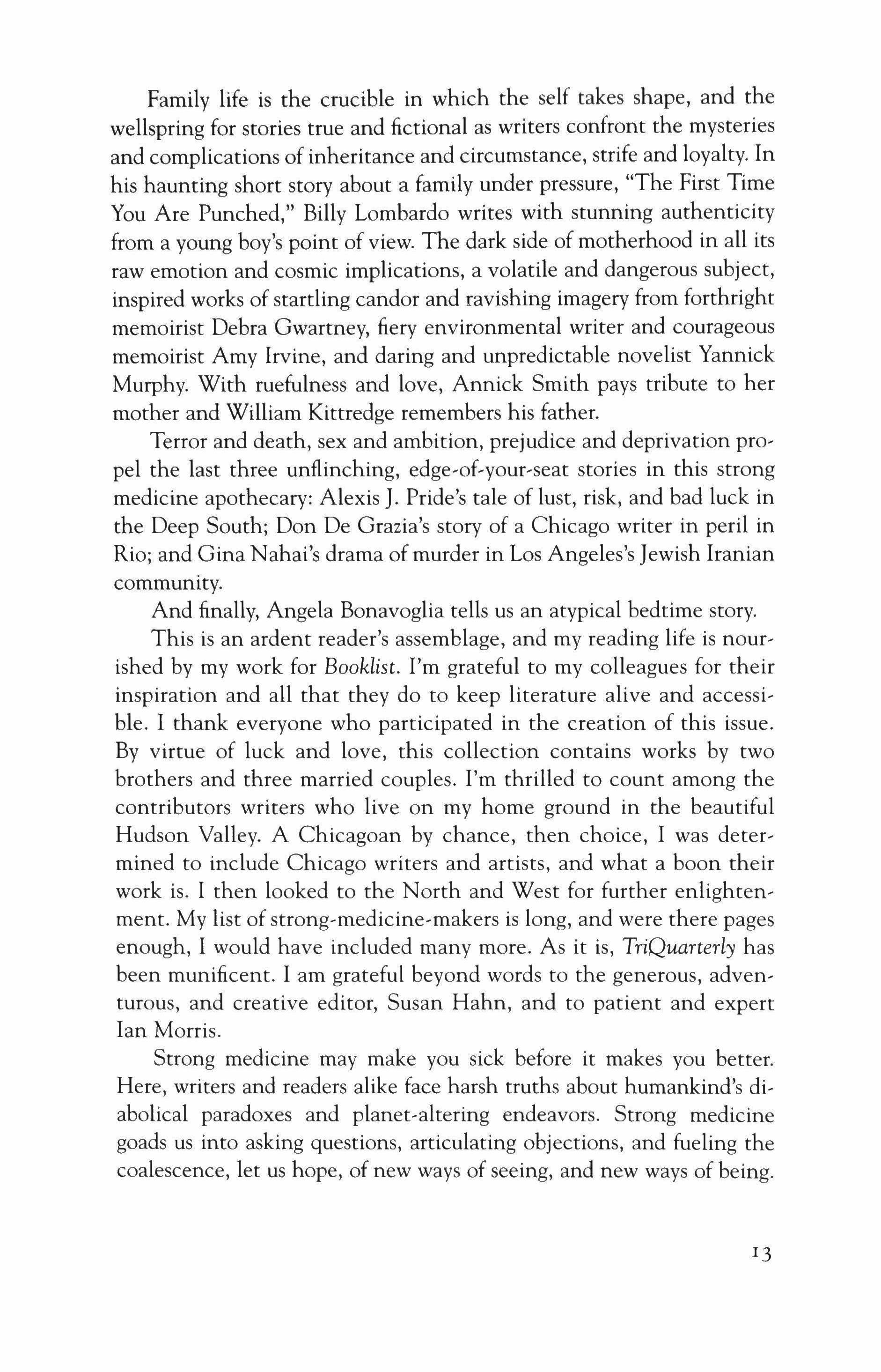My respect for the mystery implicit in creativity runs high, so I decided not to interfere with the process in my role as guest editor for this brimming issue of TriQuarterly. I did not name a theme, or assign a topic. Instead, I sought out writers who see life whole, who are curious about the interconnectivity and complexity of existence, and who care, deeply and unabashedly, about the world. When asked what I was looking for, I simply said, "strong medicine."