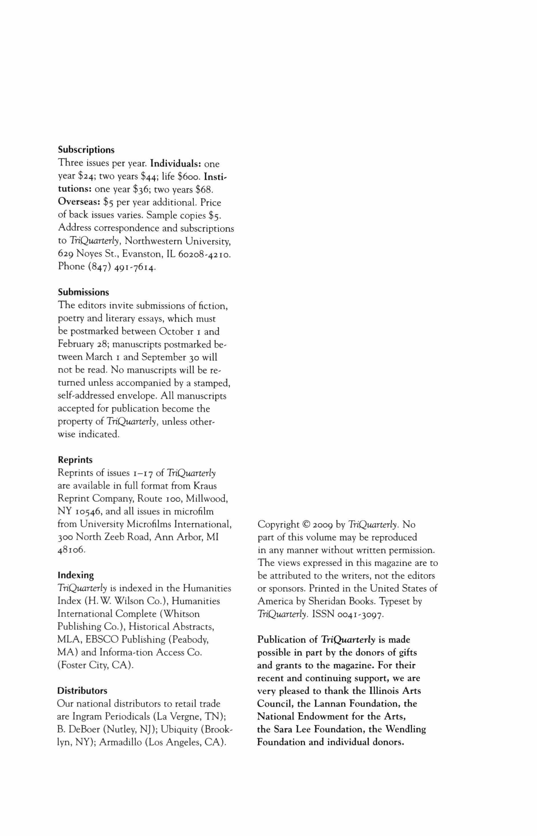 Copyright © 2009 by TriQuarterly. No part of this volume may be reproduced in any manner without written permission. The views expressed in this magazine are to be attributed to the writers, not the editors or sponsors. Printed in the United States of America by Sheridan Books. Typeset by TriQuarterly. ISSN 0041-3097.