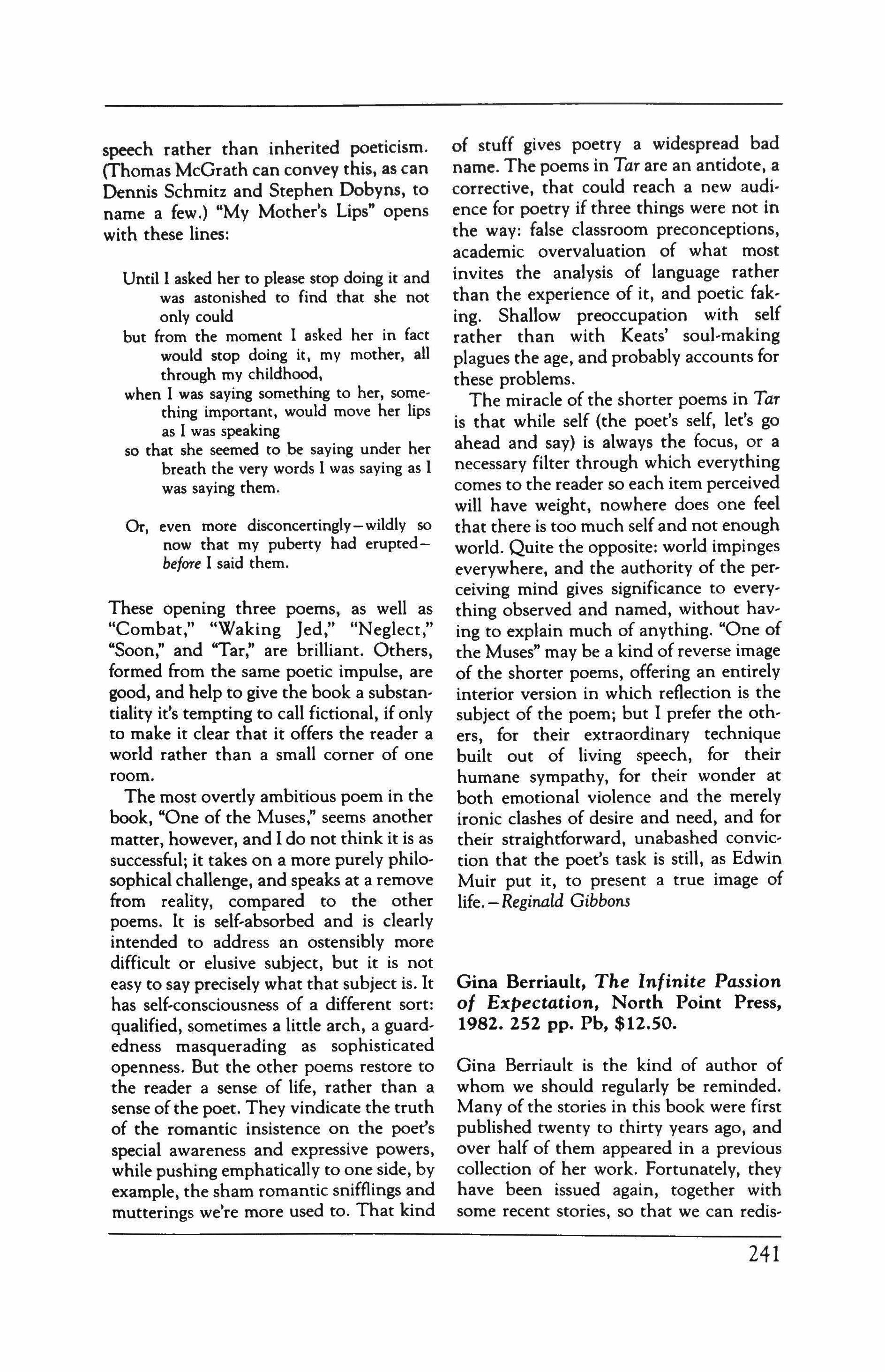 Arcadio, William Goyen; The Succession: A Novel of Elizabeth and James, George Garrett; Tar, C.K. Williams; The Infinite Passion of Expectation, Gina Berriault; Works and Days, David Schubert