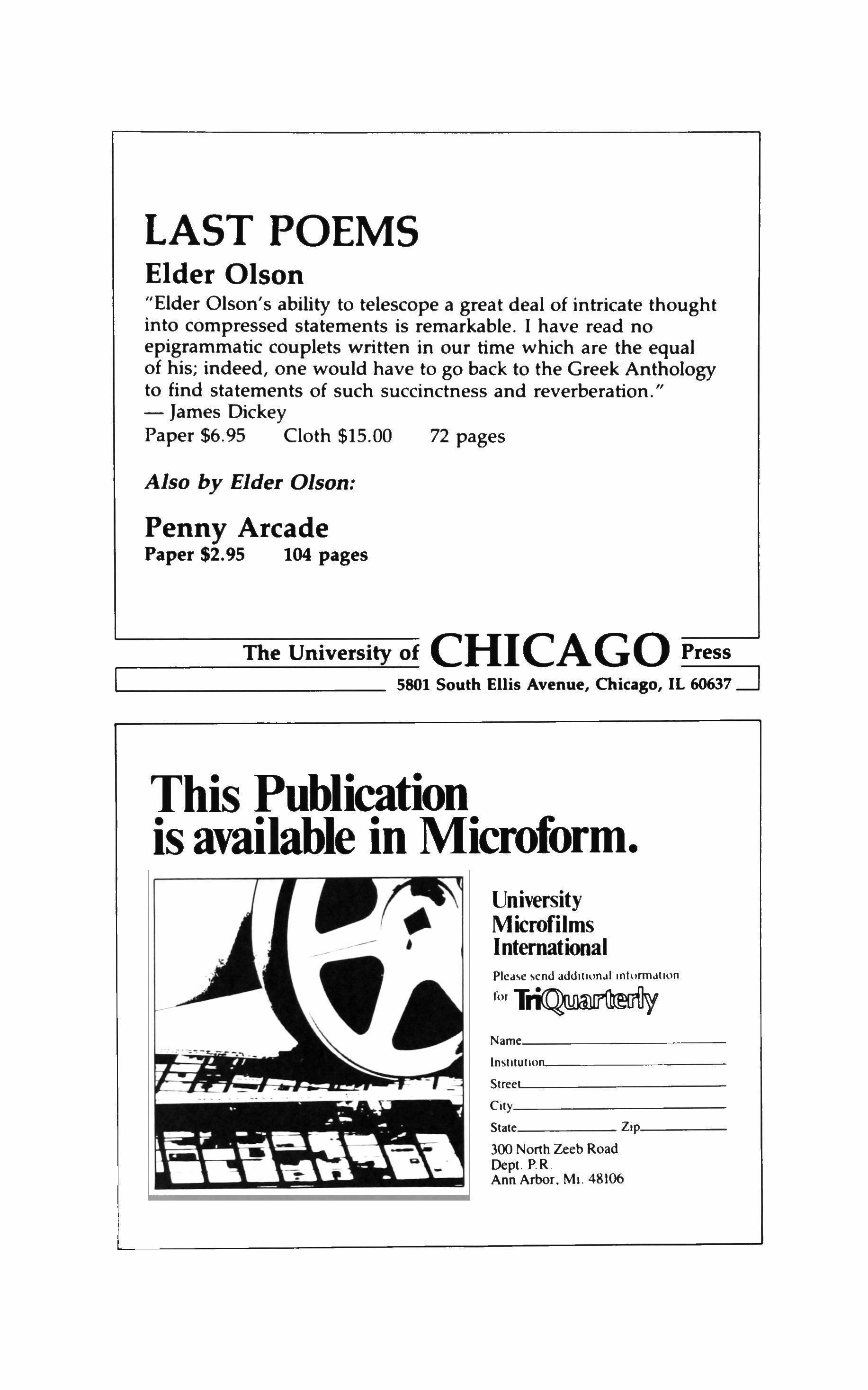 Reprints of issues #1-15 of TriQuarterly are available in full format from Kraus Reprint Company, Route 100, Millwood, New York 10546, and all issues in microfilm from University Microfilms International, 300 North Zeeb Road, Ann Arbor, Michigan 48106. ISSN: 0041-3097.