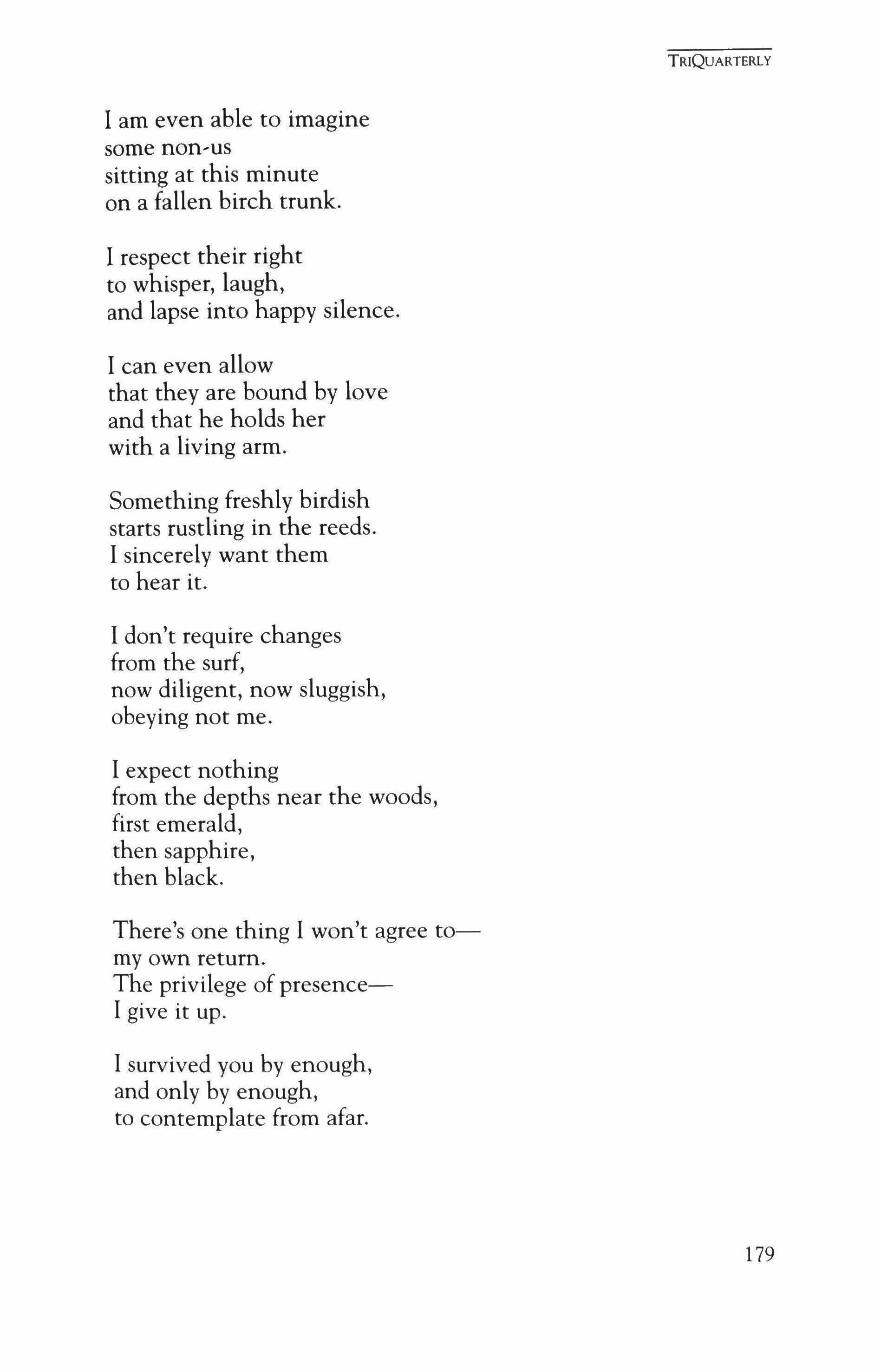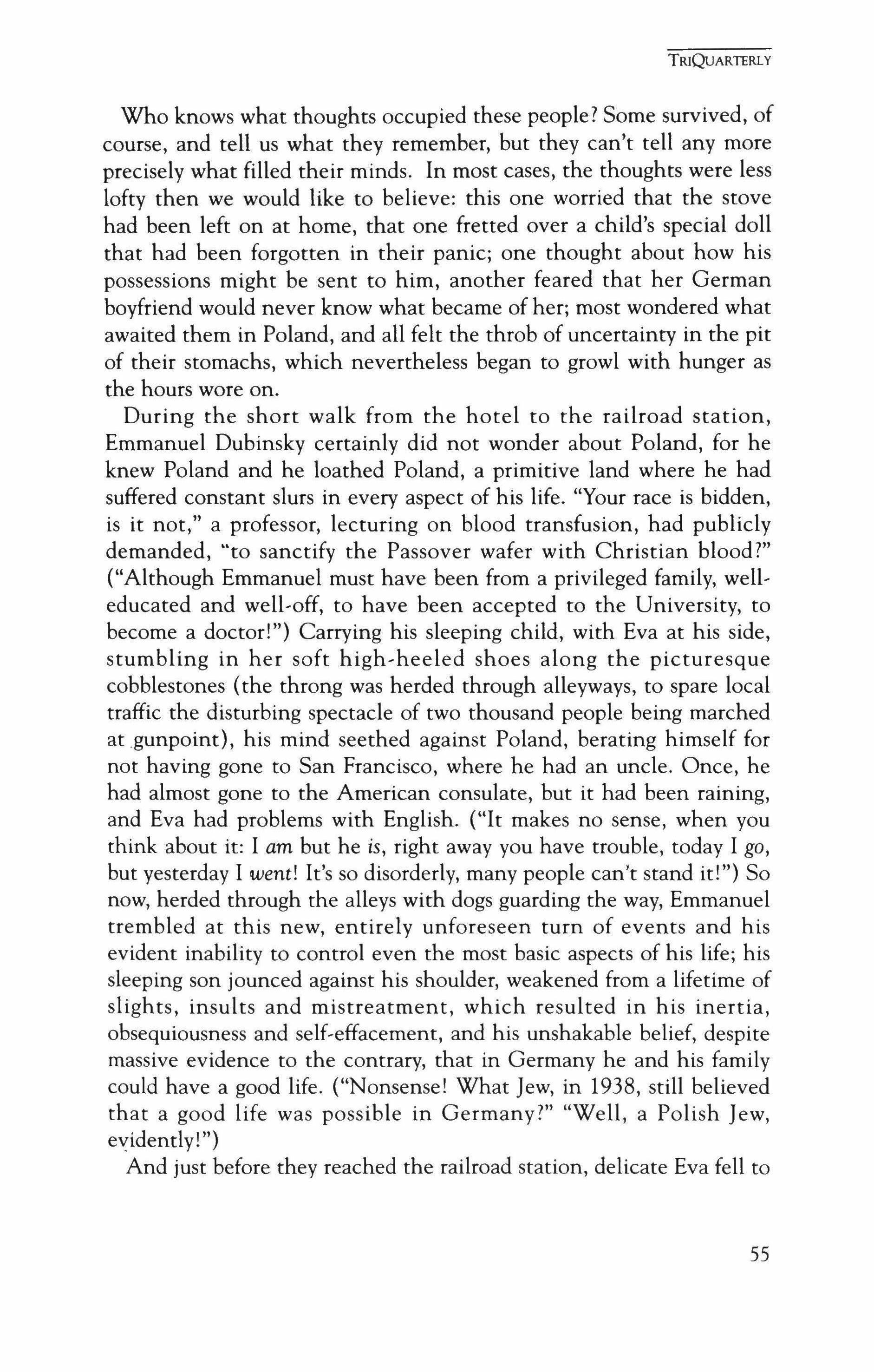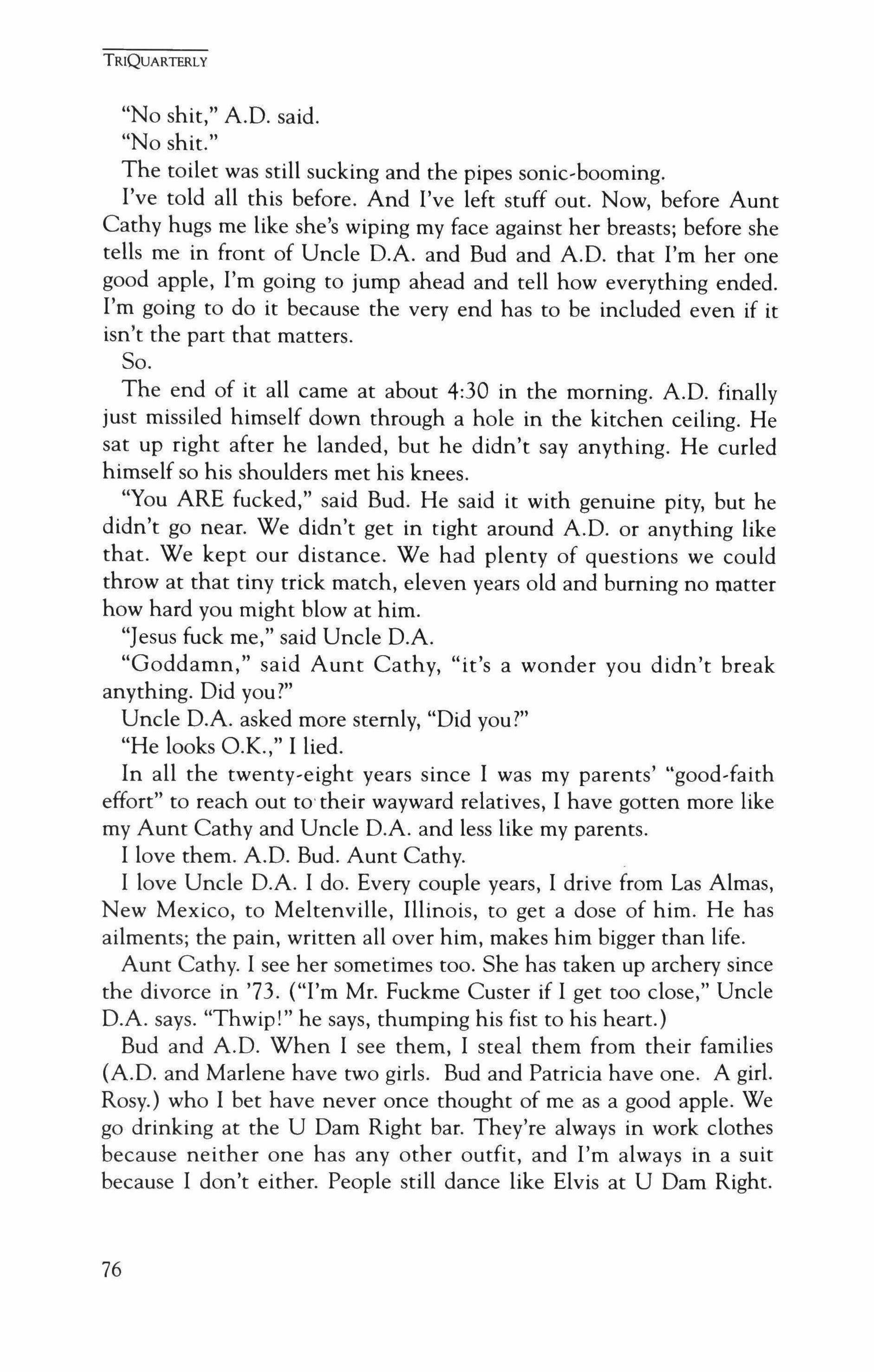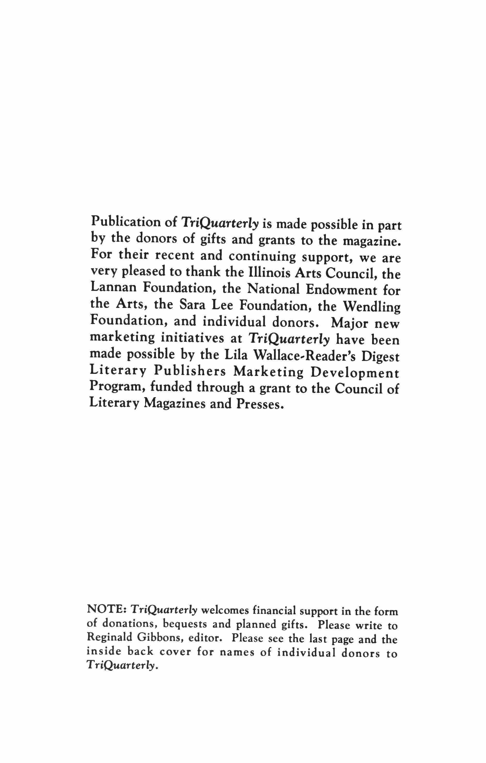 Publication of TriQuarterly is made possible in part by the donors of gifts and grants to the magazine. For their recent and continuing support, we are very pleased to thank the Illinois Arts Council, the Lannan Foundation, the National Endowment for the Arts, the Sara Lee Foundation, the Wendling Foundation, and individual donors. Major new marketing initiatives at TriQuarterly have been made possible by the Lila Wallace Reader's Digest Literary Publishers Marketing Development Program, funded through a grant to the Council of Literary Magazines and Presses.