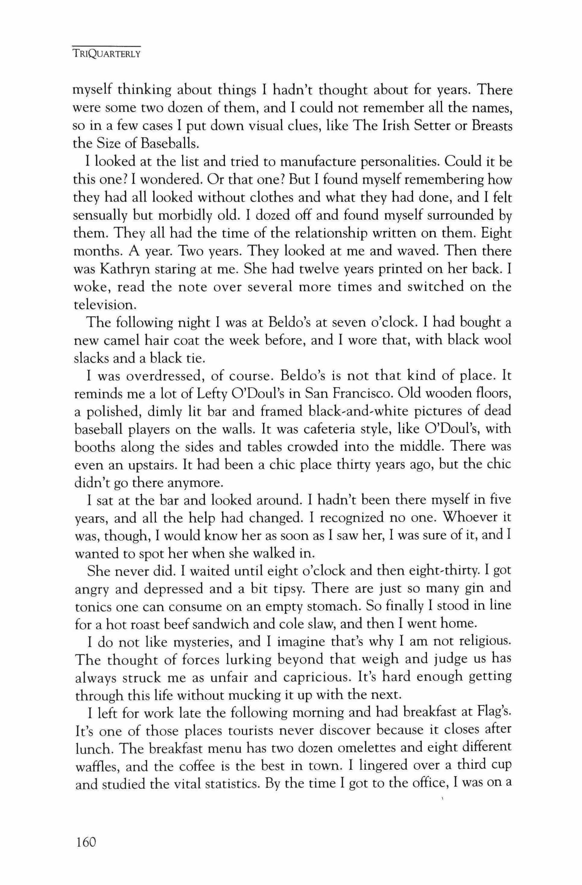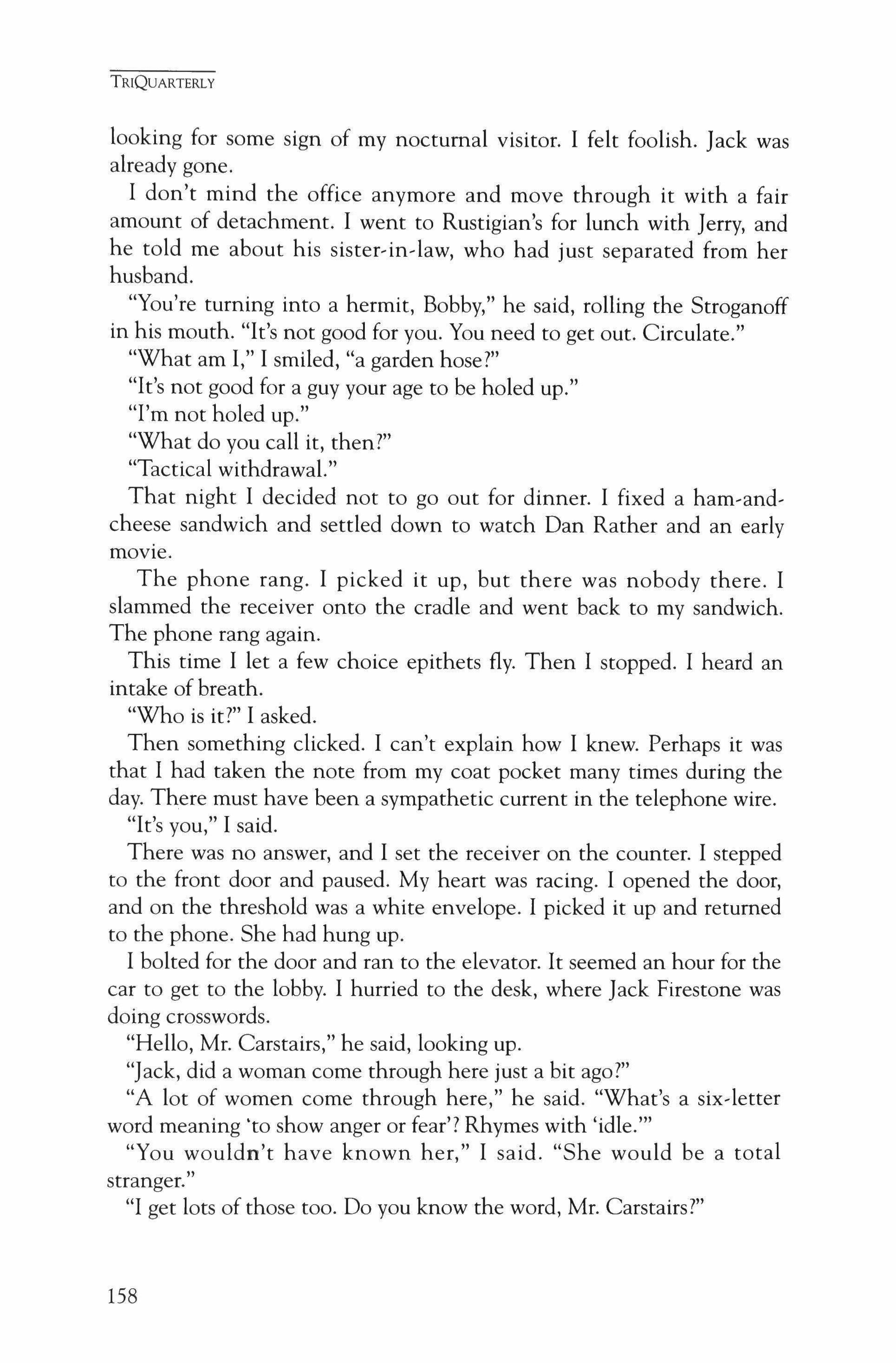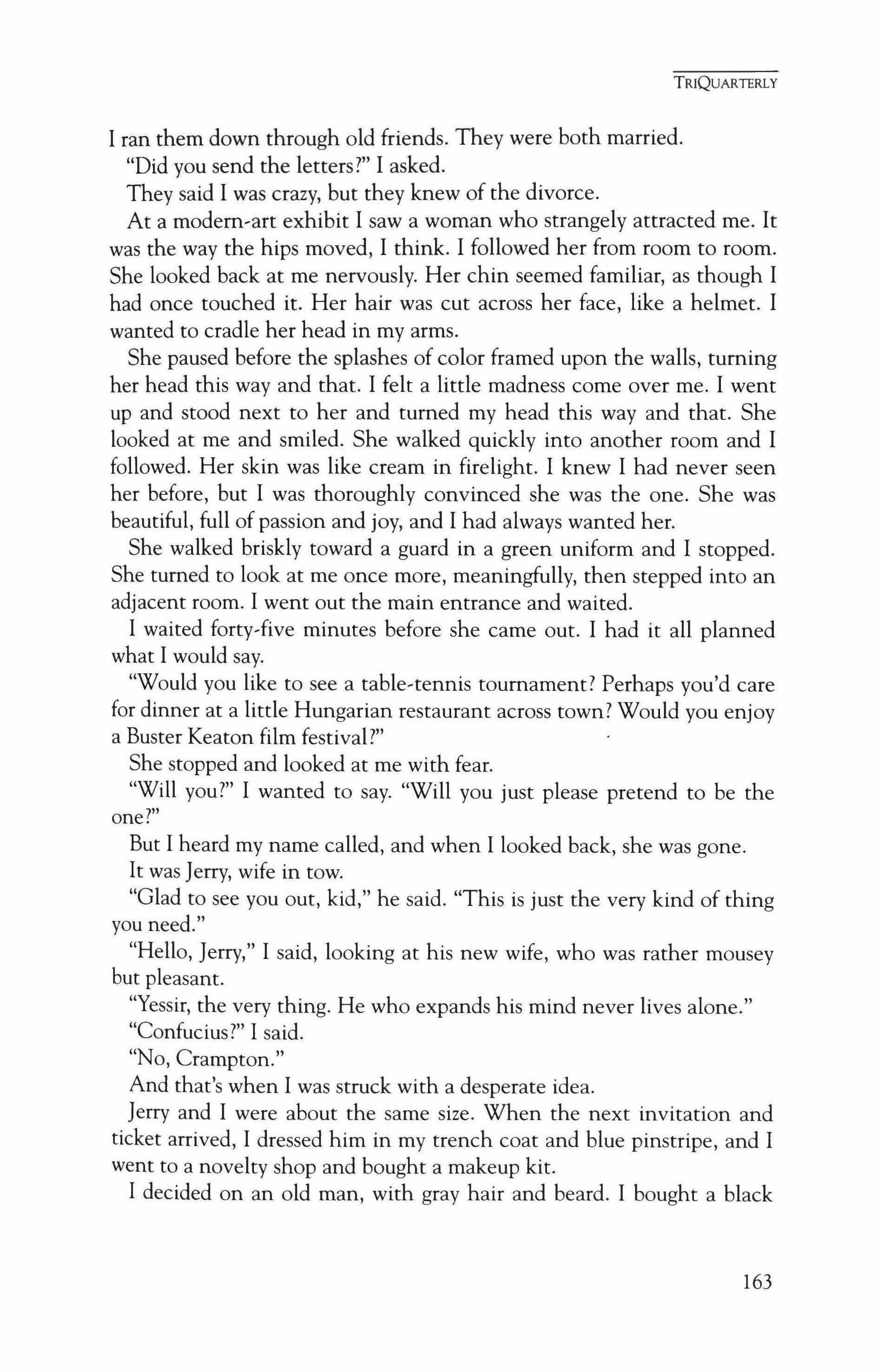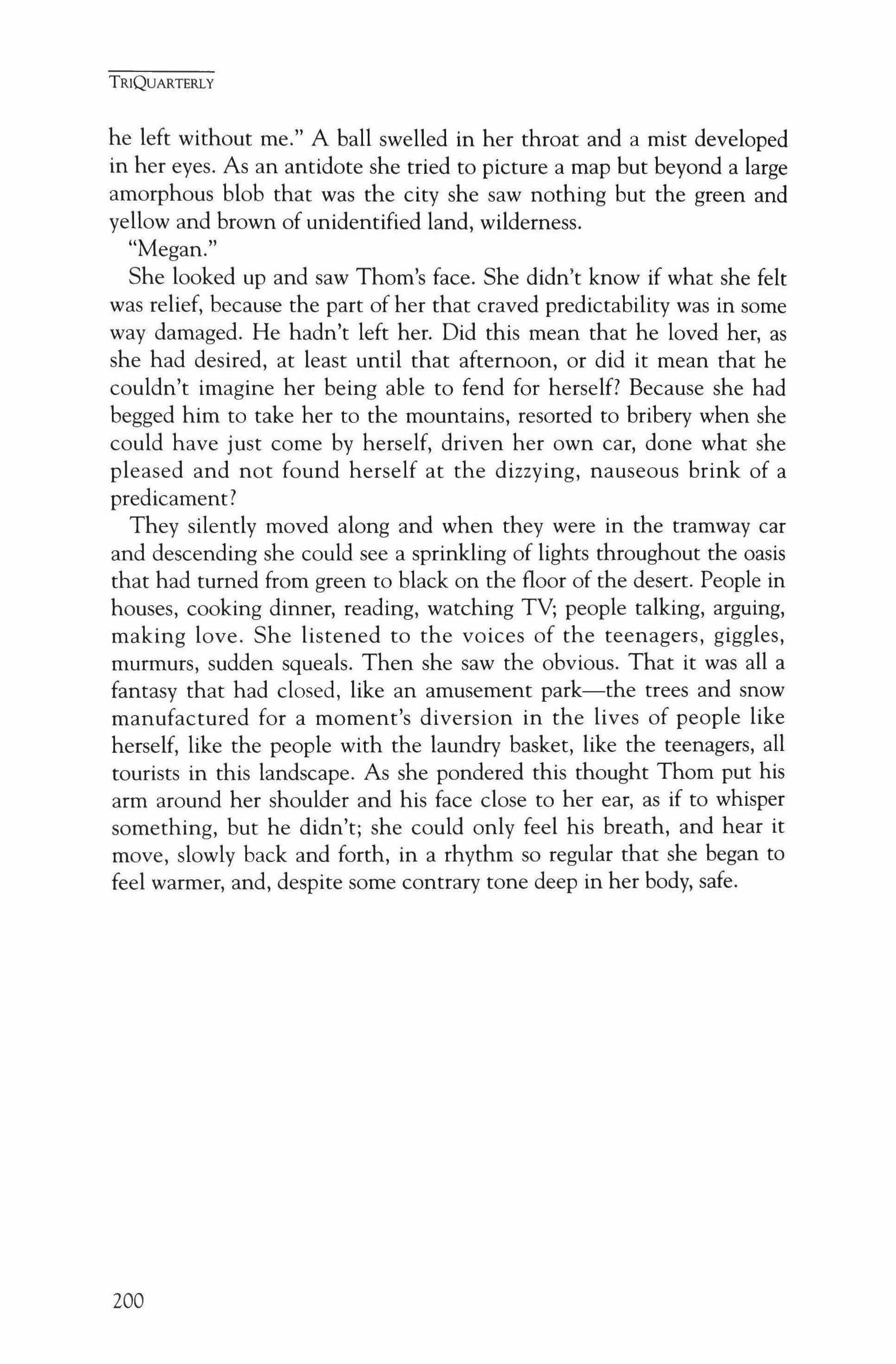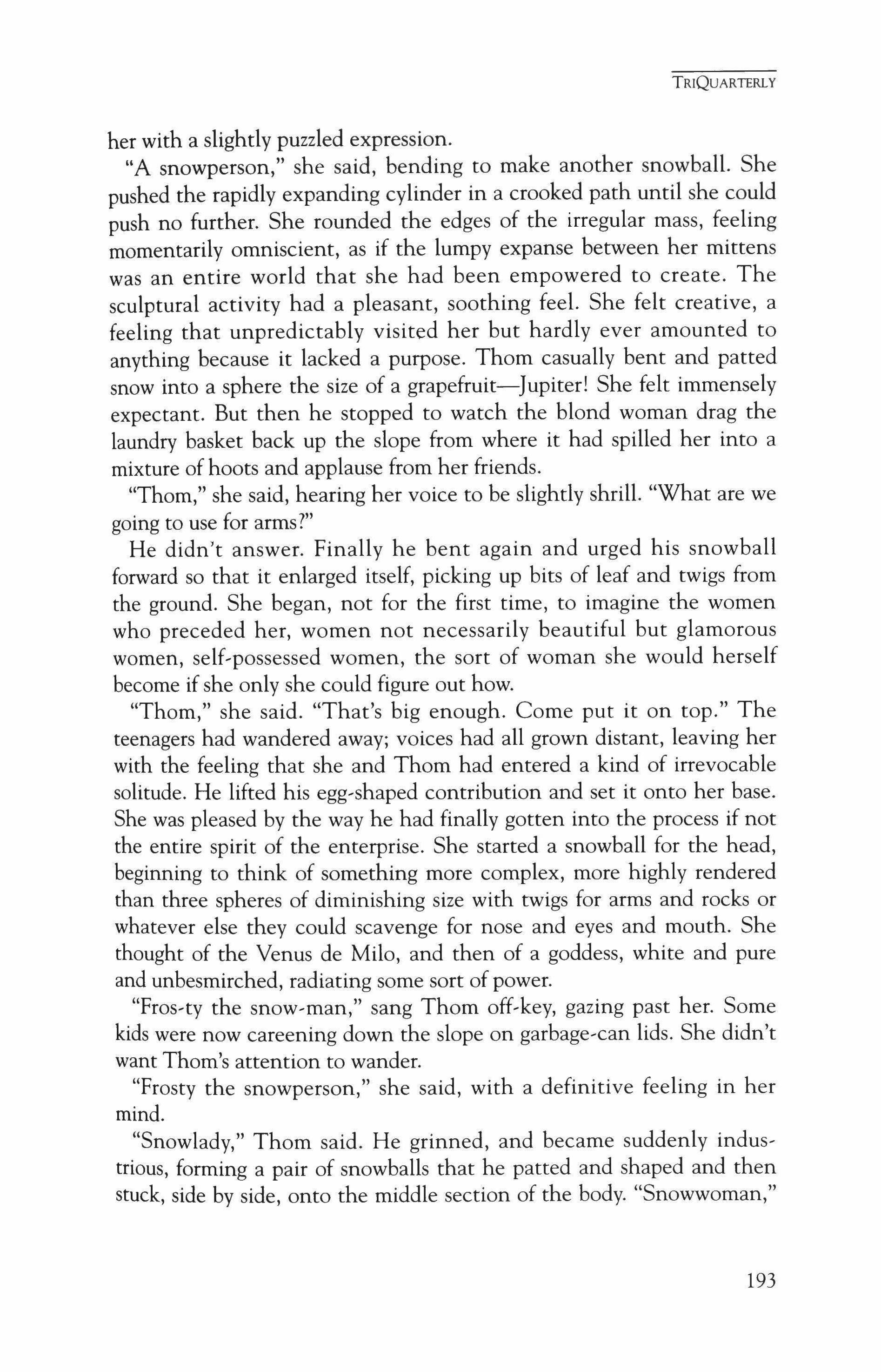 Publication of TriQuarterly is made possible in part by the donors of gifts and grants to the magazine. For their recent and continuing support, we are very pleased to thank the Illinois Arts Council, the Lannan Foundation, the John D. and Catherine T. MacArthur Foundation, the National Endowment for the Arts, the Sara Lee Foundation, the Wendling Foundation, and individual donors. Major new marketing initiatives at TriQuarterly have been made possible by the Lila Wallace,Reader's Digest Literary Publishers Marketing Development Program, funded through a grant to the Council of Literary Magazines and Presses.