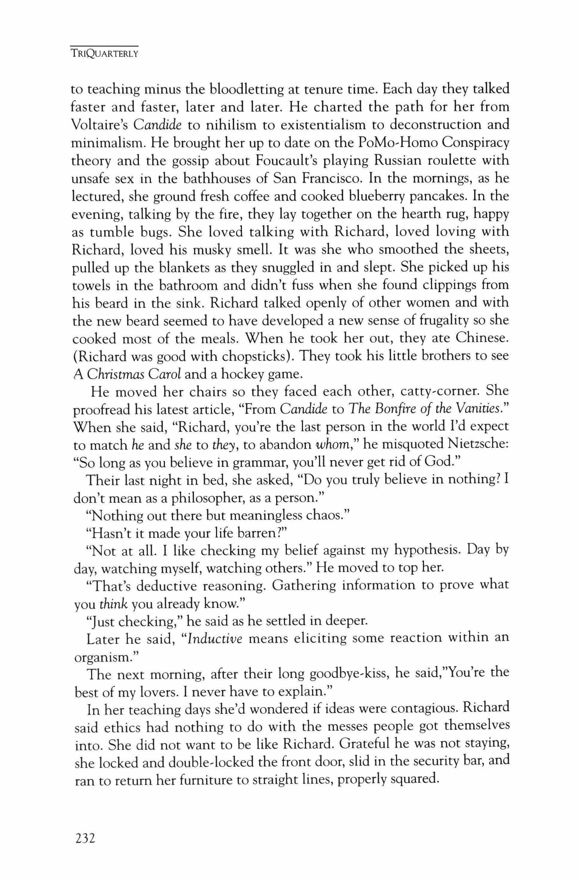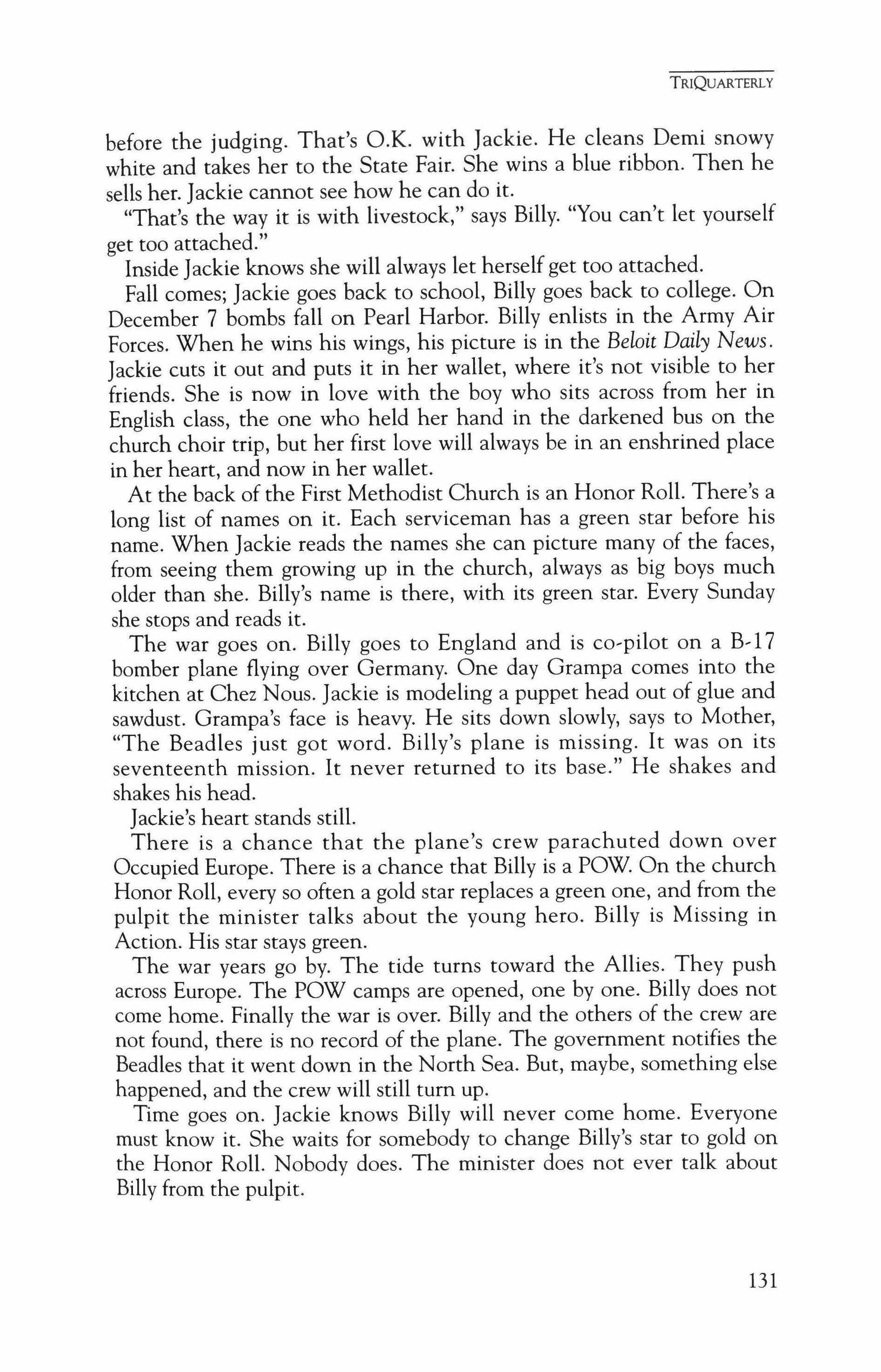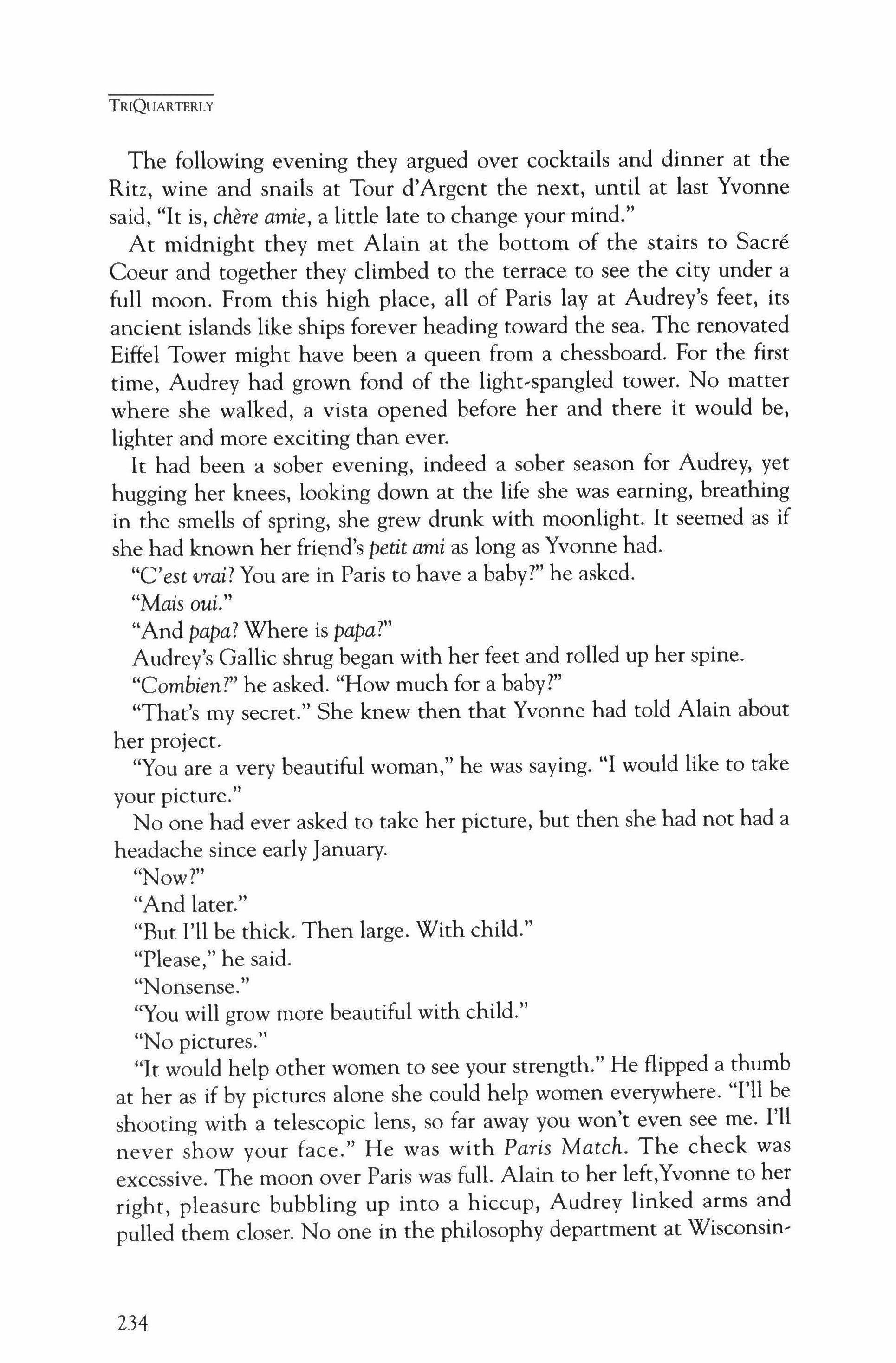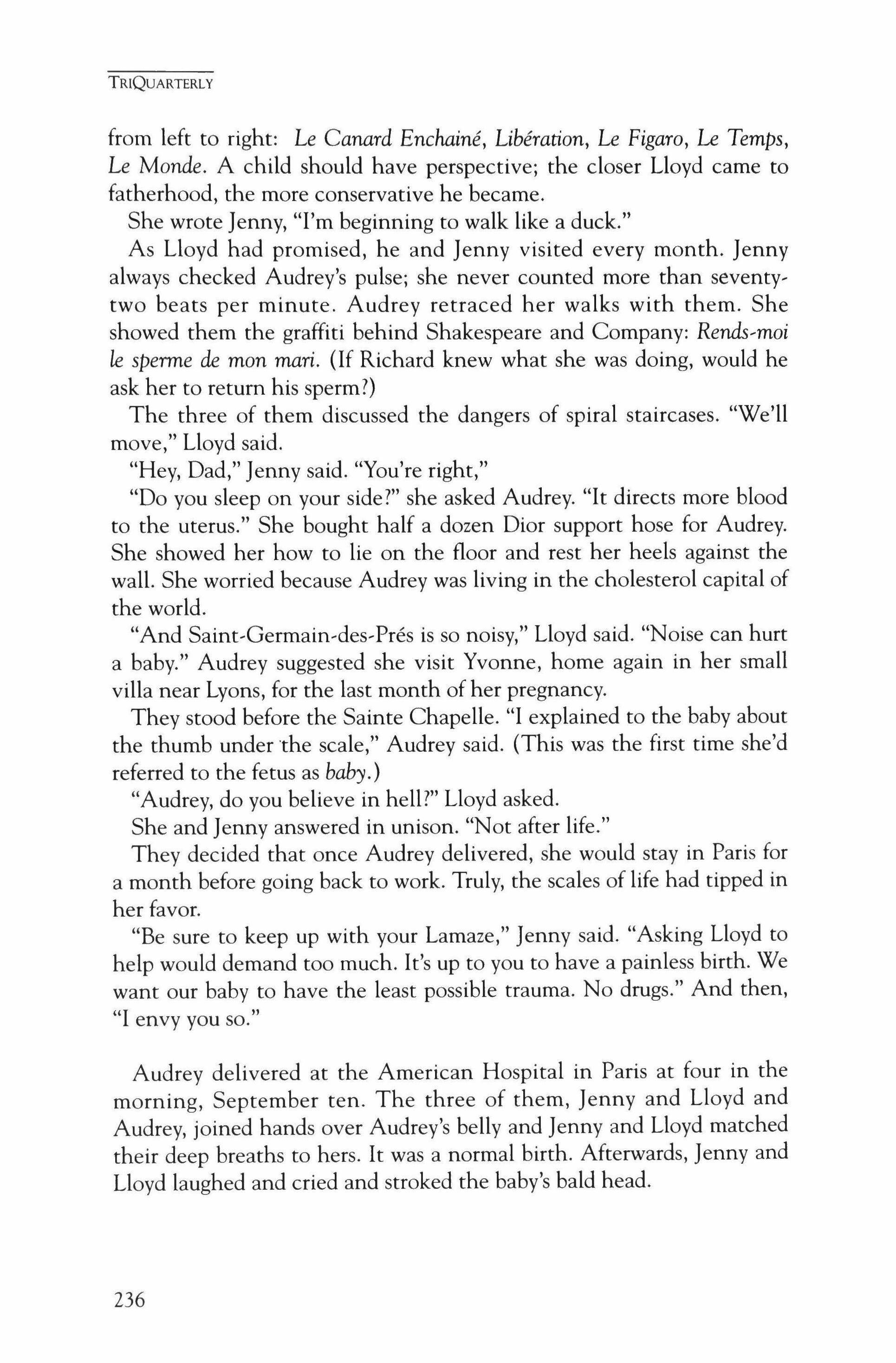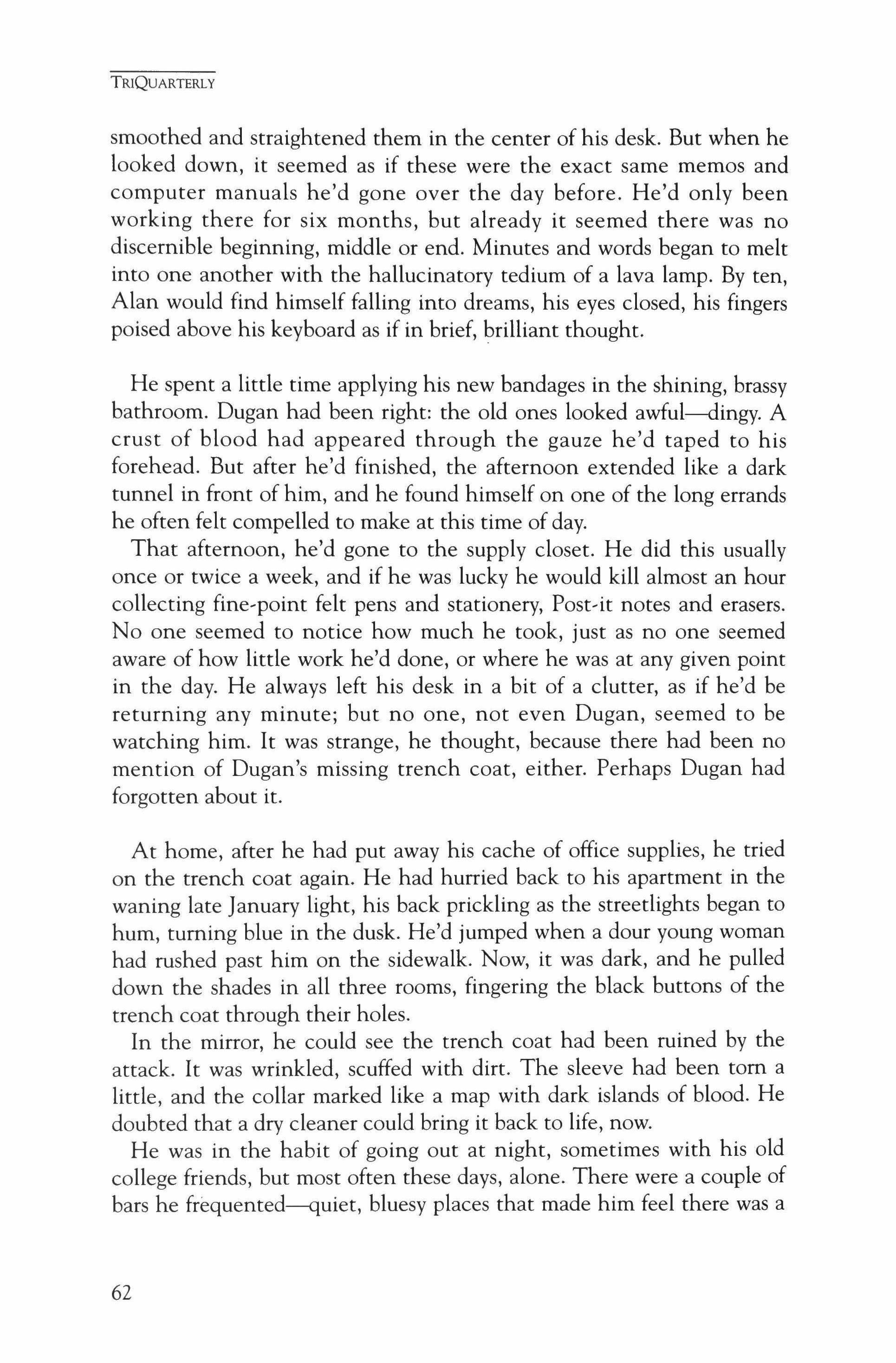 Publication of TriQuarterly is made possible in part by the donors of gifts and grants to the magazine. For their recent and continuing support, we are very pleased to thank the Illinois Arts Council, the Lannan Foundation, the John D. and Catherine T. MacArthur Foundation, the National Endowment for the Arts, the Sara Lee Foundation, the Wendling Foundation, and individual donors. Major new marketing initiatives at TriQuarterly have been made possible by the Lila Wallace,Reader's Digest Literary Publishers Marketing Development Program, funded through a grant to the Council of Literary Magazines and Presses.