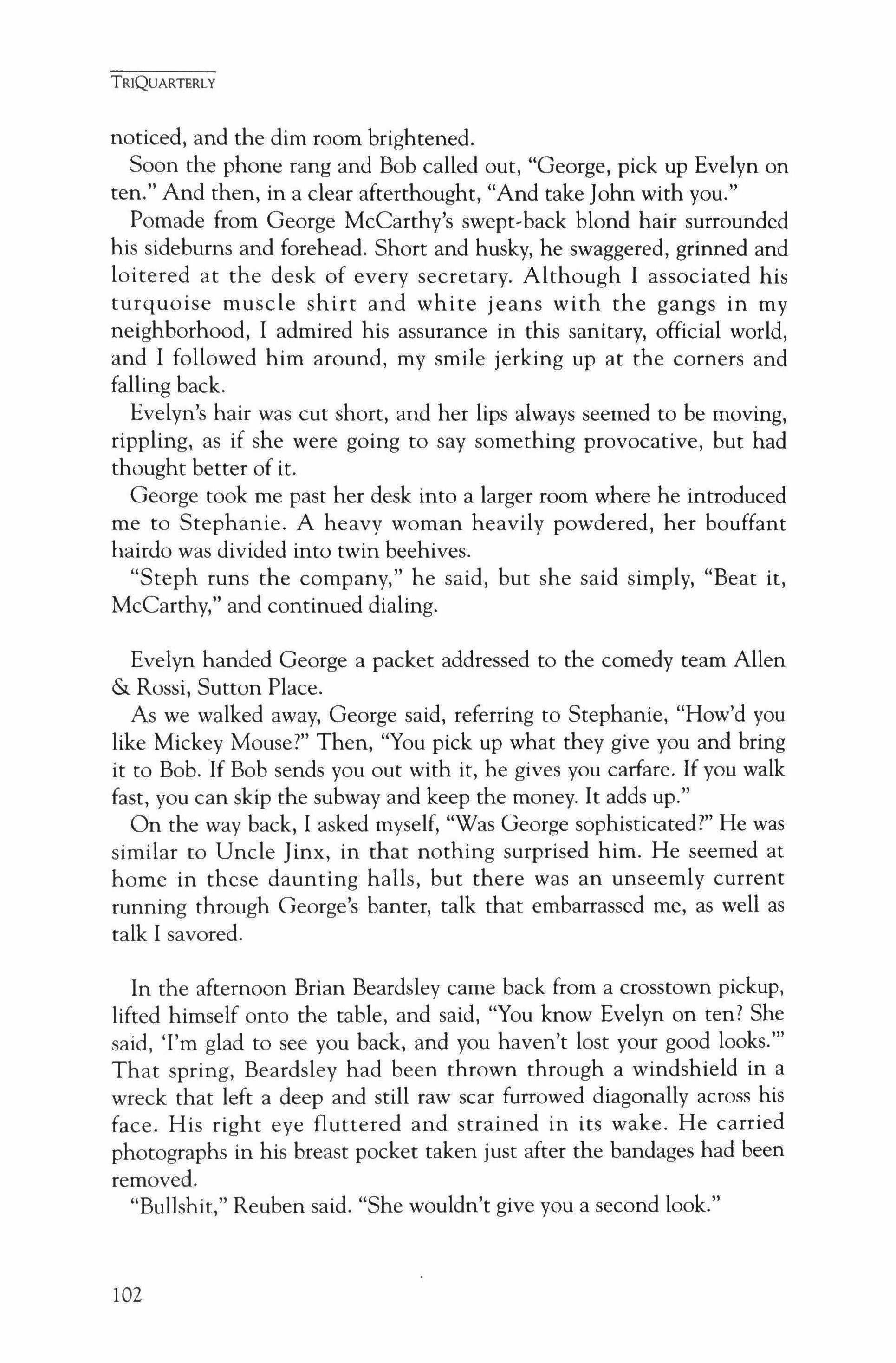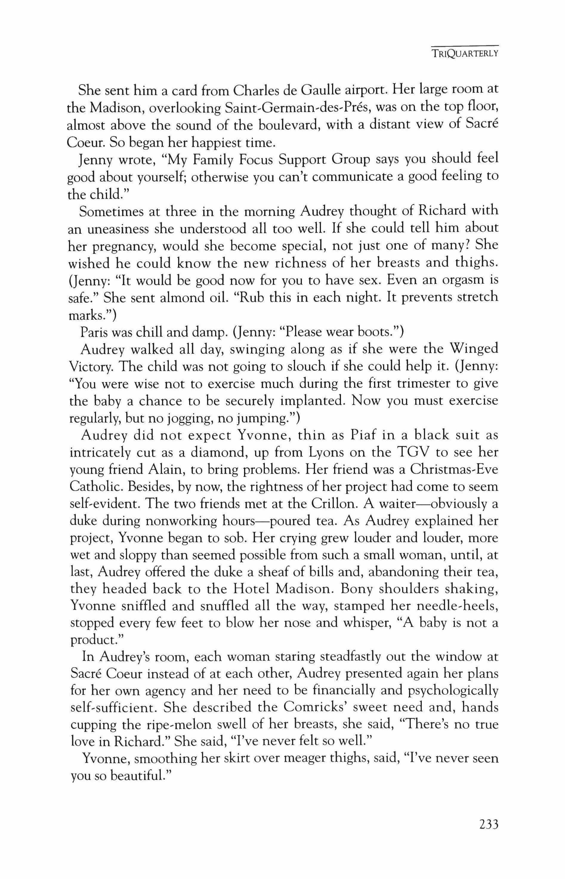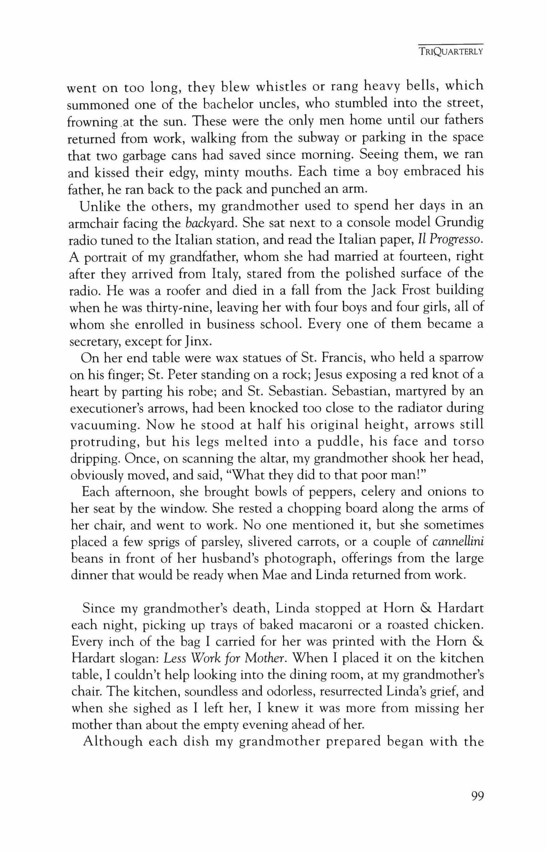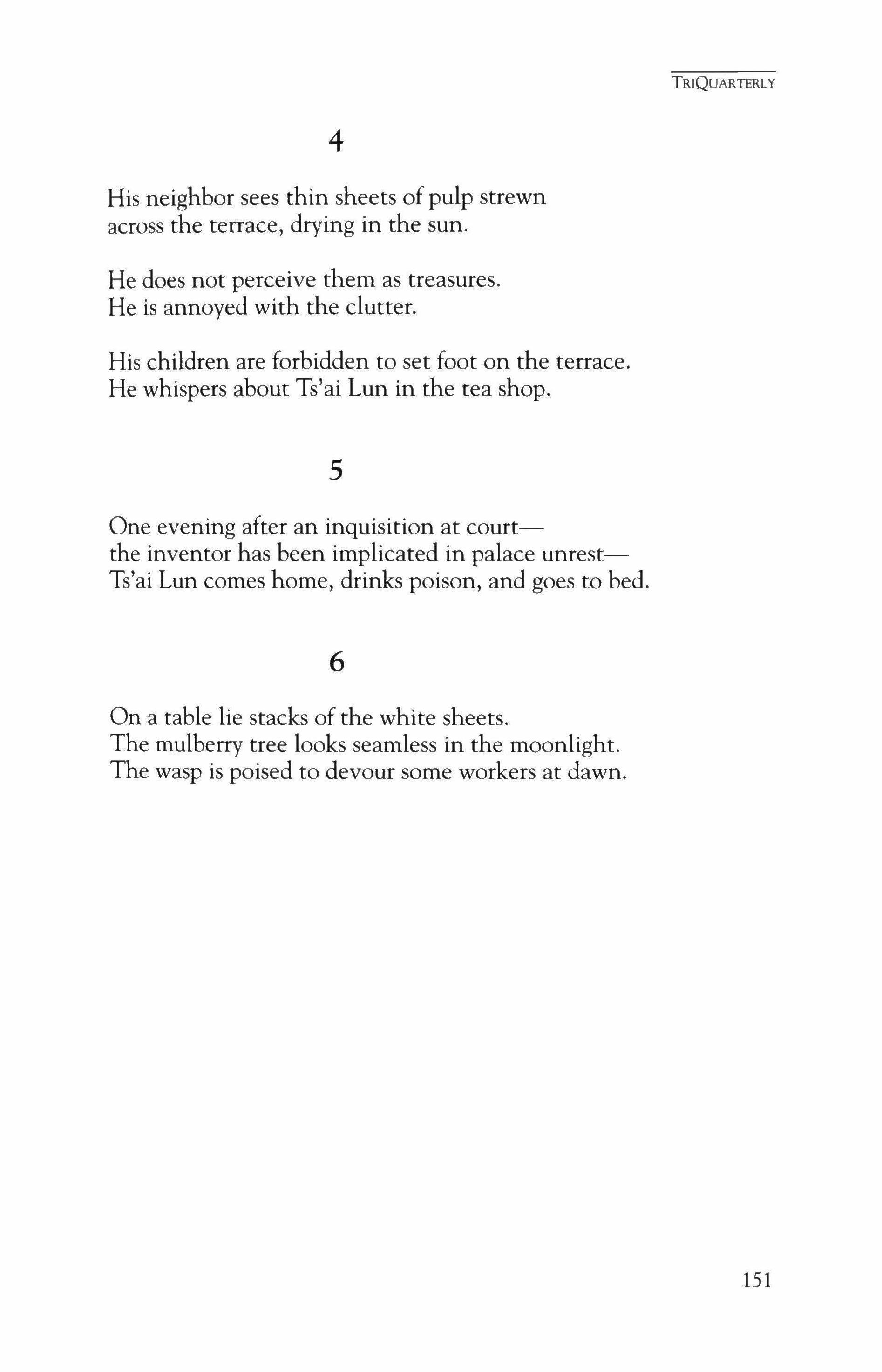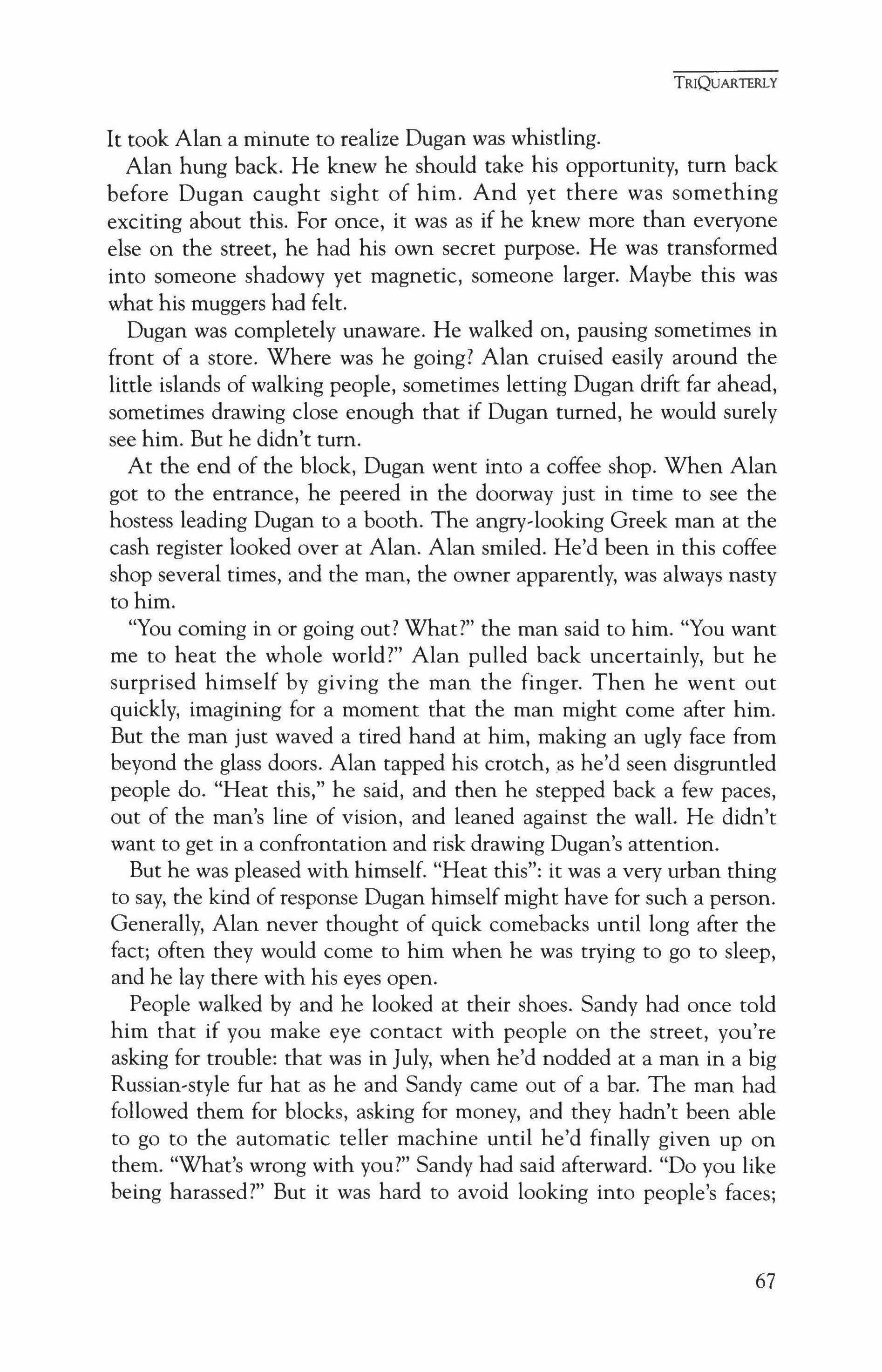 Publication of TriQuarterly is made possible in part by the donors of gifts and grants to the magazine. For their recent and continuing support, we are very pleased to thank the Illinois Arts Council, the Lannan Foundation, the John D. and Catherine T. MacArthur Foundation, the National Endowment for the Arts, the Sara Lee Foundation, the Wendling Foundation, and individual donors. Major new marketing initiatives at TriQuarterly have been made possible by the Lila Wallace,Reader's Digest Literary Publishers Marketing Development Program, funded through a grant to the Council of Literary Magazines and Presses.